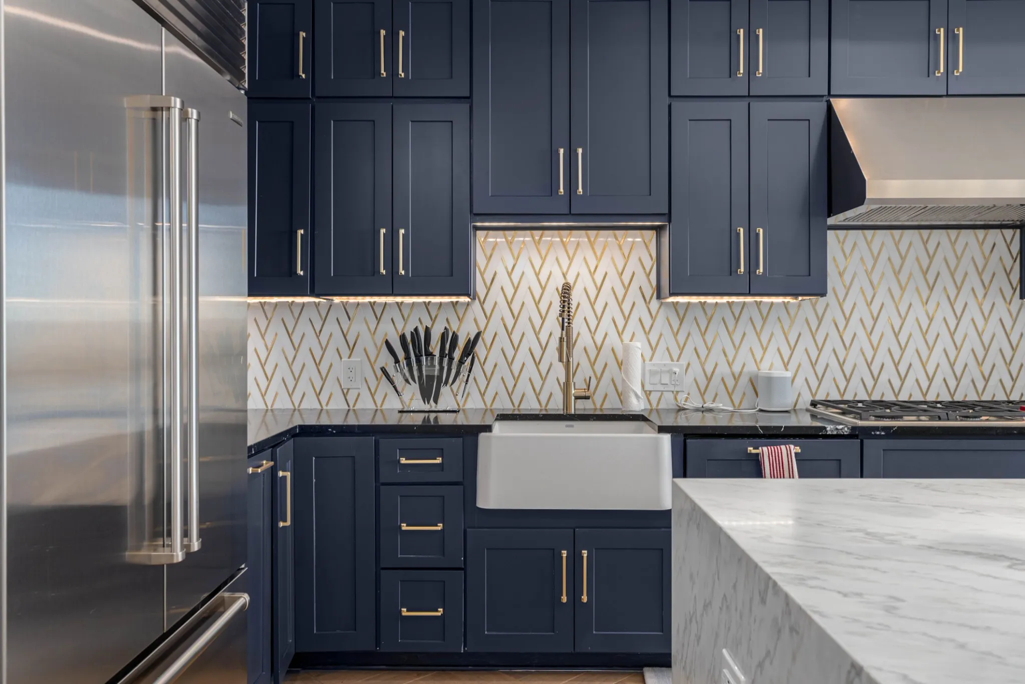 High end finishes include herringbone hardwood floors, waterfall marble island, marble surfaces, Sub Zero and Wolf appliances, and custom cabinetry. Additional upgrades include crown molding, designer wallpaper, smart home features, motorized blinds, LED window lighting, and window tint film. Two parking spaces with EV charger.