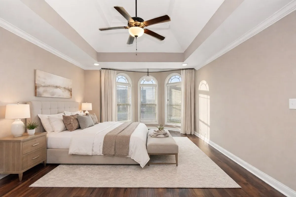 The main-level primary suite includes a tray ceiling, sitting area, dual walk-in closets, and separate vanities. A secondary bedroom on the main level provides flexibility for guests, office space, or multi-generational living.