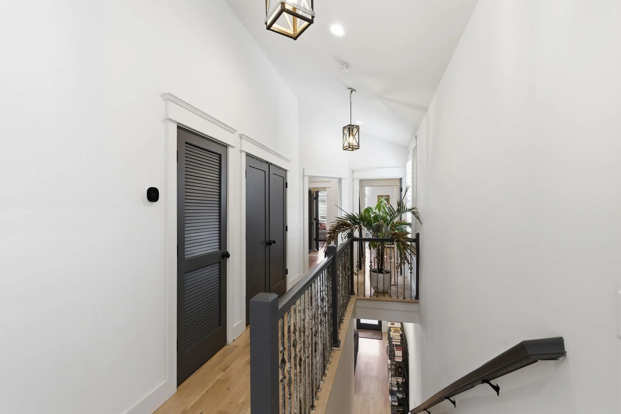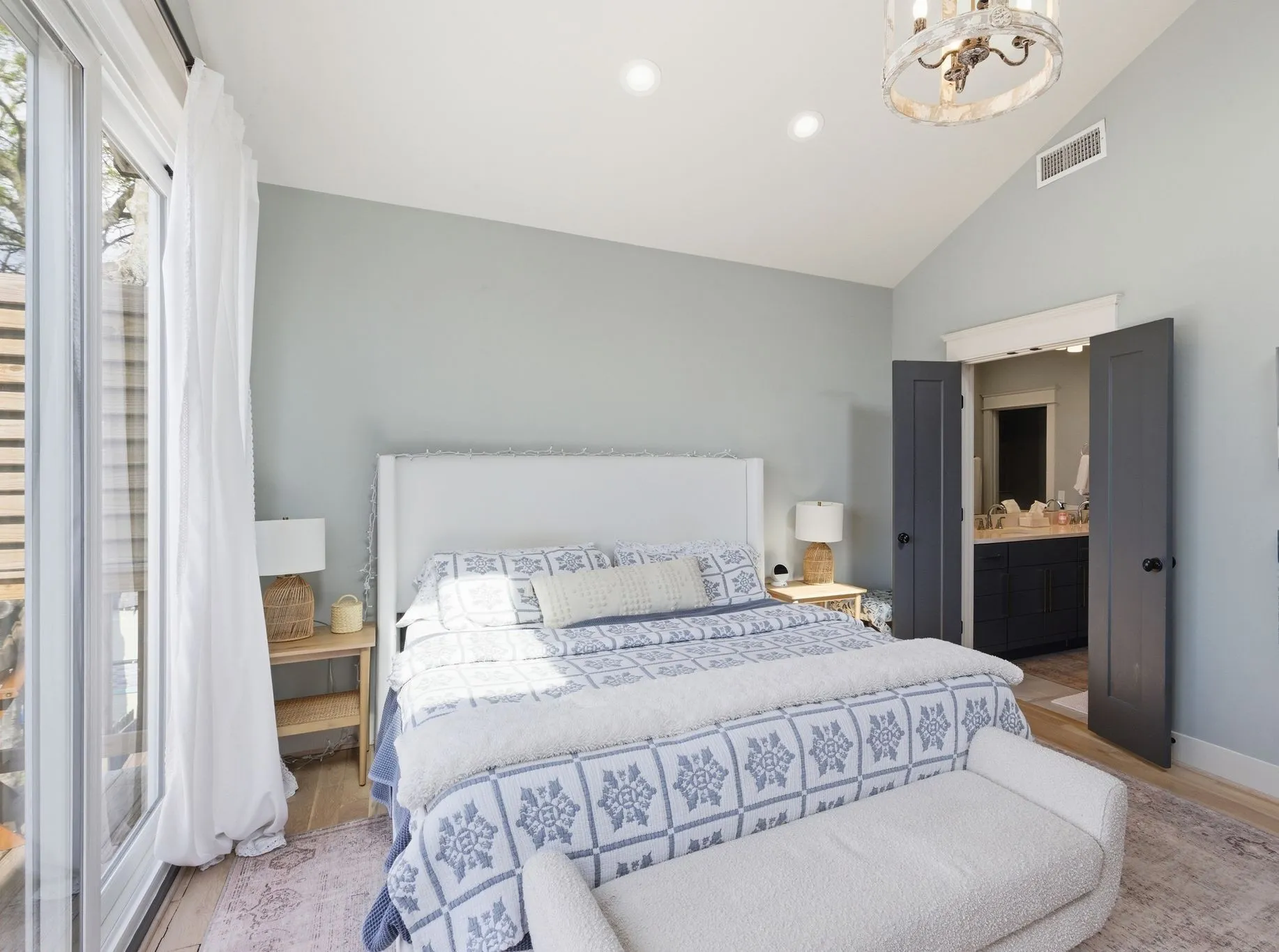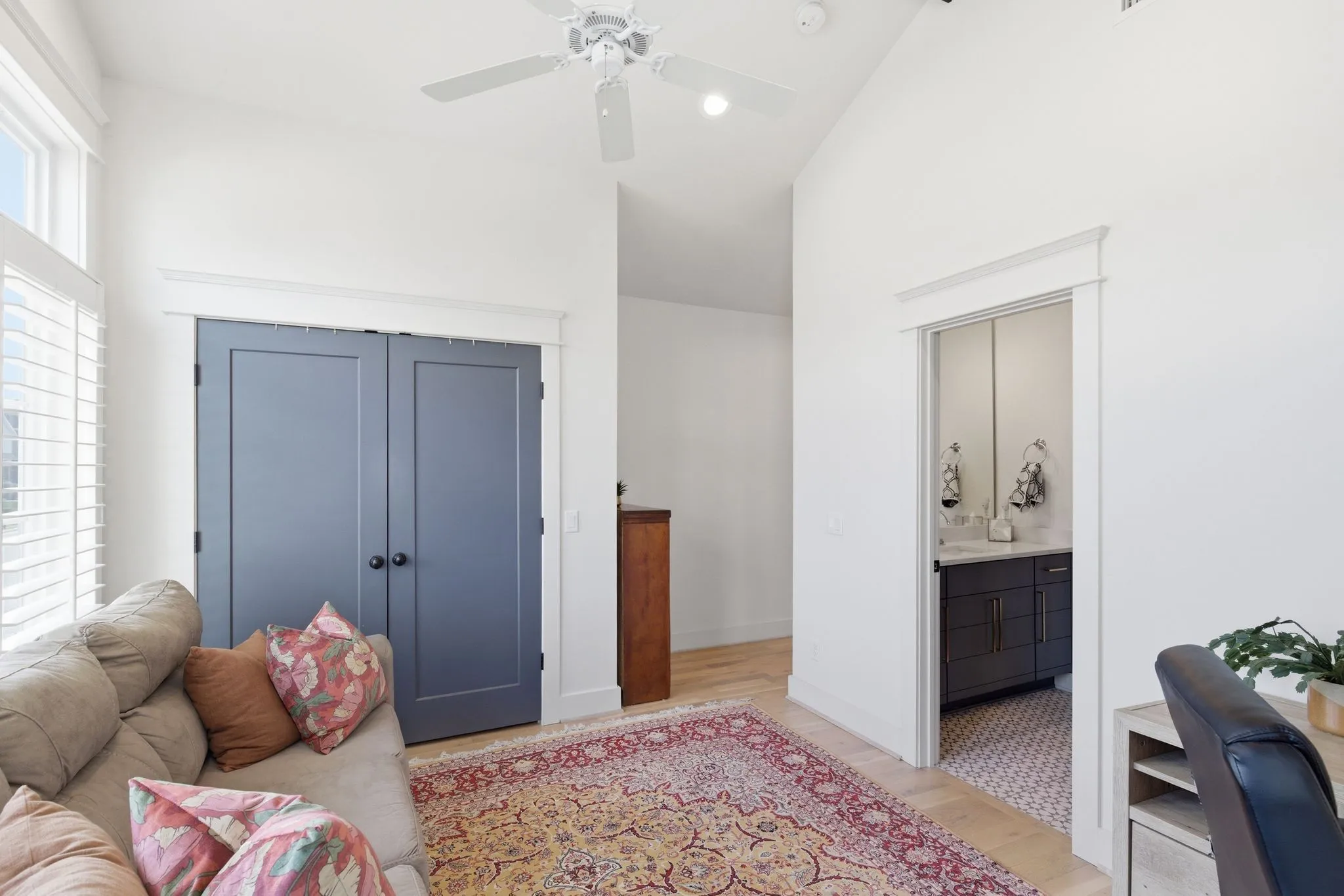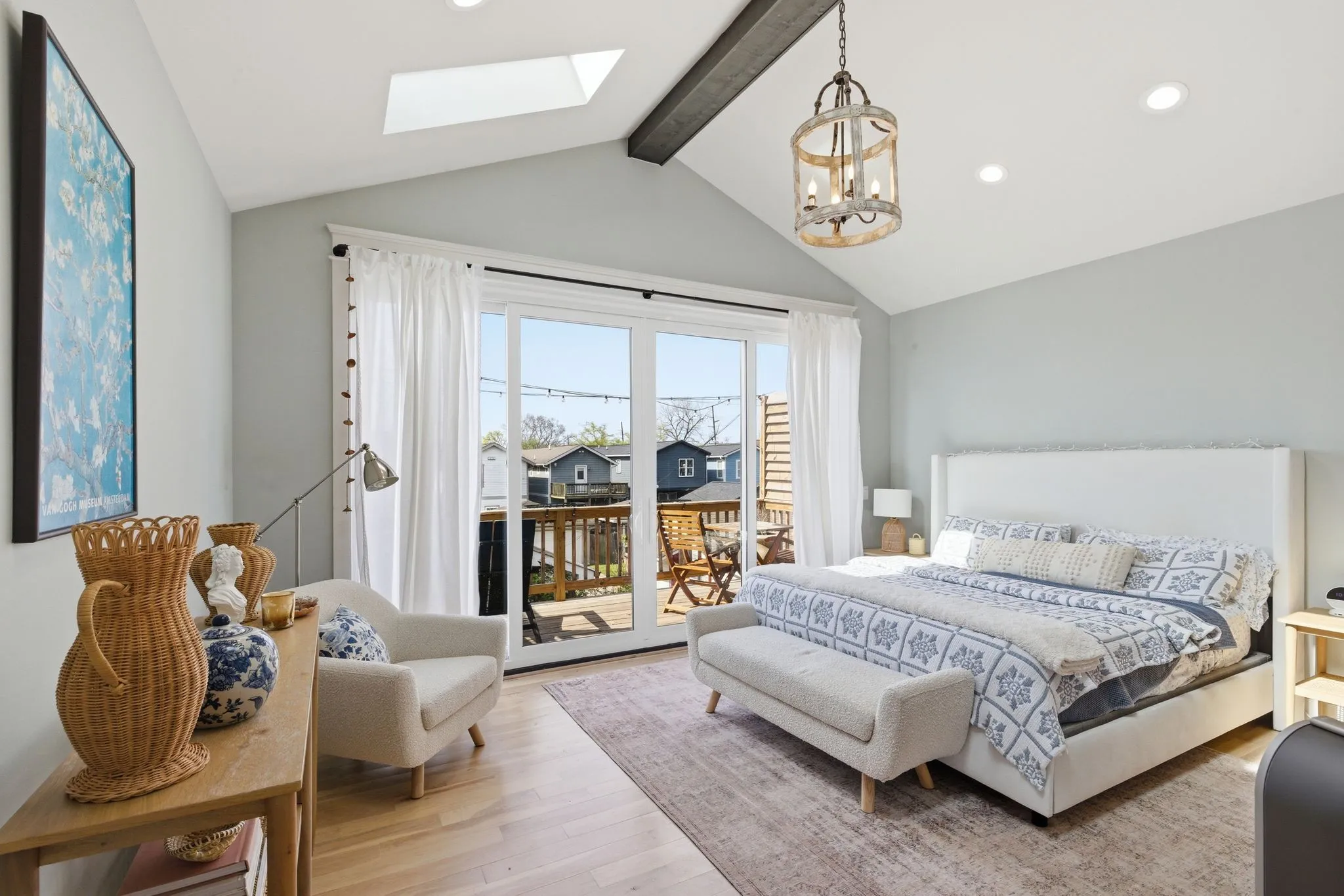 Upstairs, the vaulted primary suite offers a true retreat with a skylight and full sliding doors that open to a spacious balcony. The ensuite bath includes dual vanities, a beautifully tiled walk-in shower, and a spacious walk-in closet with custom built-ins. The other two upstairs bedrooms share a jack-and-jill bath and custom closets. The 3rd BR has vaulted ceilings and makes a great extra office space or guest bedroom. The laundry room is also conveniently located on the 2nd level – washer & dryer are included.