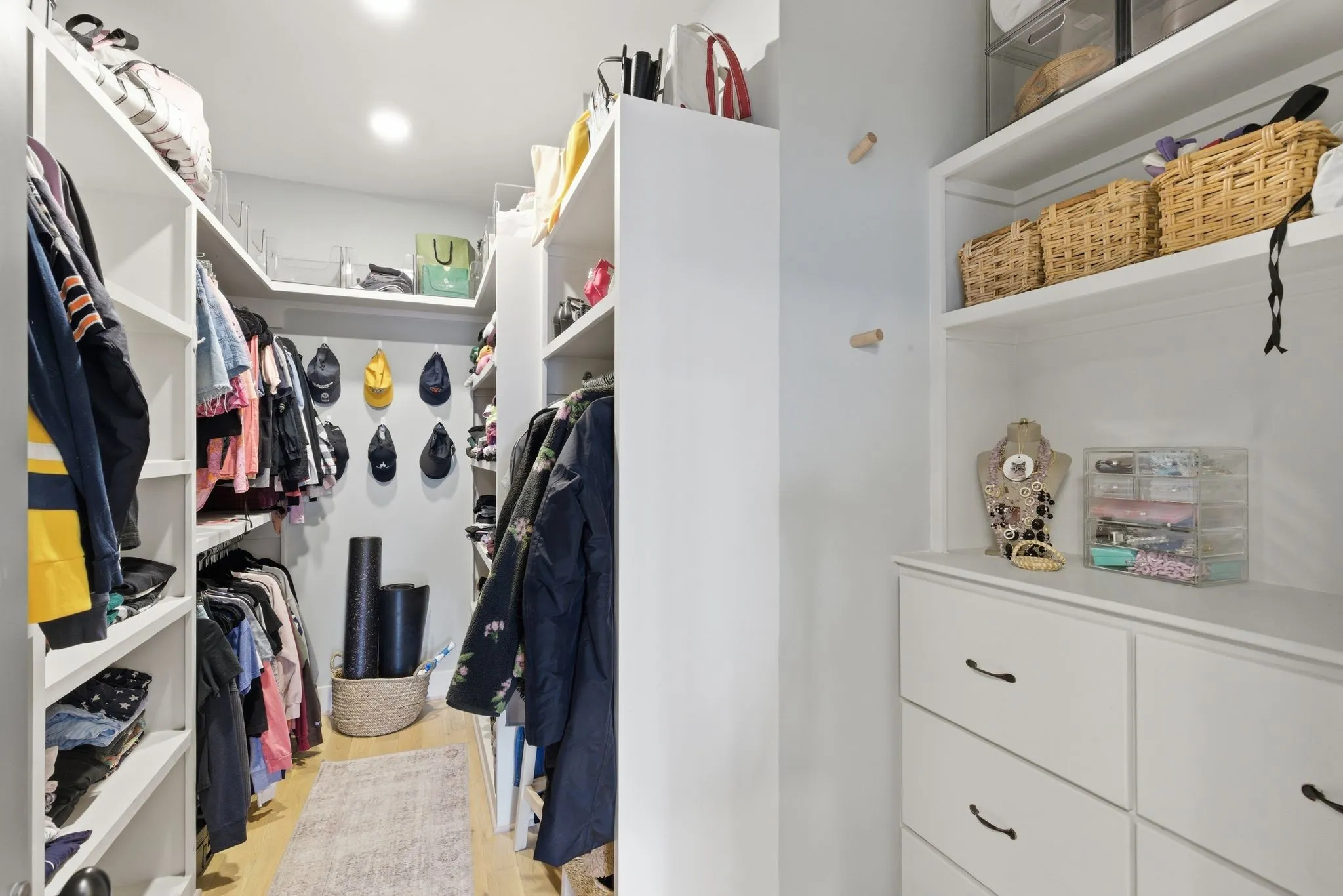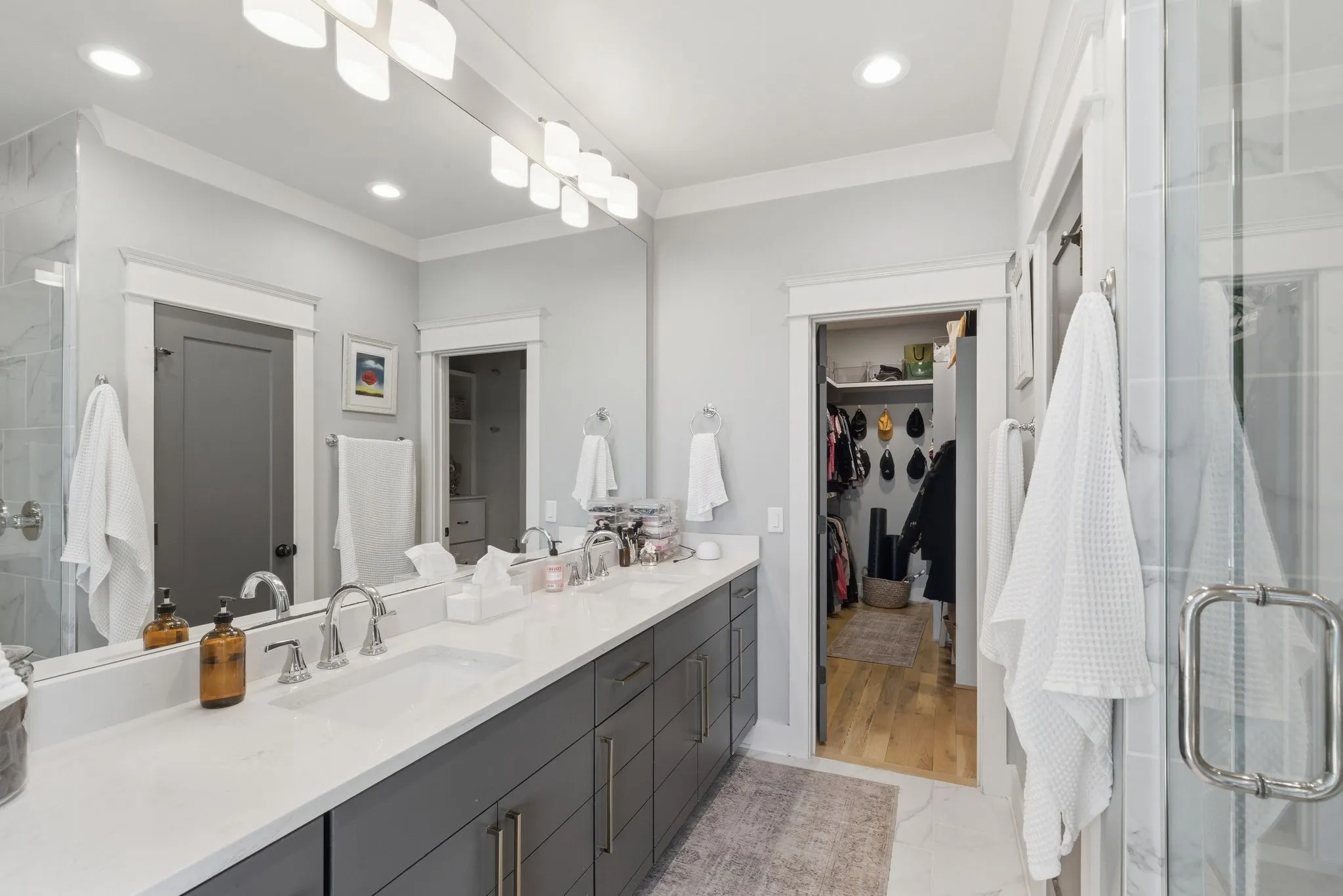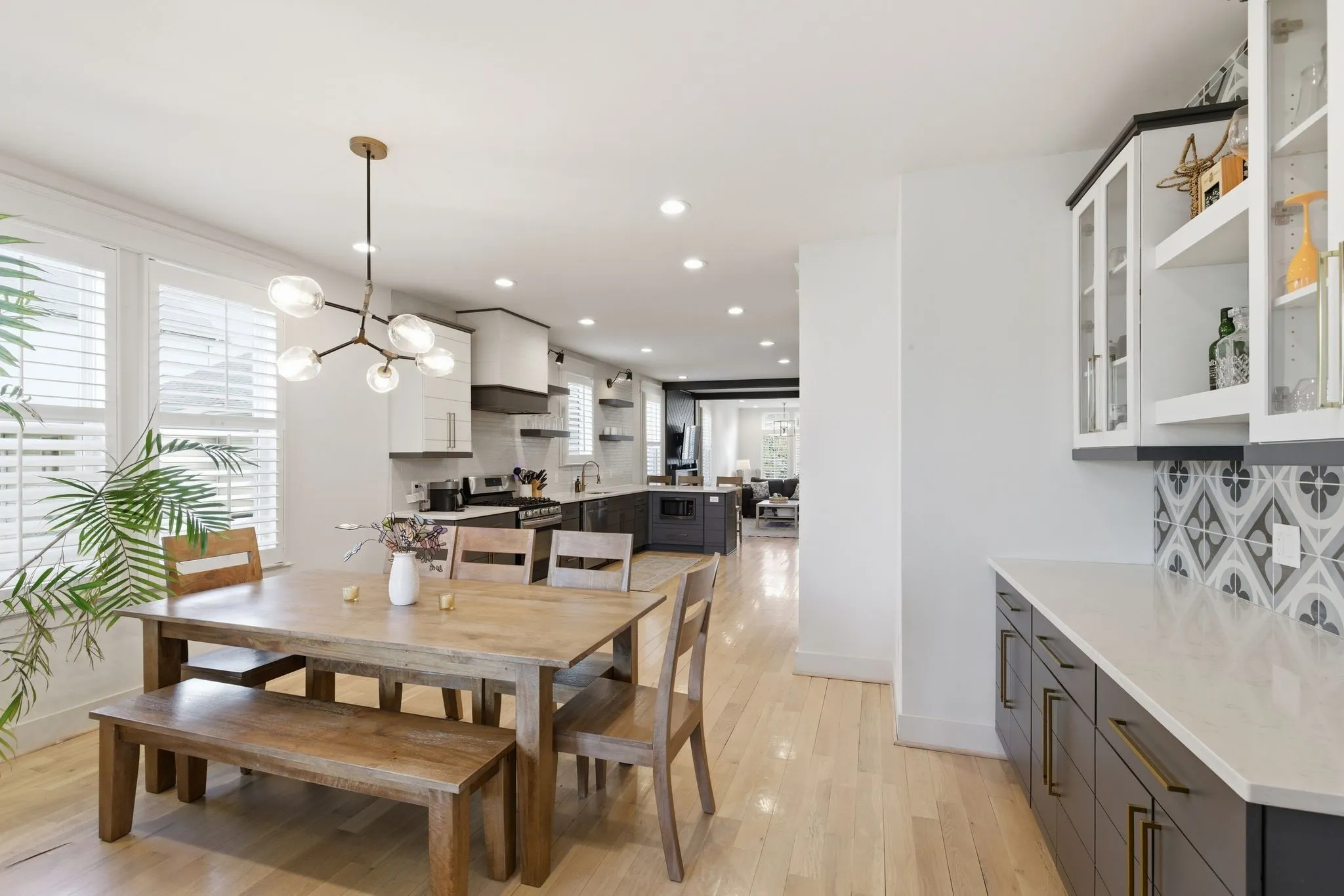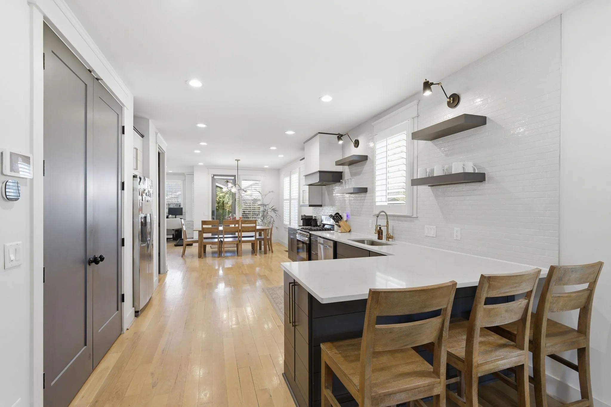 The kitchen features quartz countertops, custom cabinetry, designer hardware, and a stylish eat-at counter that flows seamlessly into the dining and living areas—perfect for entertaining or relaxed daily living. The huge pantry offers extra storage under the stairs. The dining room has a custom wet-bar/coffee bar area and a built-in desk for a home office.