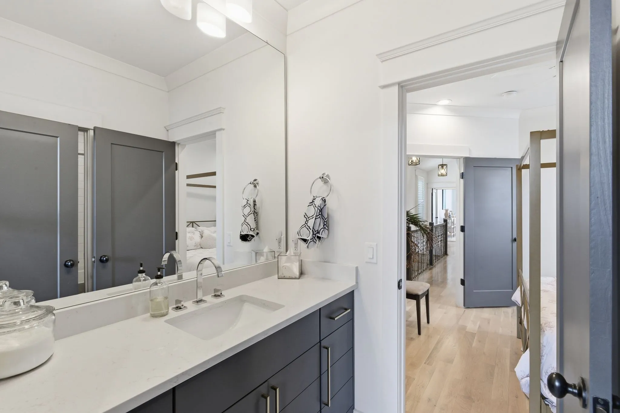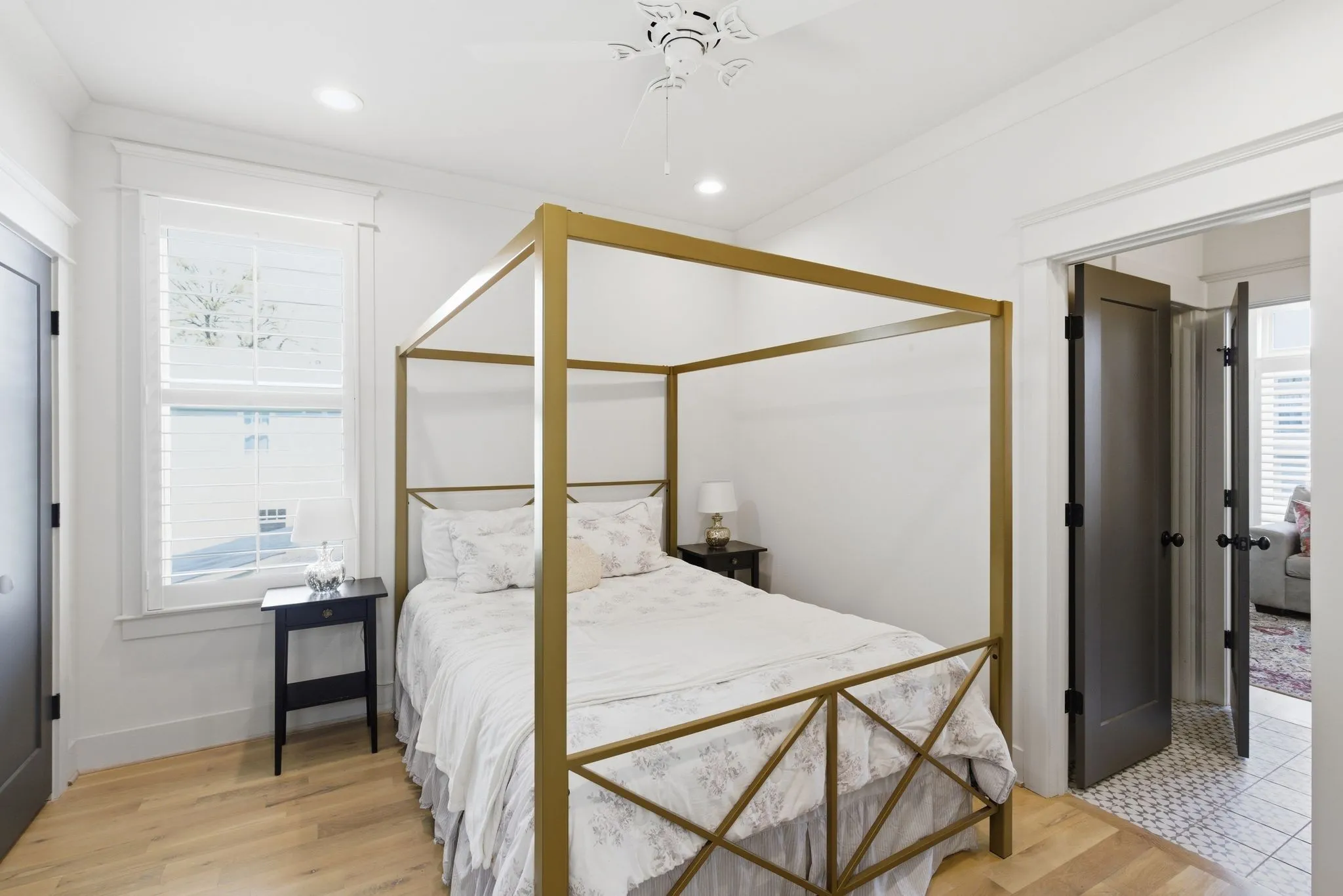 Step into a home where clean design meets everyday comfort in the heart of The Nations. Wide-plank hardwood floors, custom builder trim, and plantation shutters set the tone, while natural light fills every space. The Living Room features a cozy reading nook space, and a designer wall surrounding the gas fireplace.