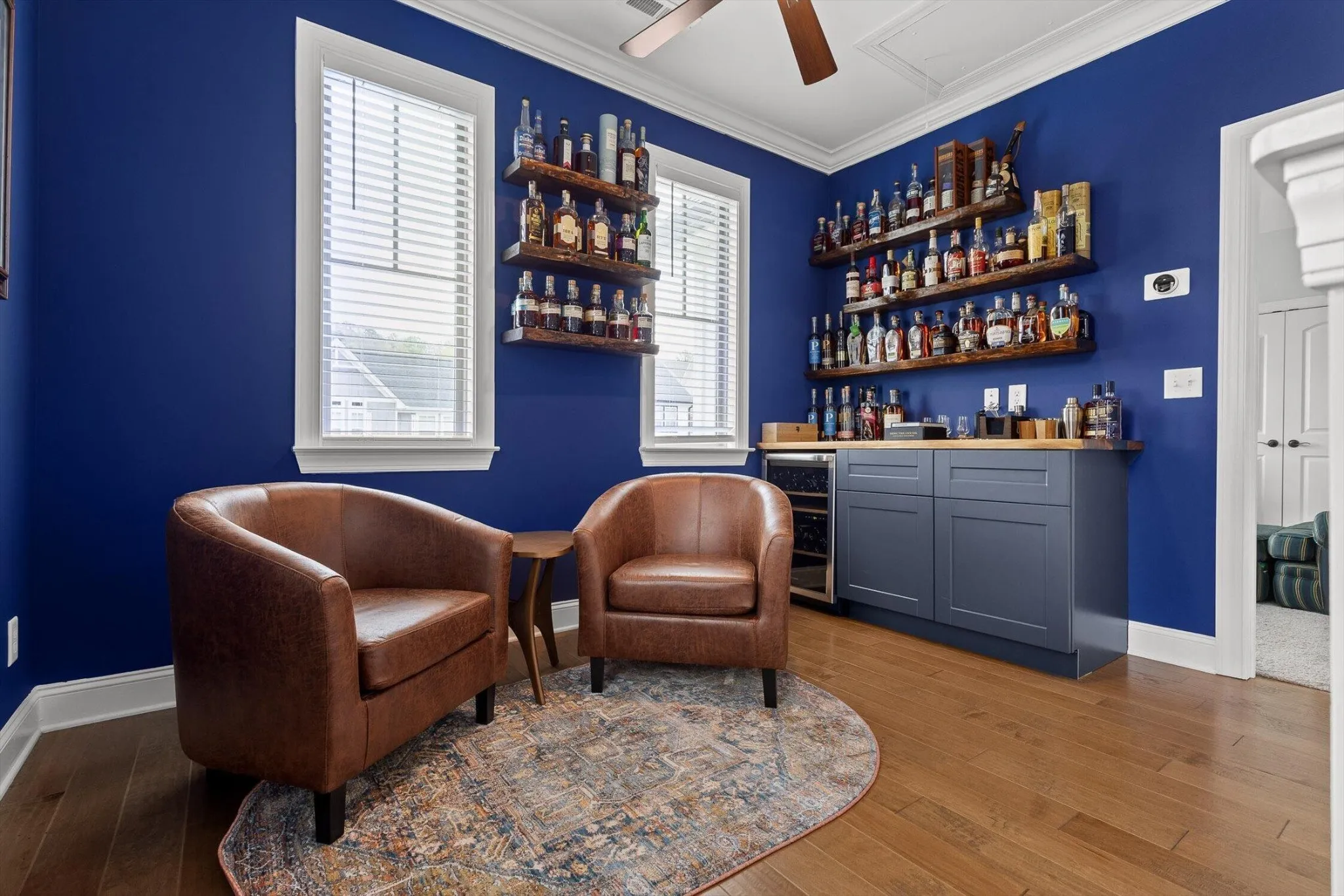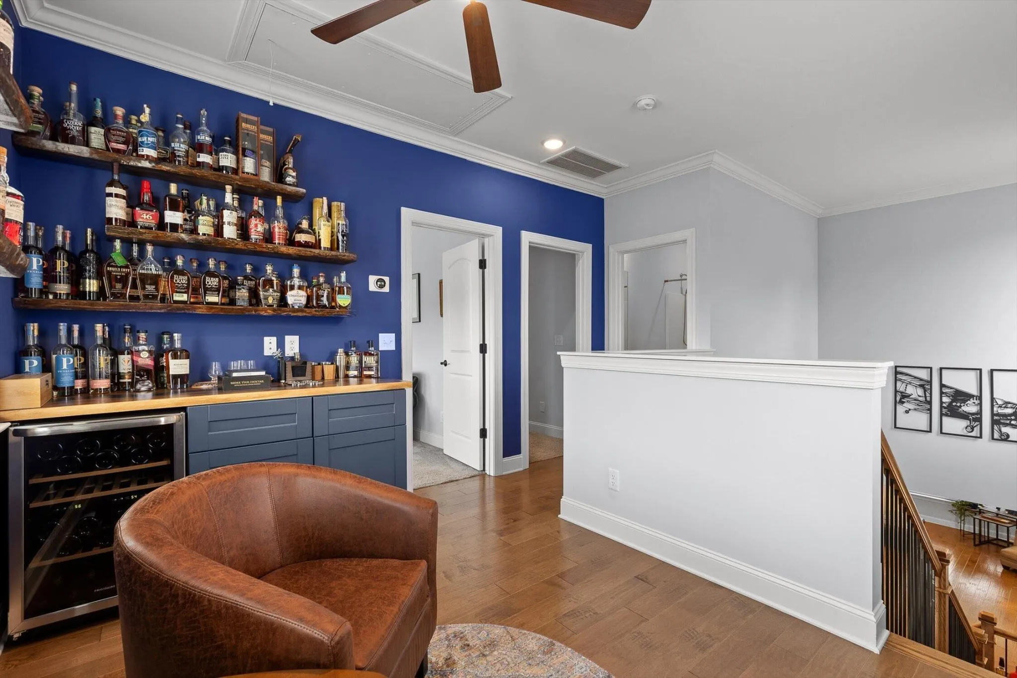 Upstairs, a versatile flex space with built-in shelving provides the perfect setting for a home office or lounge. Two additional bedrooms, one with expansive floored walk-in attic storage, share a full hall bath.