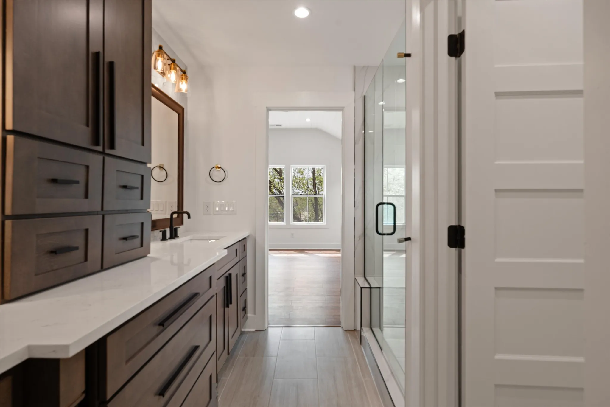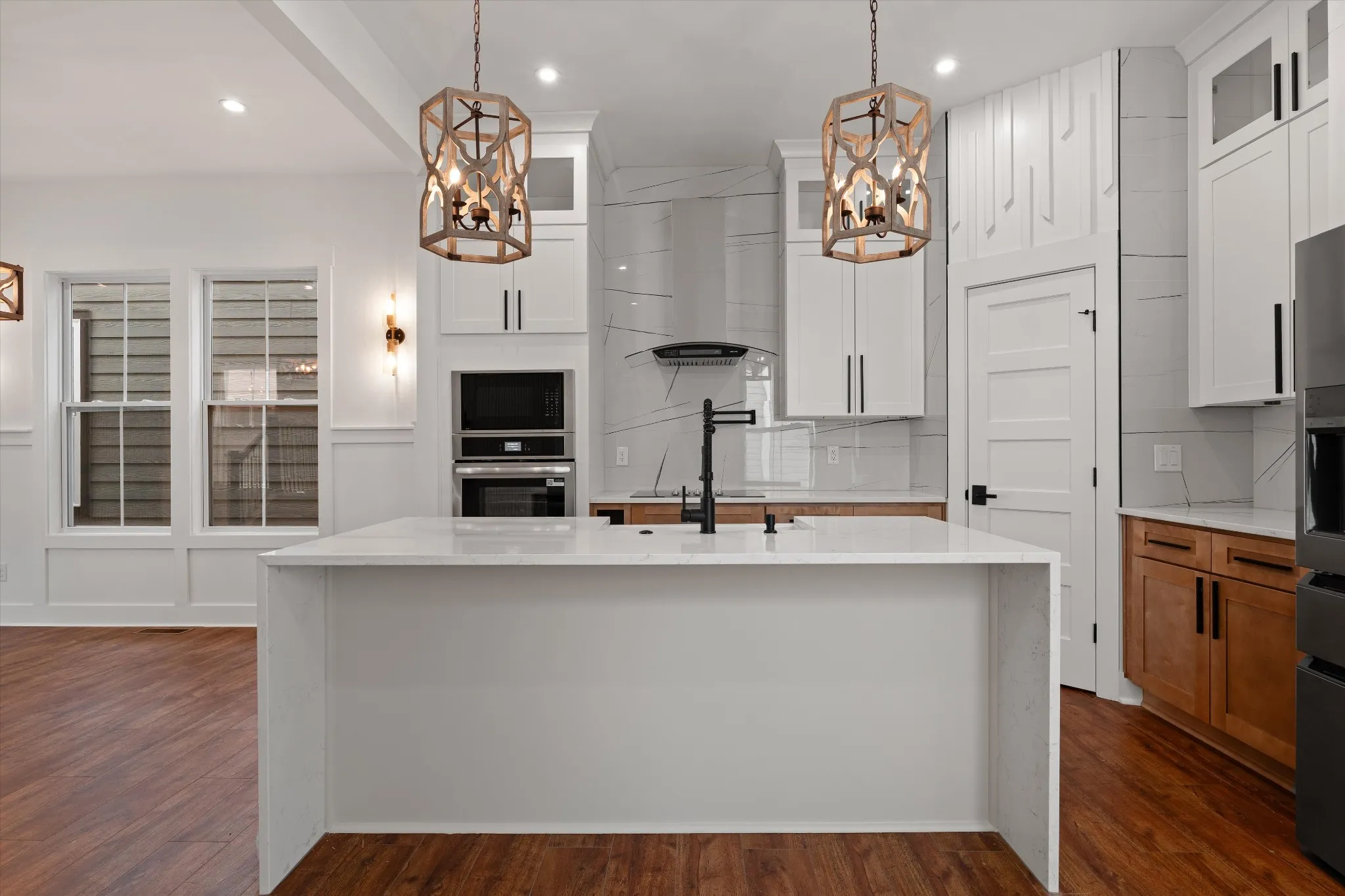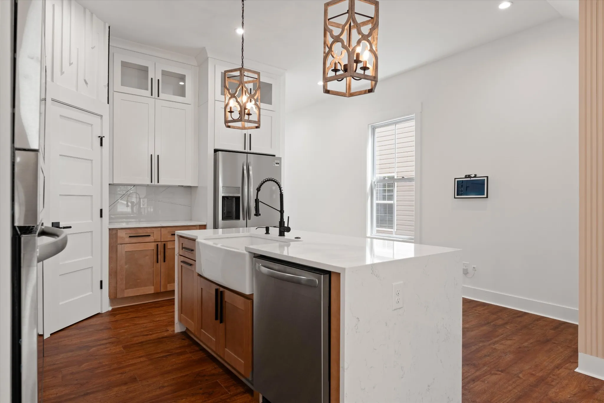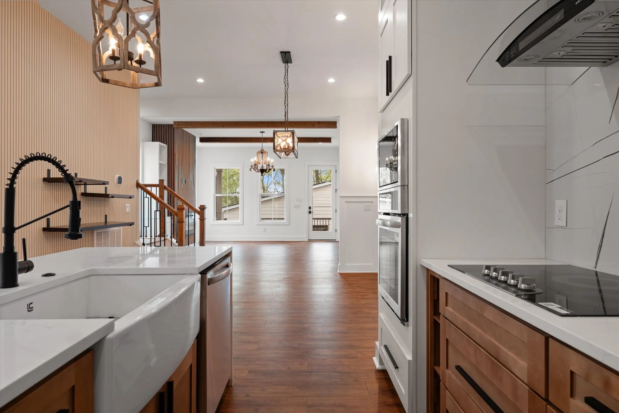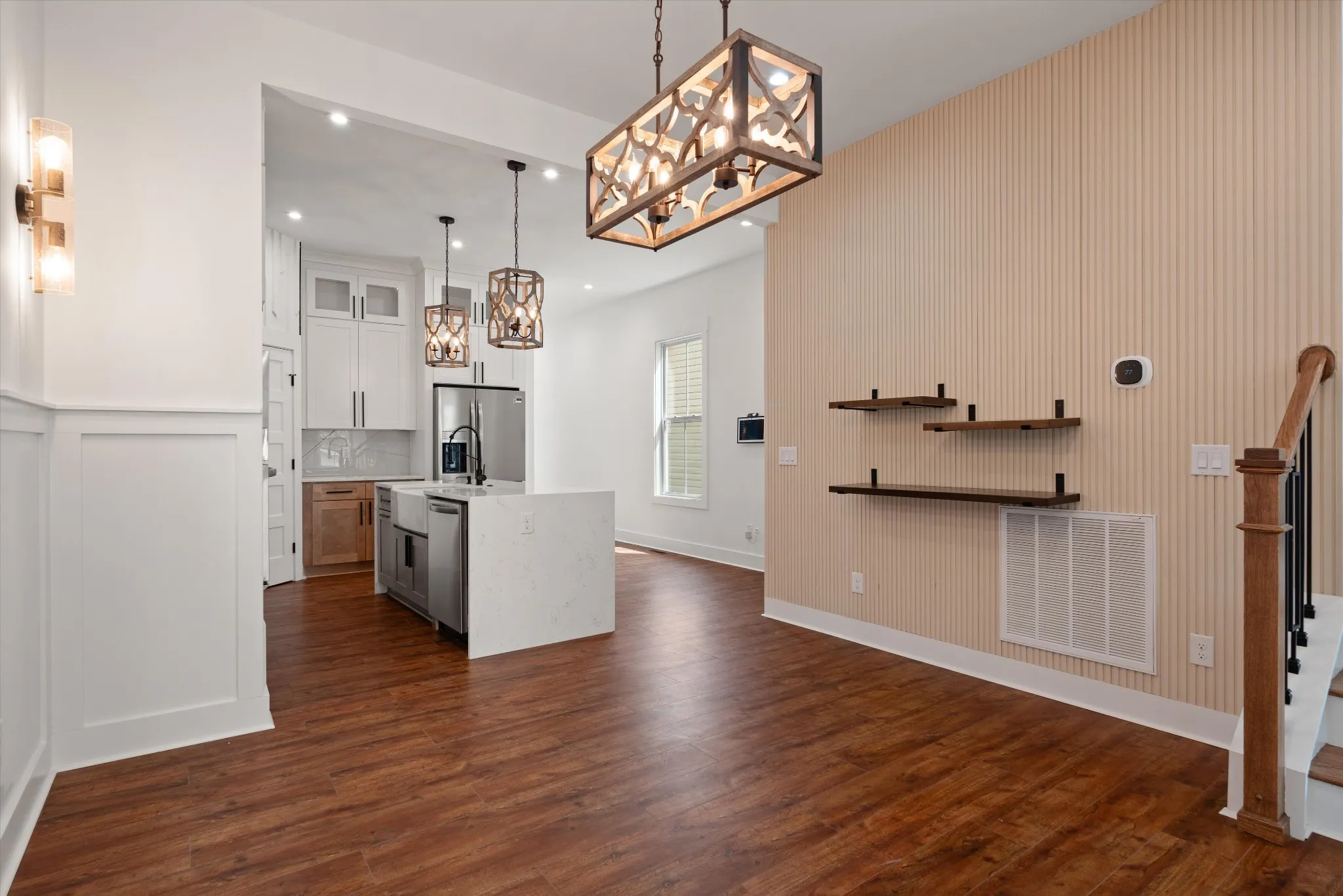 Stunning new construction located just minutes from Downtown Nashville! This thoughtfully designed home offers 4 bedrooms and 3 full baths with soaring ceilings on the main level. The custom chef’s kitchen features ceiling‑height cabinetry, quartz countertops, premium fixtures, an over‑the‑cooktop pot filler, all stainless steel appliances, and an Amazon Echo smart display serving as the hub for the home’s smart technology. The main‑level bedroom provides flexibility as a guest suite or home office. Upstairs includes three spacious bedrooms, highlighted by a luxurious primary suite with a vaulted wood ceiling, a large custom bathroom, and a high‑end designed walk‑in closet. Bathrooms are finished with quality ceramic tile, modern fixtures, and refined details throughout. Smart‑home upgrades include a Ring front camera and a programmable thermostat, all seamlessly connected through the Amazon Echo system. The exterior is accented with elegant stone detailing and features a spacious rear porch with a tall, wood‑covered ceiling—perfect for outdoor entertaining. A detached two‑car garage with rear alley access completes this exceptional property, offering high‑end finishes, modern convenience, and an unbeatable location.
