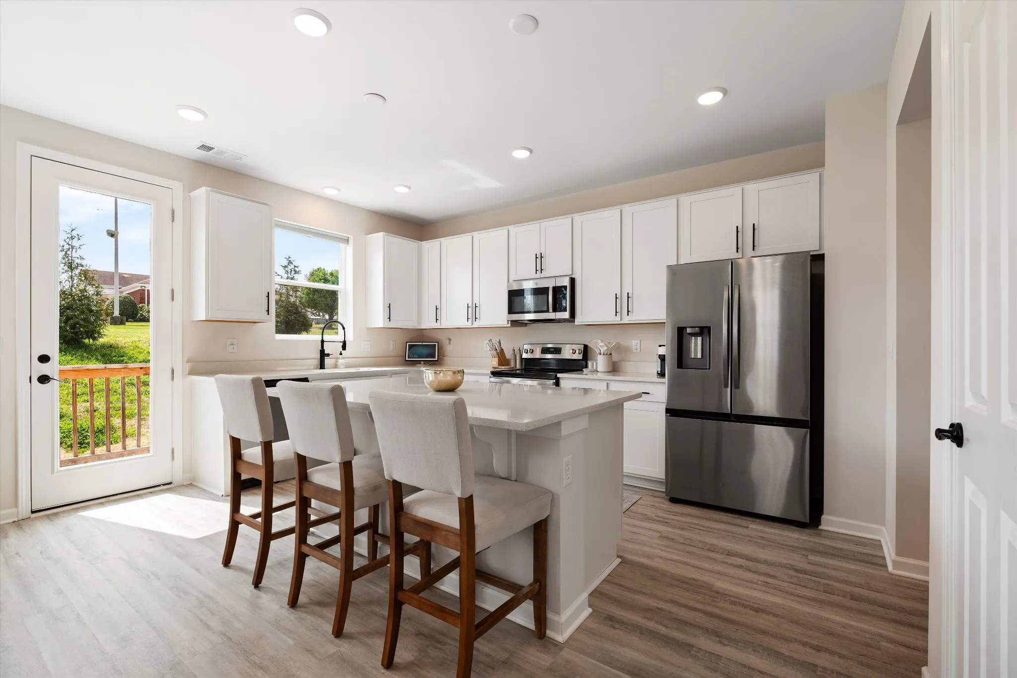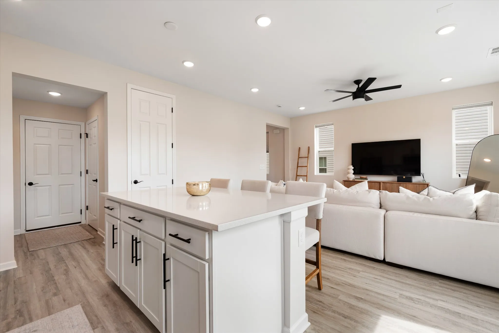 Welcome to 103 Timber Crest Trl — a stylish newer construction home offering bright open-concept living and everyday comfort in White Bluff. The main level features a spacious living area filled with natural light that flows seamlessly into a beautiful modern kitchen with upgraded white cabinetry and a quartz countertop package carried throughout the home. The kitchen is also equipped with stainless steel appliances, generous counter space, and an island with bar seating, perfect for both everyday use and gathering.