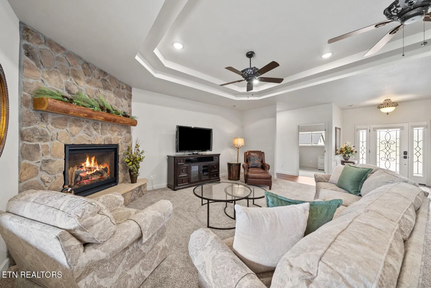 Inside, the main living area is anchored by a vented gas log fireplace and enhanced with tubular skylights that bring consistent natural light into the space. The layout flows directly into the kitchen and dining area.