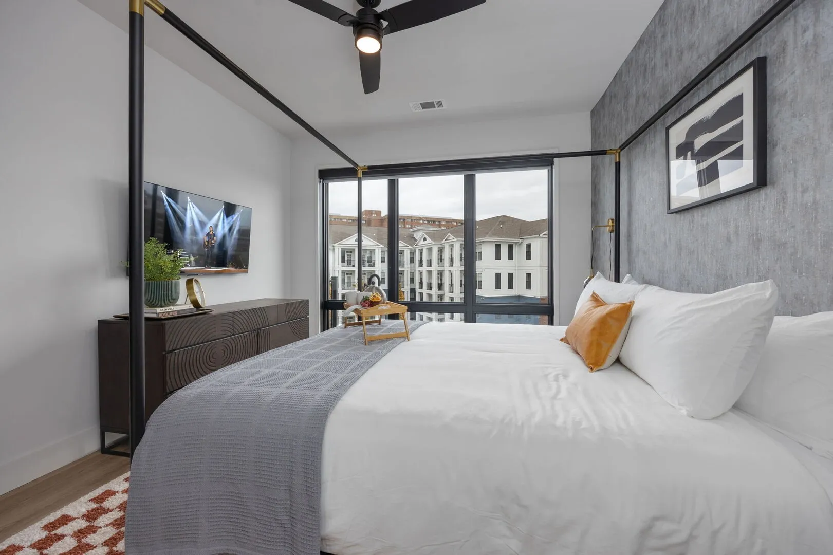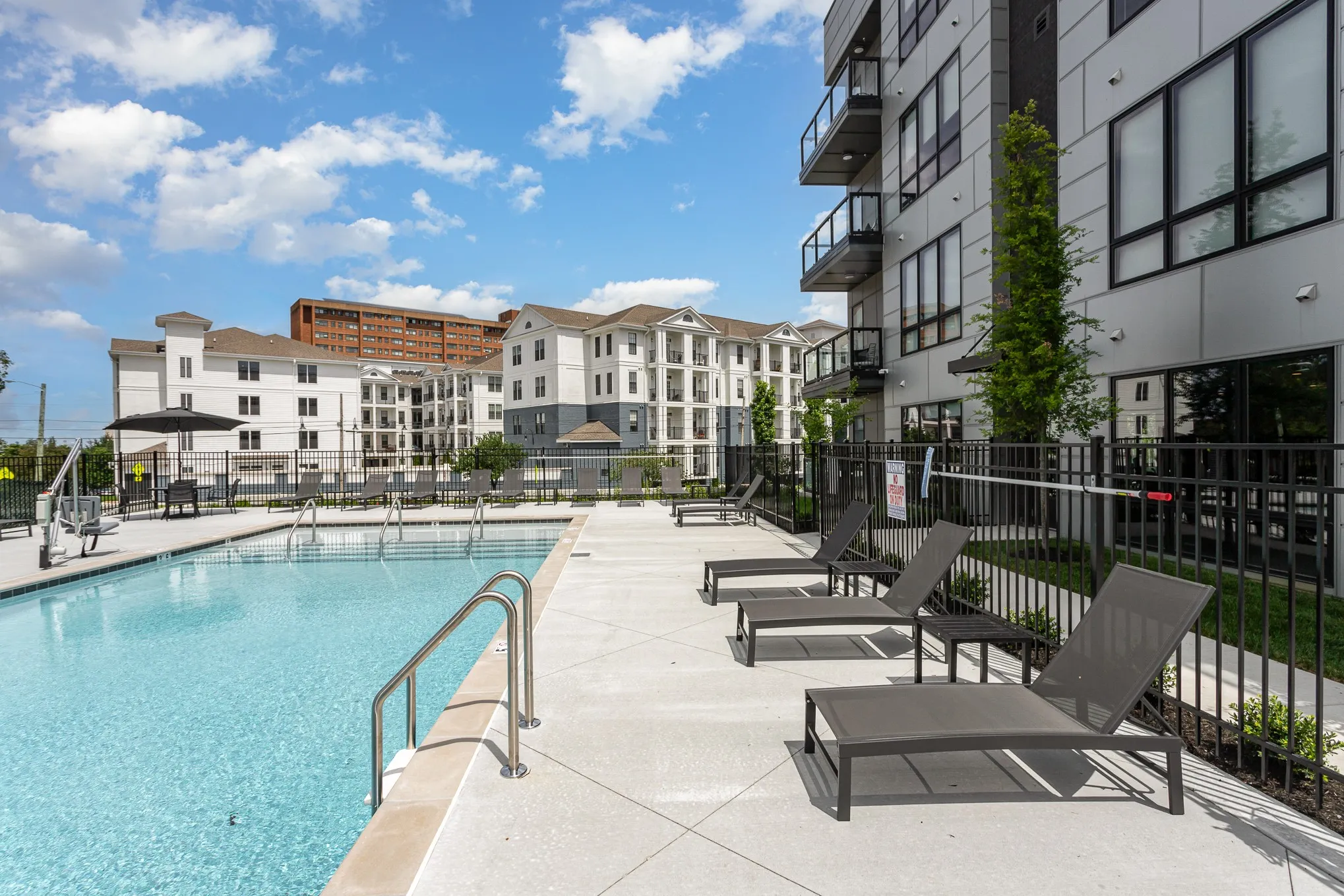 Building amenities include a resort-style pool with lounge seating, BBQ grill, and fire pit, a state-of-the-art fitness center, and rooftop gathering areas with skyline views. Secure garage parking and elevator access add to the ease of living.