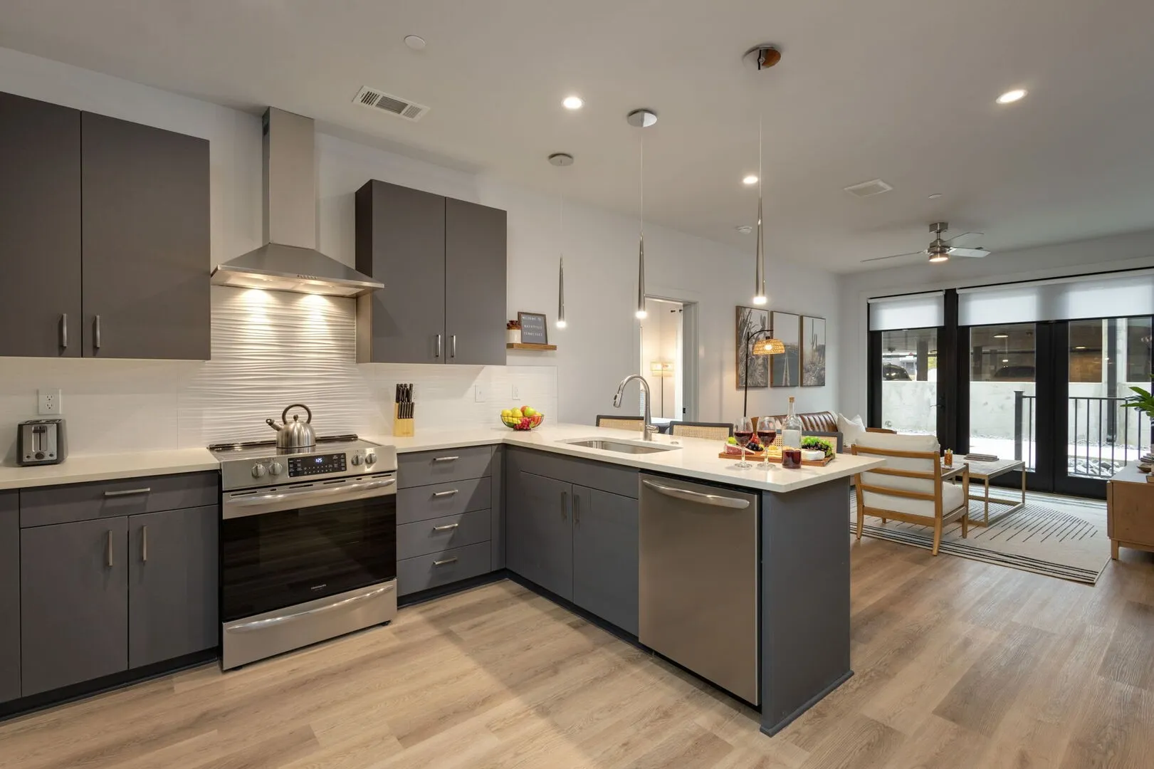 Inside, open-concept living areas feature floor-to-ceiling windows, abundant natural light, and private balconies that extend the living space outdoors. Kitchens are outfitted with stainless steel appliances, contemporary cabinetry, and bar seating, while adjoining living and dining areas create a comfortable space for both everyday living and entertaining.