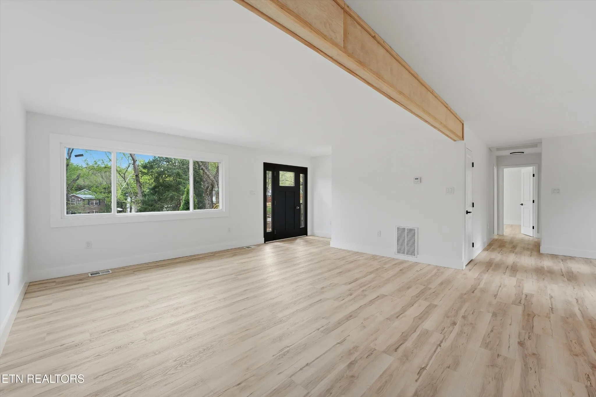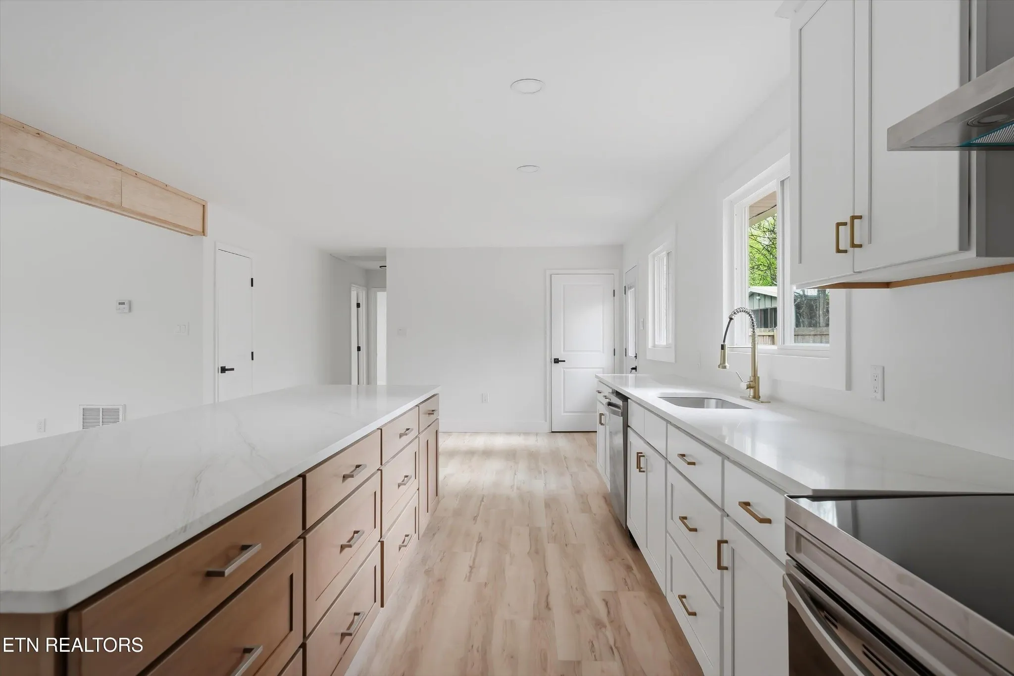 Experience effortless single-level living in this stunning, fully remodeled home where top-tier craftsmanship meets high-end design. The open-concept interior is filled with natural light, showcasing premium finishes like the durable, light-toned wood-look LVP flooring that flows throughout. At the heart of the home is a massive kitchen featuring custom white cabinetry, elegant gold fixtures, and brand-new stainless steel appliances, all centered around an oversized island built for entertaining.