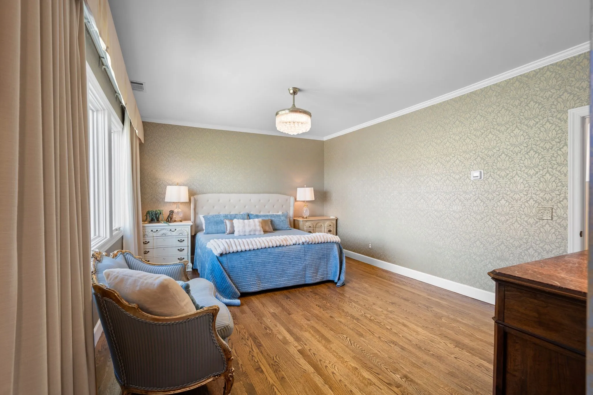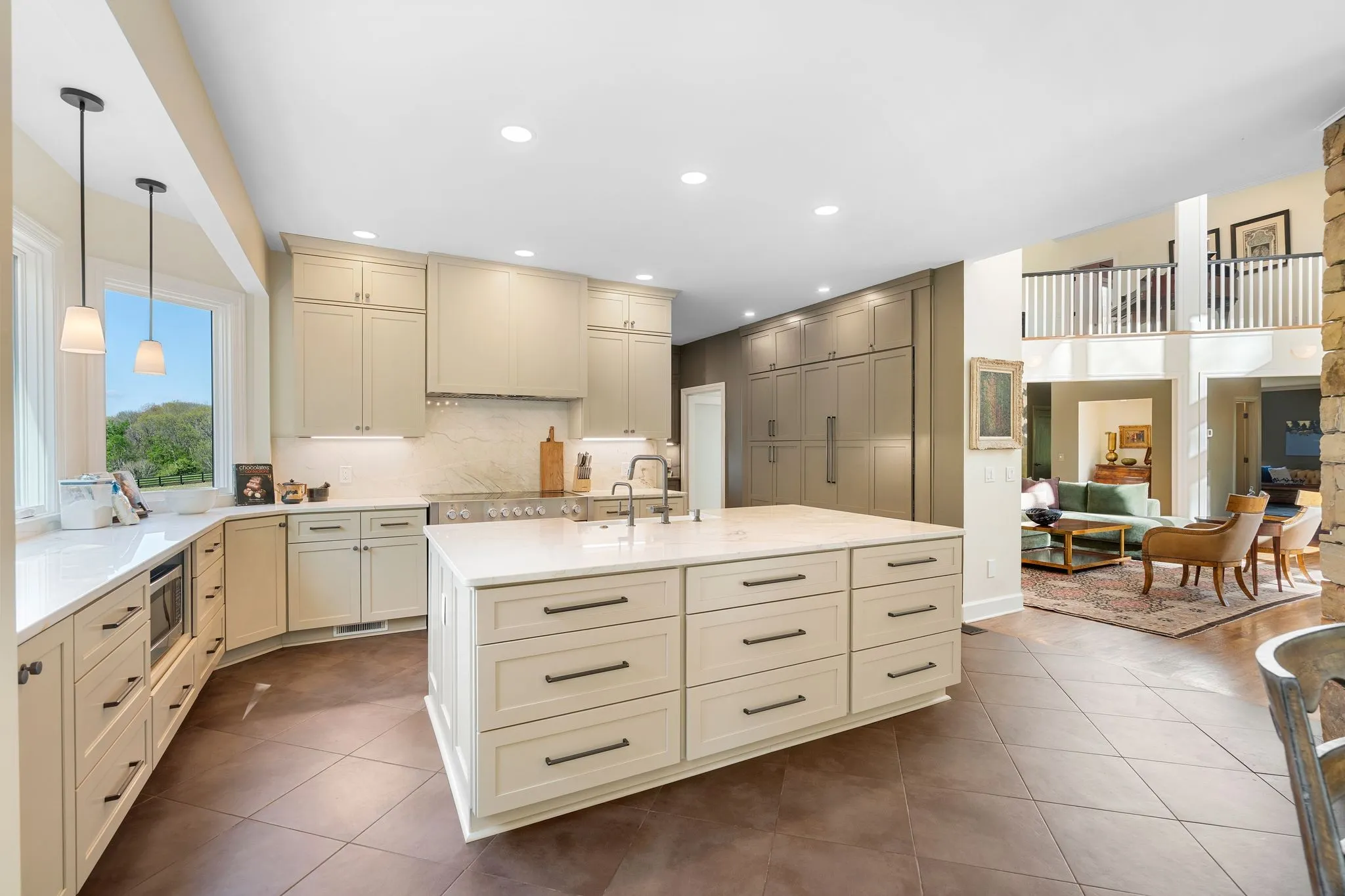 This beautifully updated residence offers approximately 5,963 square feet of thoughtfully designed living space with 4 bedrooms and 7 baths, ideal for everyday living and entertaining. The chef’s kitchen features built-in appliances, a breakfast room, and a butler’s pantry, flowing into formal and casual dining spaces. Multiple living areas—including a spacious family room, sunroom/office, and living room anchored by a custom walnut wet bar—provide flexibility for work, recreation, and gatherings.