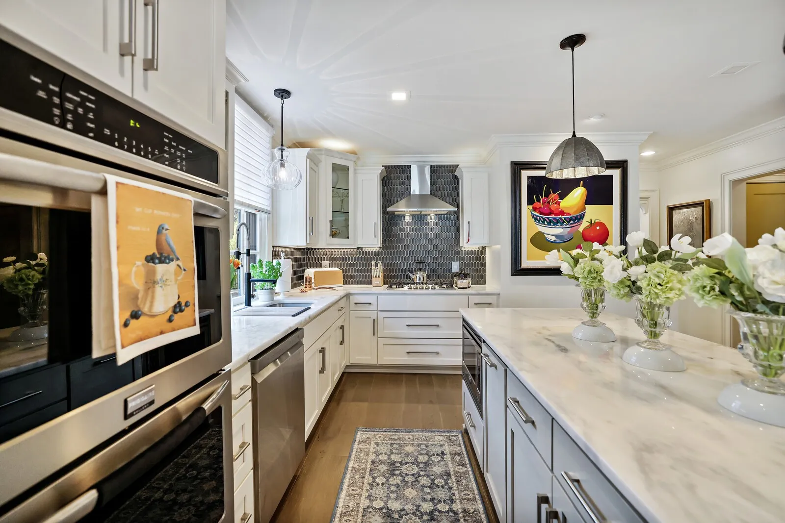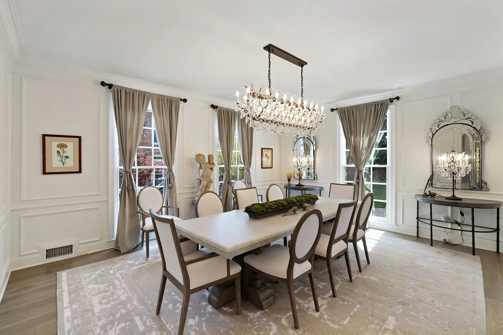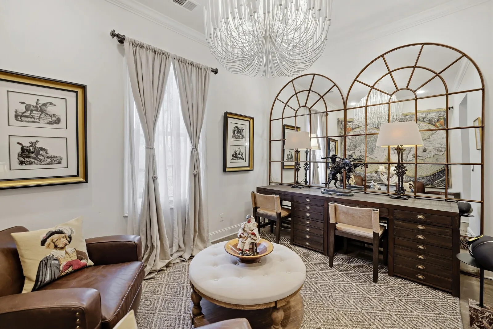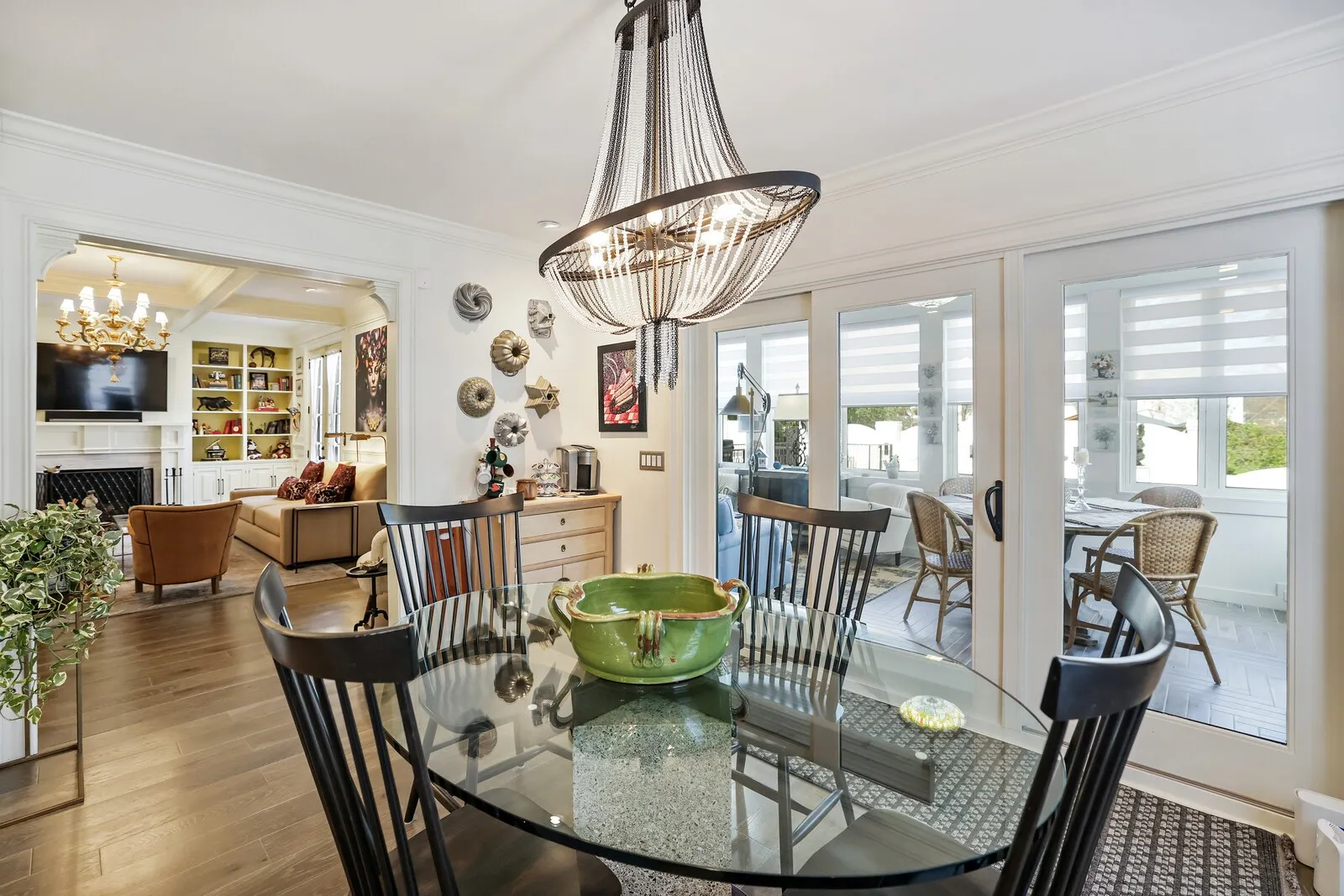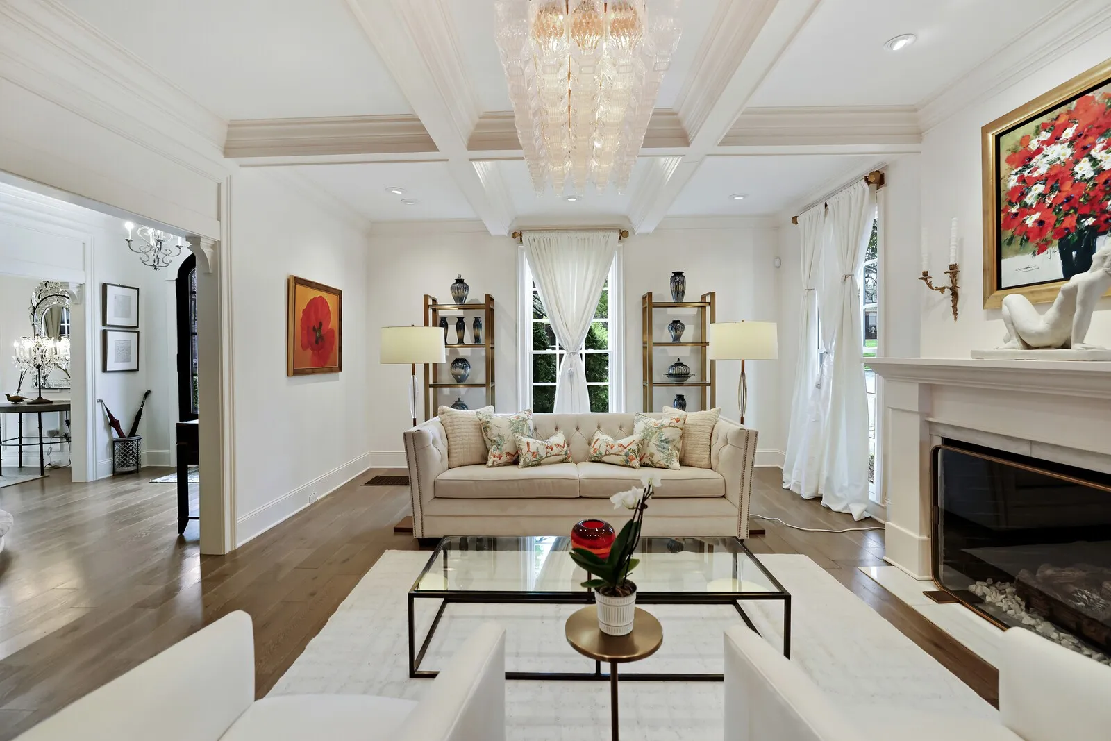 This extraordinary 6-bedroom, 4 full and 3 half bath residence offers over 6,000 square feet of refined living space, blending timeless elegance with thoughtful design at every turn. From the moment you enter, a grand staircase and stunning entryway set the tone for the craftsmanship found throughout, highlighted by Italian-imported hardware, designer lighting, and exquisite finishes. The formal dining room is a true showpiece, featuring a sparkling chandelier and three oversized windows that fill the space with natural light. A sophisticated sitting room with coffered ceilings, cozy fireplace, and a full wet bar nearby, creates the perfect setting for entertaining, while the main living room offers a second fireplace framed by custom built-in bookcases. The kitchen is both functional and beautiful, complete with a large island, stainless steel appliances, and an eat-in dining area. Just beyond, a sunny Florida room opens to the patio, seamlessly blending indoor and outdoor living. Each bedroom suite is thoughtfully designed, offering comfort and privacy. The primary suite is a true retreat, featuring a private office, a luxurious en-suite bath with dual vanities and a stunning tile shower, and a custom walk-in closet. The laundry room stands out with its eye-catching backsplash and elevated design. One of the home’s most unique features is the top-floor “Birdsnest Suite,” located at the front of the home. This private space includes a full bathroom, kitchen area, skylight, and its own laundry, ideal for guests, extended family, or a private studio. Additional highlights include elevator access, a spacious basement with additional guest accommodations, a sunny patio, and an attached 2-car garage. Furnishings are negotiable, offering the opportunity for a truly move-in ready luxury experience. This stunning home delivers space, style, and versatility in every detail. Up to 1% lender credit on the loan amount when buyer uses Seller’s Preferred Lender.