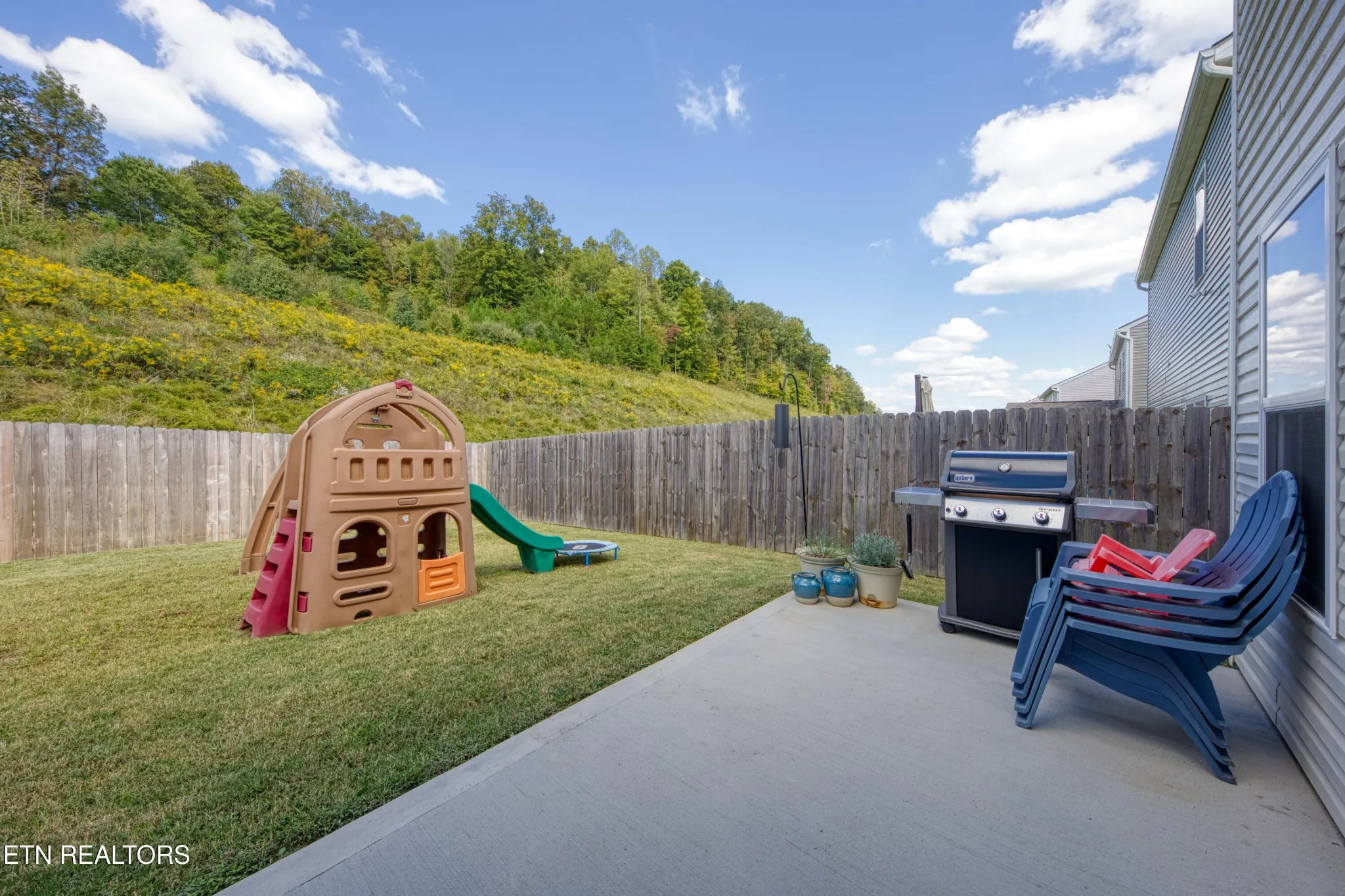 Outdoor living includes a fenced backyard with a fire pit, solar panel lighting outside the garage, refreshed landscaping with flower beds and rock accents, and plenty of room to entertain. Additional upgrades include expanded attic storage, garage shelving, a bolted safe that conveys, and a SimpliSafe security system with the option of ADT wiring.