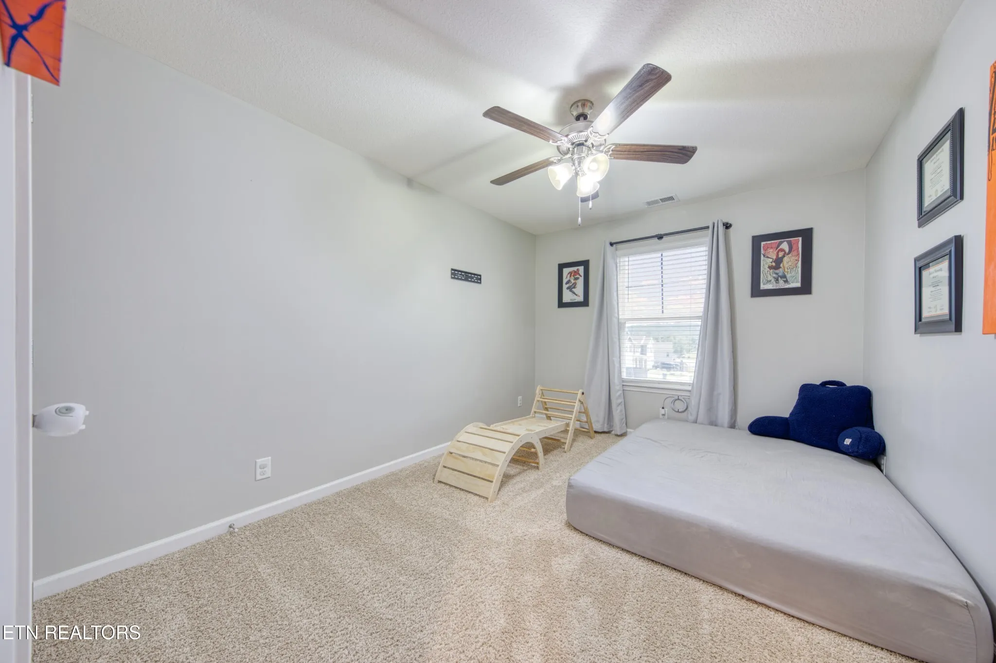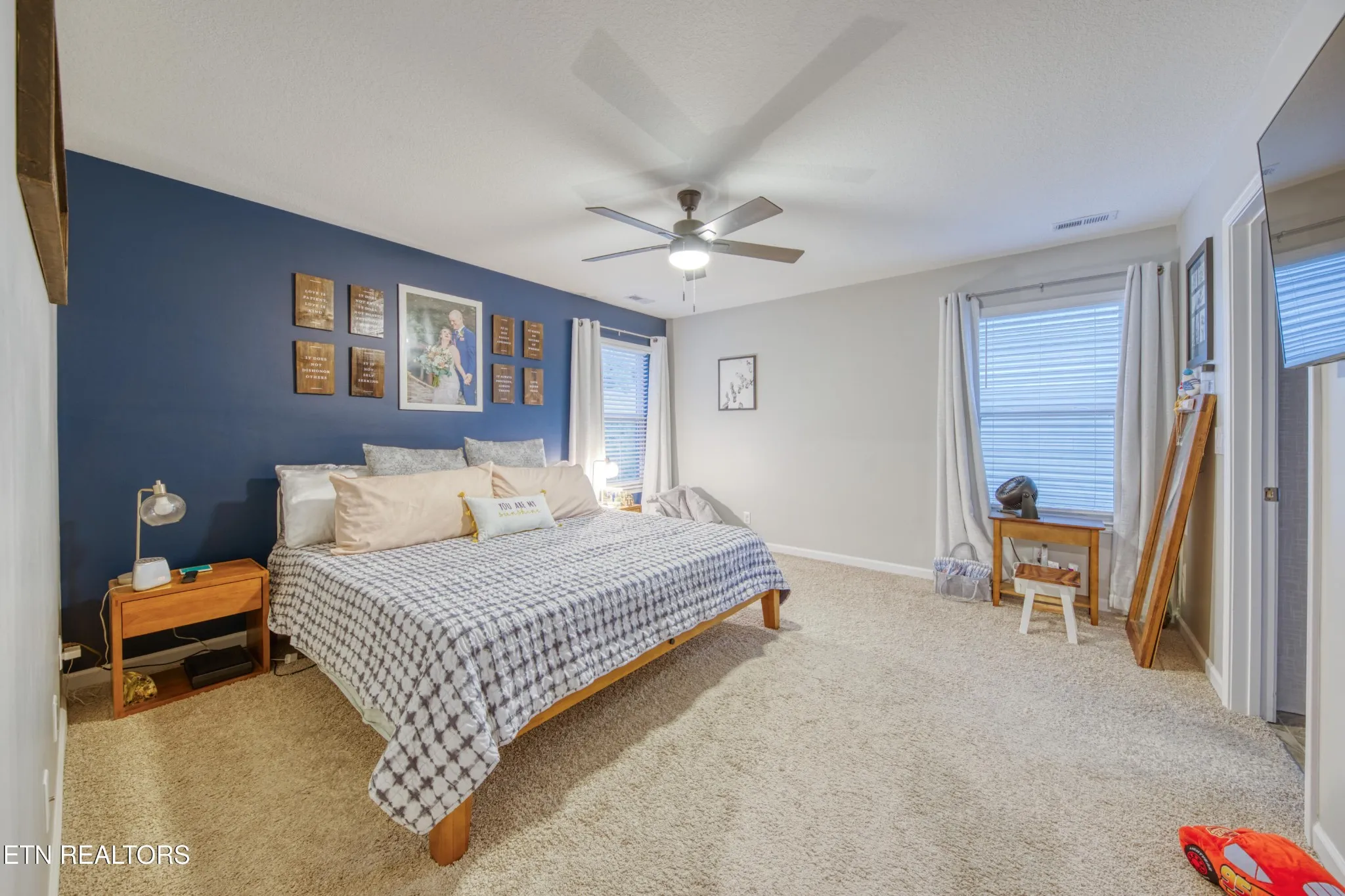 Inside, the home has been freshly painted and features smart switches, Google Home integration, a gas fireplace, and a gas stove—features not found in every home in the community. The majority of closets and the pantry have been upgraded, the master bathroom has been redone, and tinted windows add efficiency and comfort. Ceiling fans have been added to all bedrooms upstairs along with a large fan in the main living area downstairs.