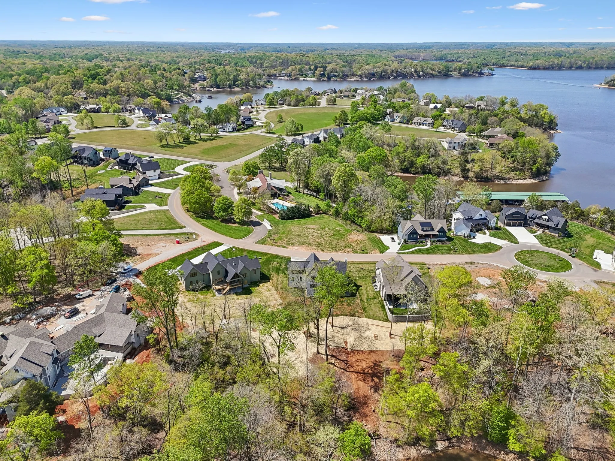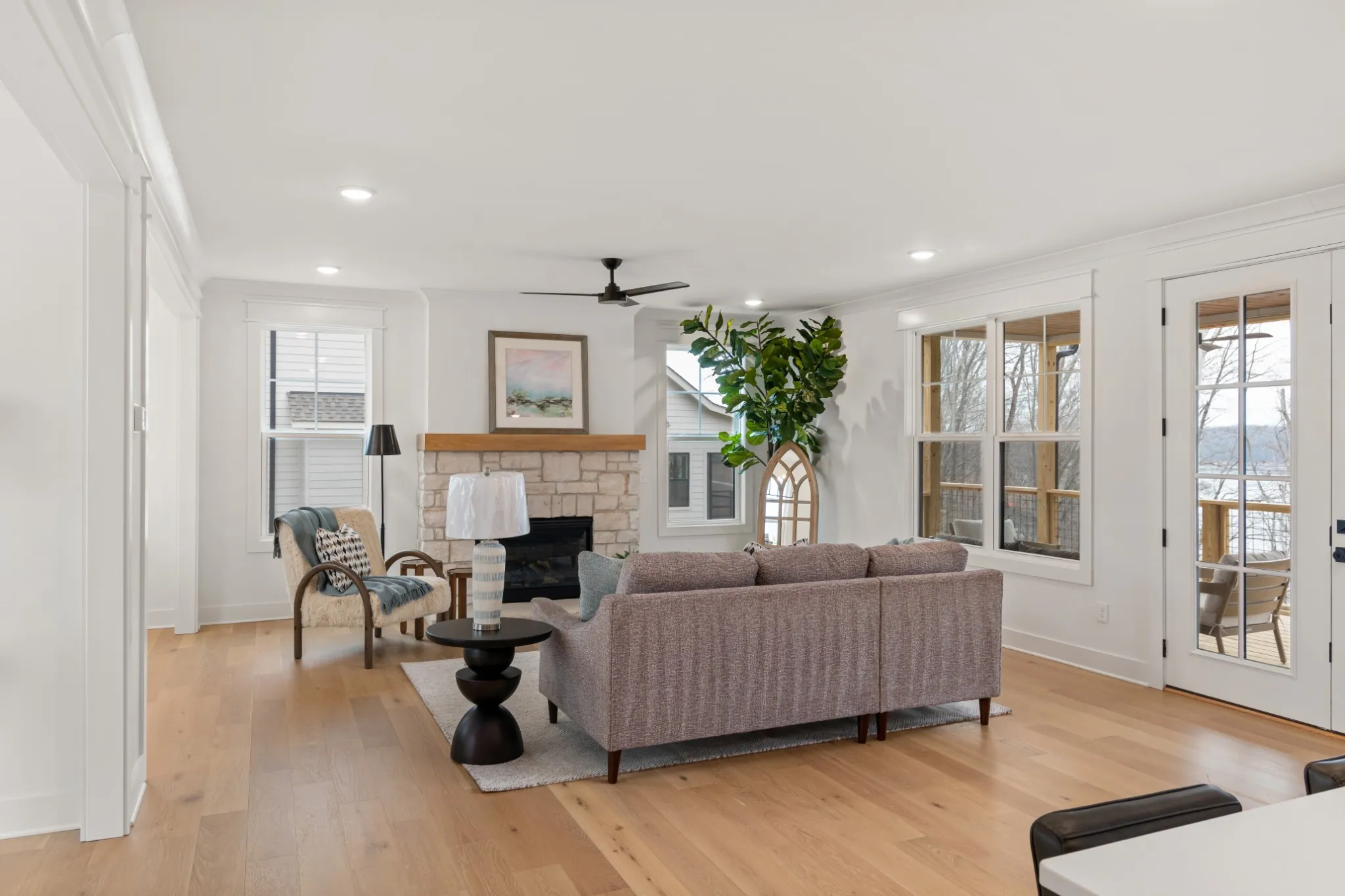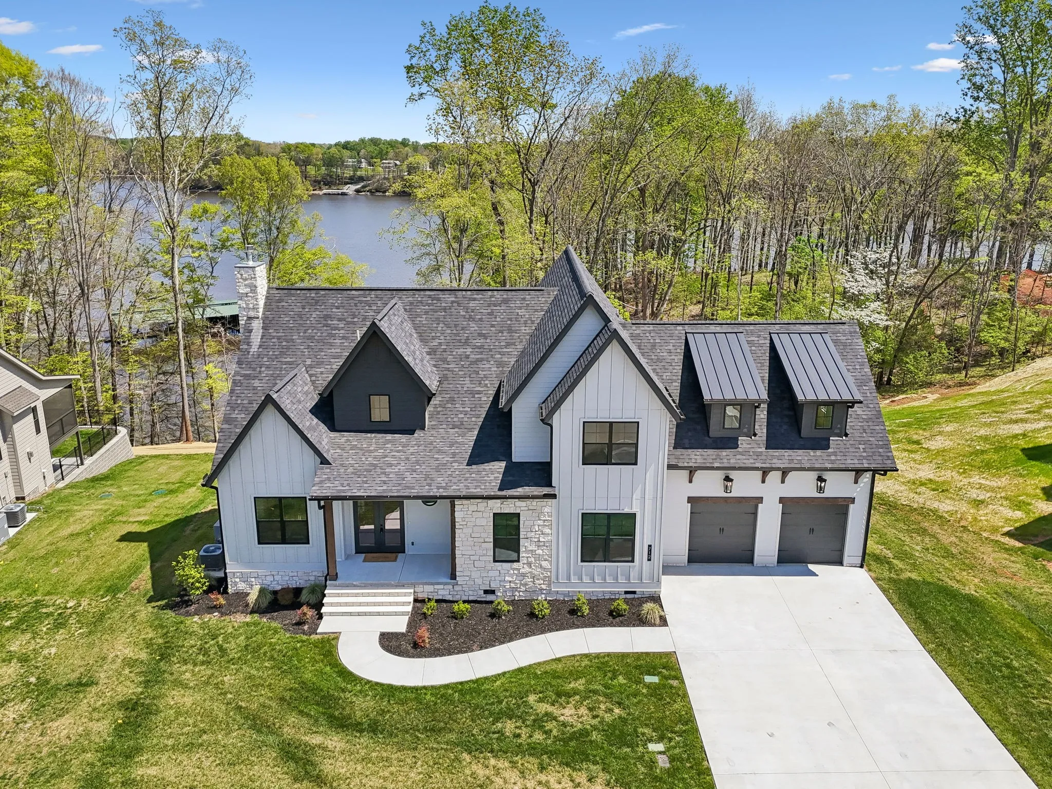 Luxury living at Fanning Bend. This home blends casual lake life with elevated design. The sun-lit living area features wide-plank hardwoods, a stone fireplace, and a wall of windows that opens to the surrounding woods and lake. The kitchen stands out with natural wood cabinetry, designer lighting and backsplash, and a spacious island—perfect for gathering. Upstairs you’ll find a large bonus room and another covered balcony space overlooking the lake. A deeded boat slip comes with the home, and the community pool and walkable neighborhood keep the outdoors close. Inside, thoughtful touches like a herringbone-tiled mudroom and generous guest spaces make it as functional as it is beautiful. Whether you’re hosting, relaxing, or heading out on the water, this home is built for a life well-lived at the lake.