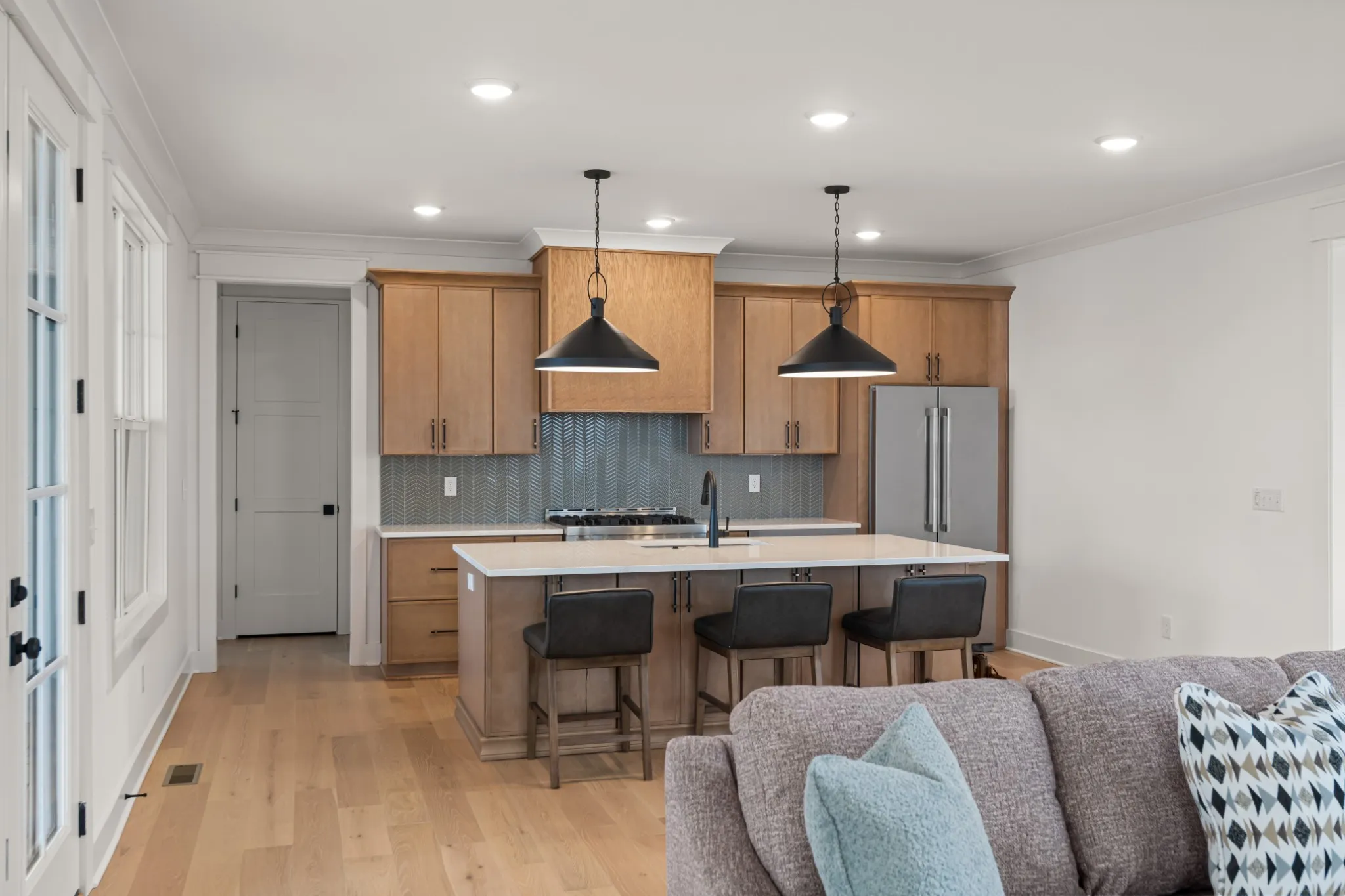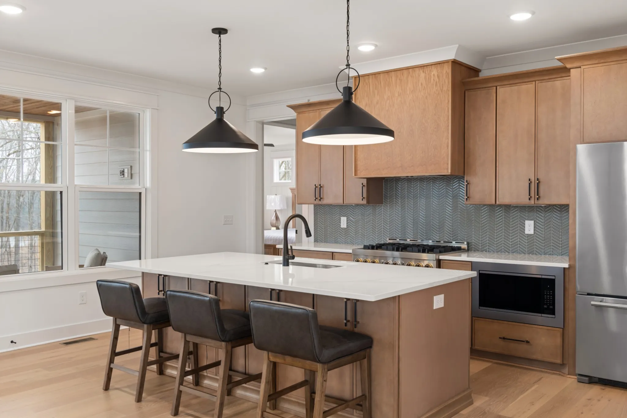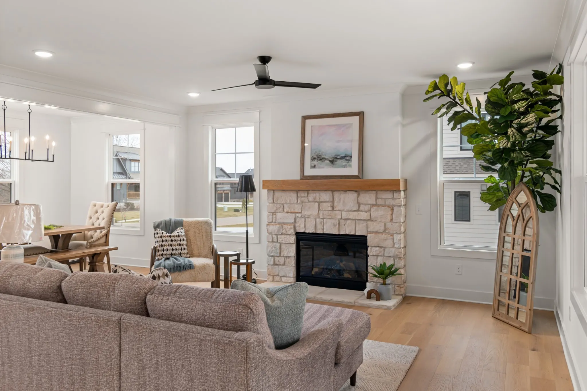 Luxury living at Fanning Bend. This home blends casual lake life with elevated design. The sun-lit living area features wide-plank hardwoods, a stone fireplace, and a wall of windows that opens to the surrounding woods and lake. The kitchen stands out with natural wood cabinetry, designer lighting and backsplash, and a spacious island—perfect for gathering. Upstairs you’ll find a large bonus room and another covered balcony space overlooking the lake. A deeded boat slip comes with the home, and the community pool and walkable neighborhood keep the outdoors close. Inside, thoughtful touches like a herringbone-tiled mudroom and generous guest spaces make it as functional as it is beautiful. Whether you’re hosting, relaxing, or heading out on the water, this home is built for a life well-lived at the lake.