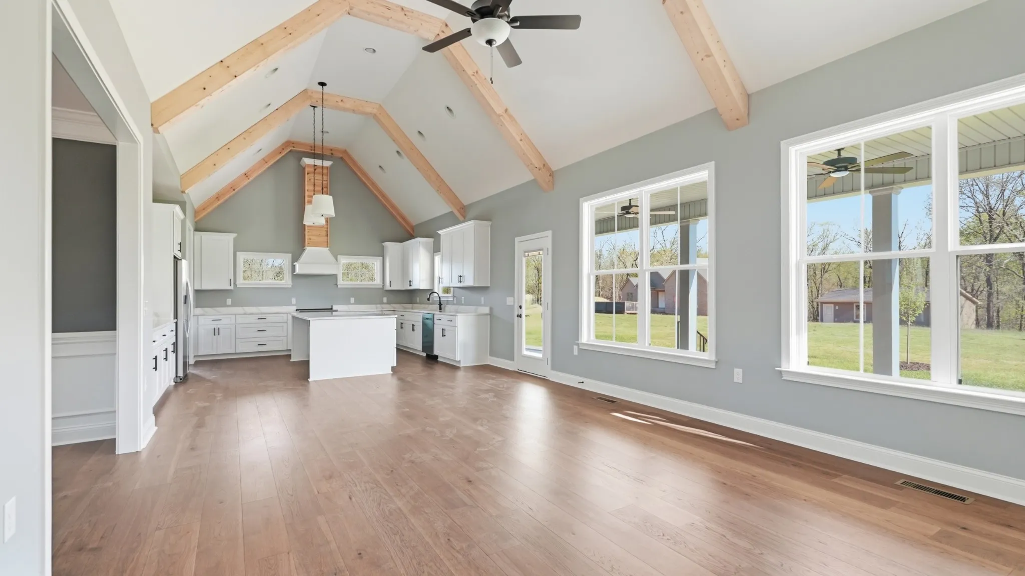 Sitting on nearly 3 acres just outside of Nashville, this new construction home is about 35 minutes from downtown. Featuring 3 bedrooms, 3.5 bathrooms, a flex room, and over 3,600 square feet, the home offers a primary suite on the main level, along with a separate dining room and living room. Upstairs offers additional bedrooms and a large bonus room. The wraparound covered back patio provides plenty of space for outdoor seating and entertaining.