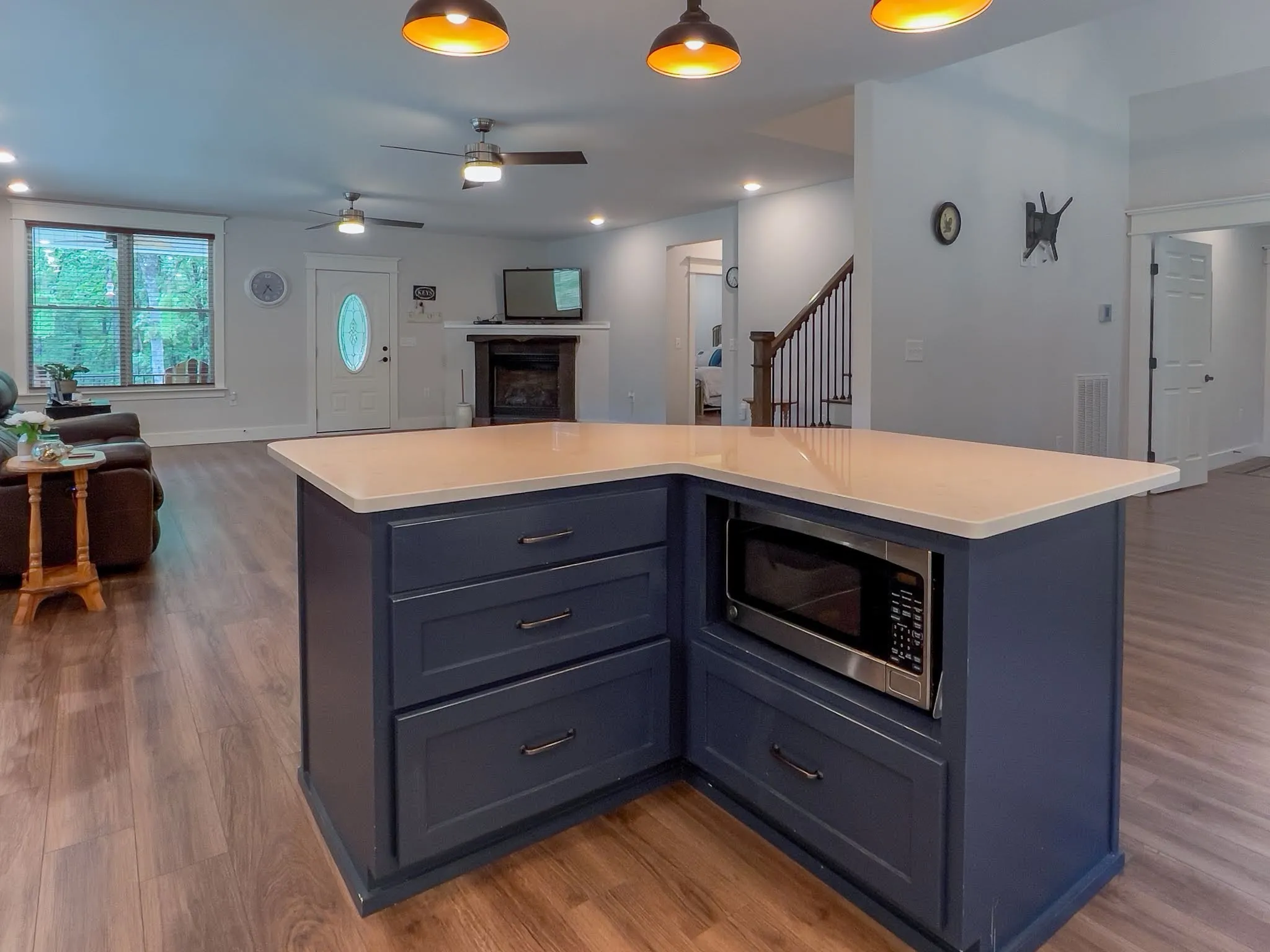 The STUNNING KITCHEN is the heart of the home, featuring a dream island, Quartz countertops, Stainless Steel appliances, and custom Craftsman cabinetry, all flowing seamlessly into the dining and living spaces for easy entertaining.