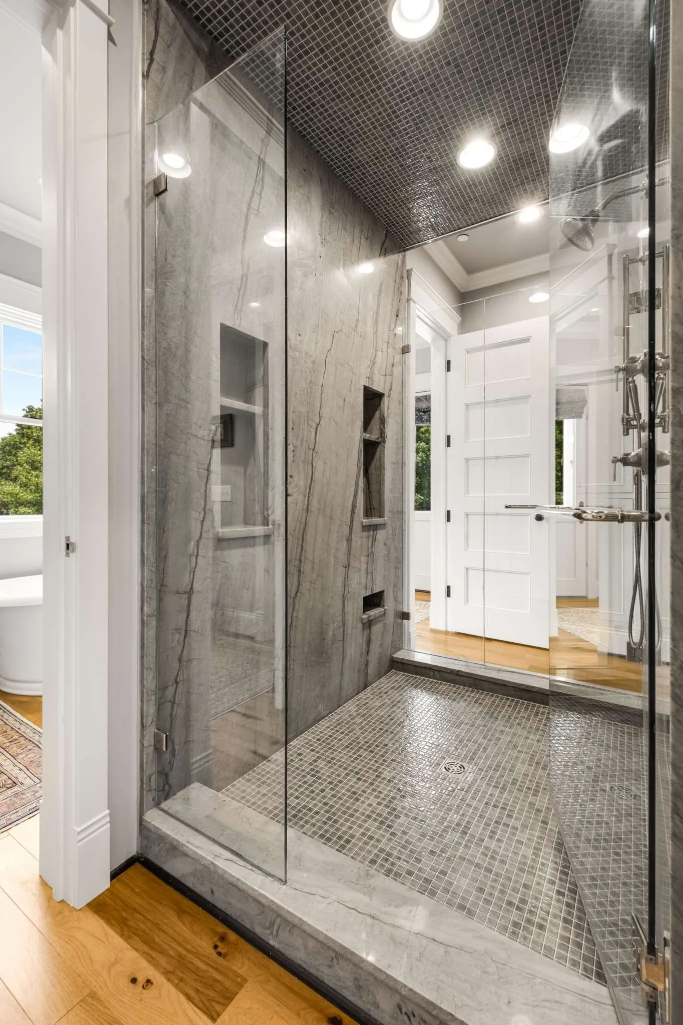 Finishes reflect a consistent commitment to quality: hickory hardwood floors, custom cabinetry, and quartzite countertops throughout. Four and a half baths. A private hot tub off the main-level primary suite.