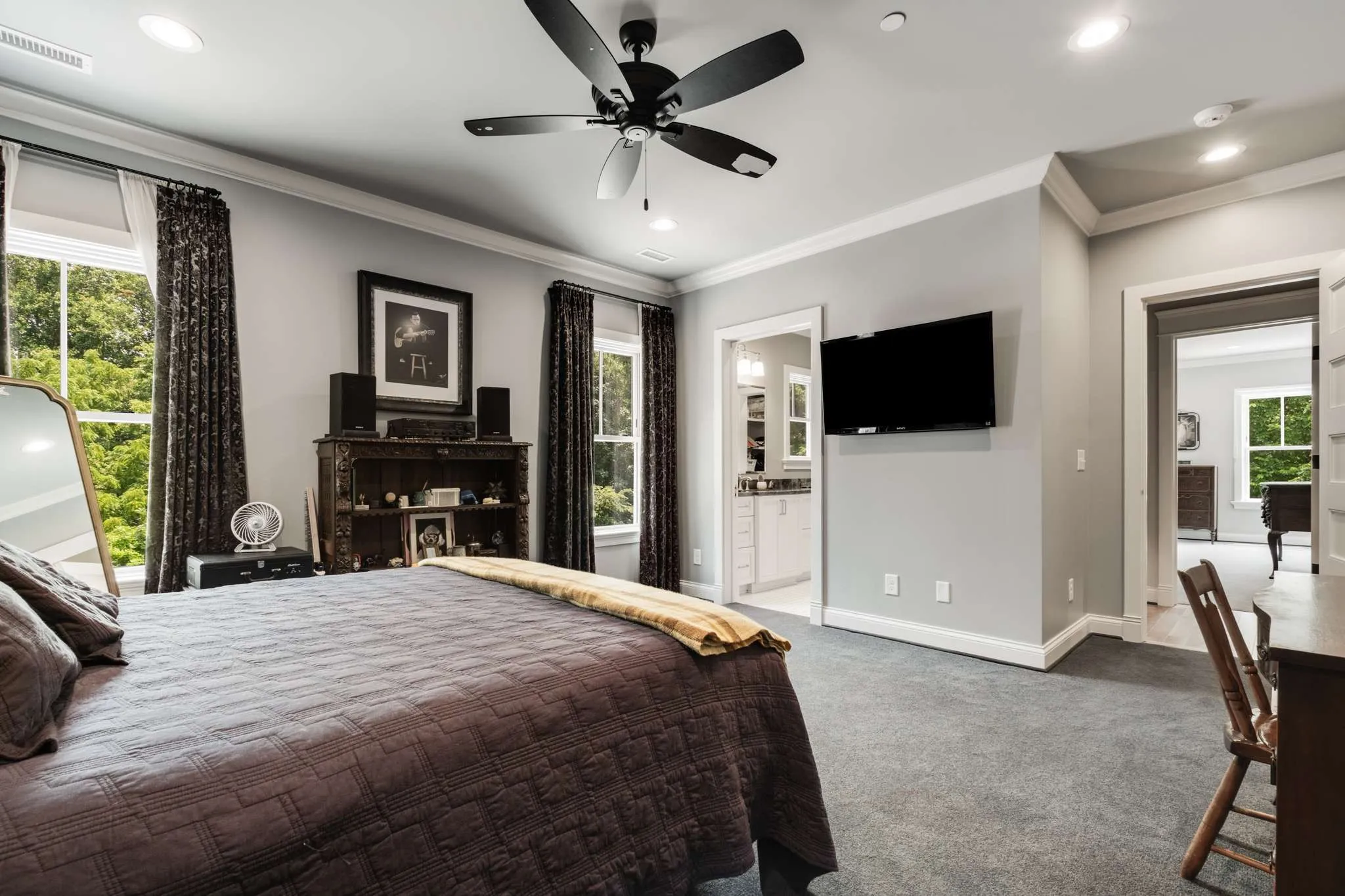 At the heart of the design is an expansive 1,800 sq ft wraparound porch — partially covered and perfectly suited for seamless indoor-outdoor living. The entire top floor opens into a dramatic entertainment space, while oversized Sierra Pacific windows and glass doors bathe every room in natural light and frame sweeping, private woodland views. Back-to-back masonry fireplaces anchor both the family room and the covered deck, lending warmth and character across seasons.