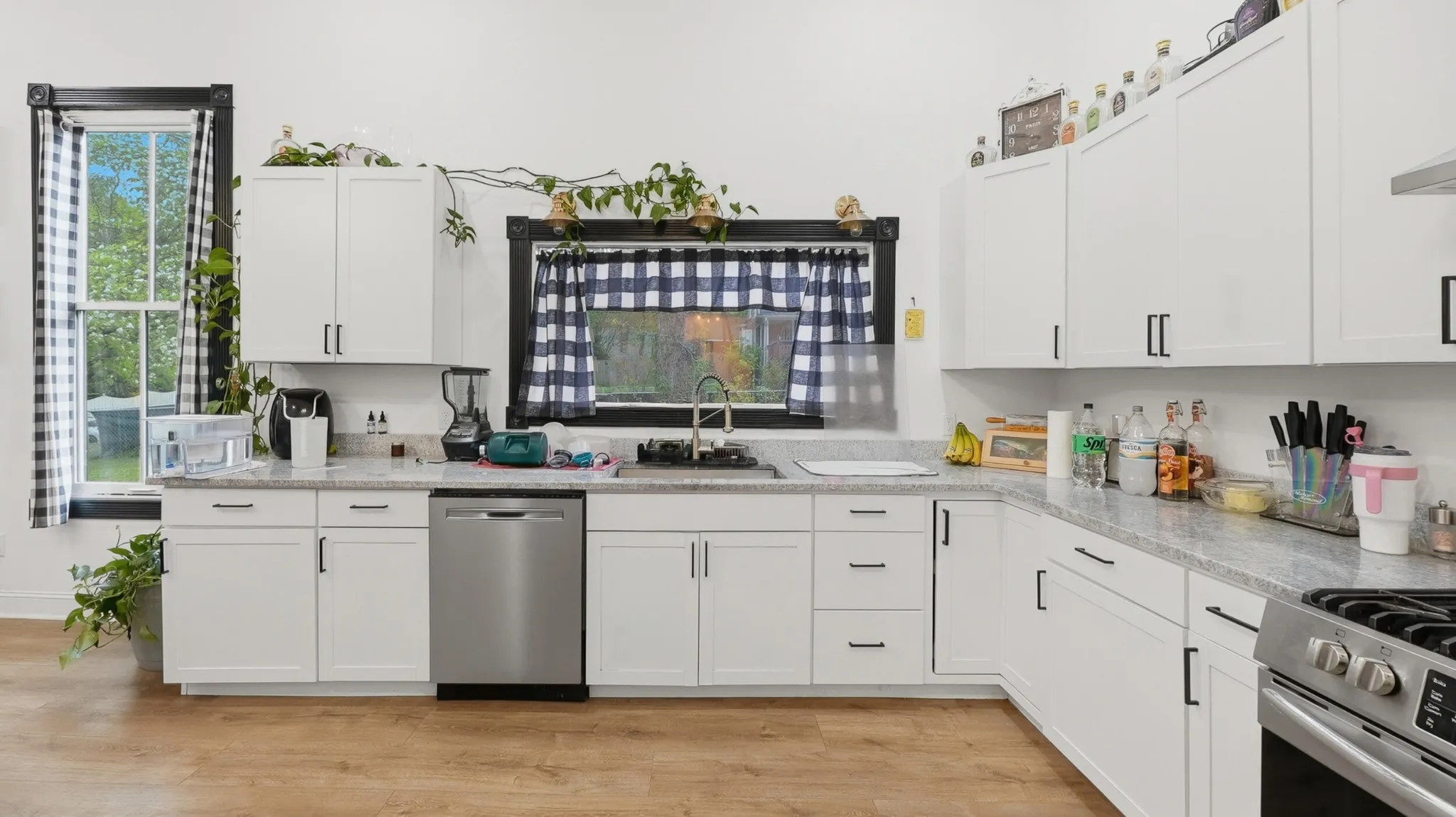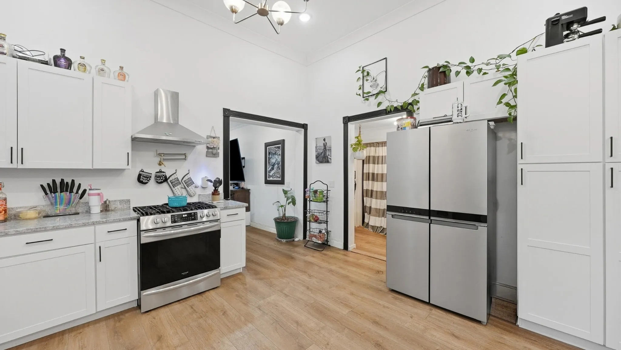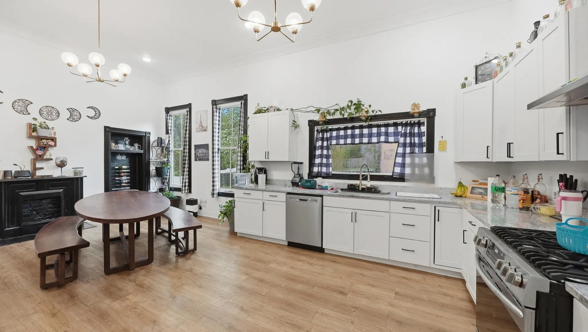 The kitchen is easily the centerpiece and one of the best parts of the home, featuring updated cabinetry, granite countertops, stainless appliances, and a custom vent hood.