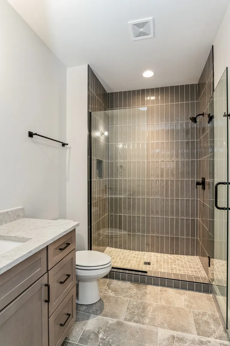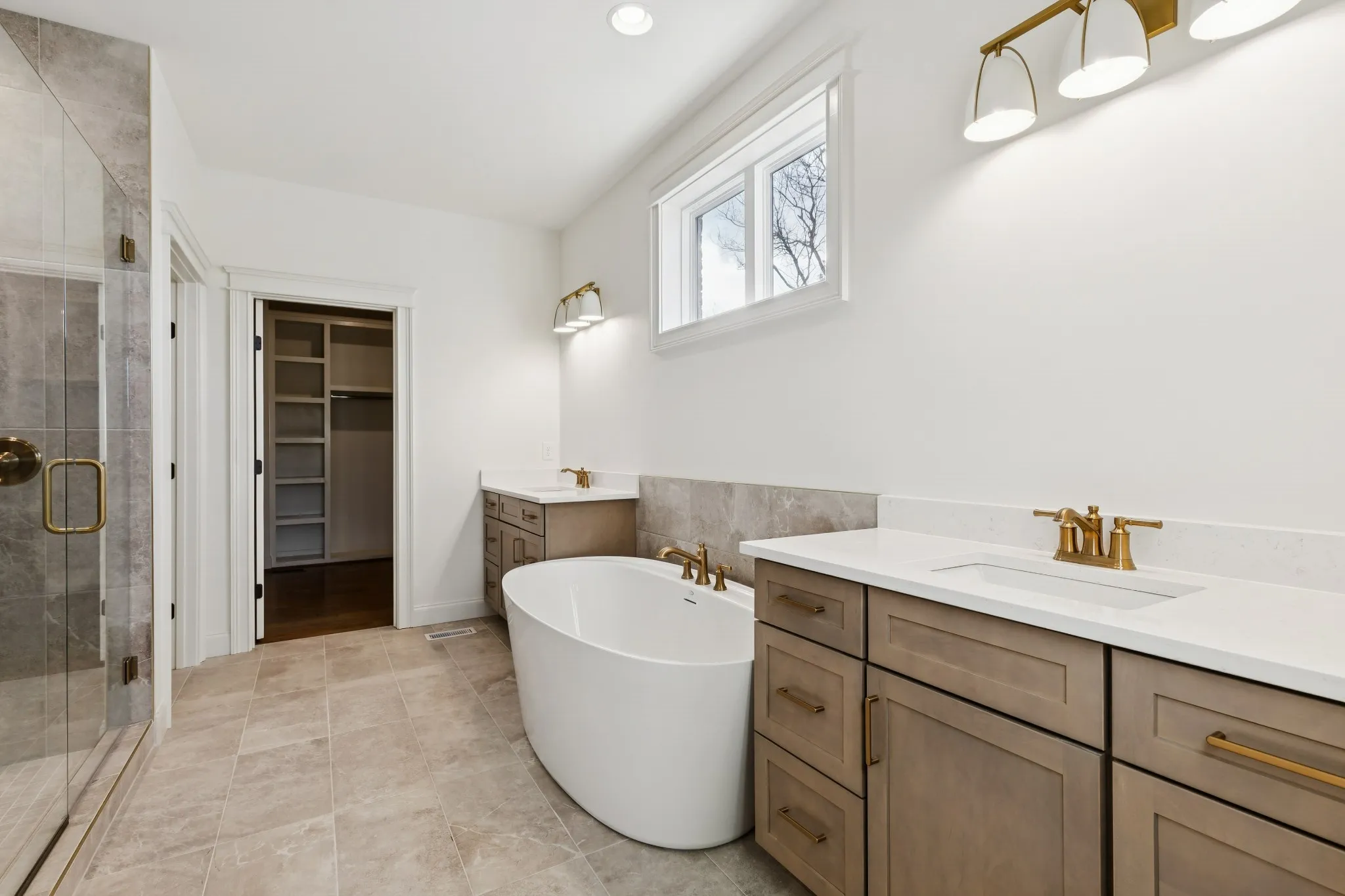 Quartz countertops are included in the kitchen, bathrooms, and laundry, along with tile flooring and tile showers. The main-level primary suite features a vaulted ceiling, freestanding soaking tub, oversized walk-in shower, and wood shelving in the closet. A secondary bedroom and full bath on the main level provide flexibility for guests or a home office. A mudroom with built-ins and a spacious laundry room with cabinets and a sink add everyday convenience.