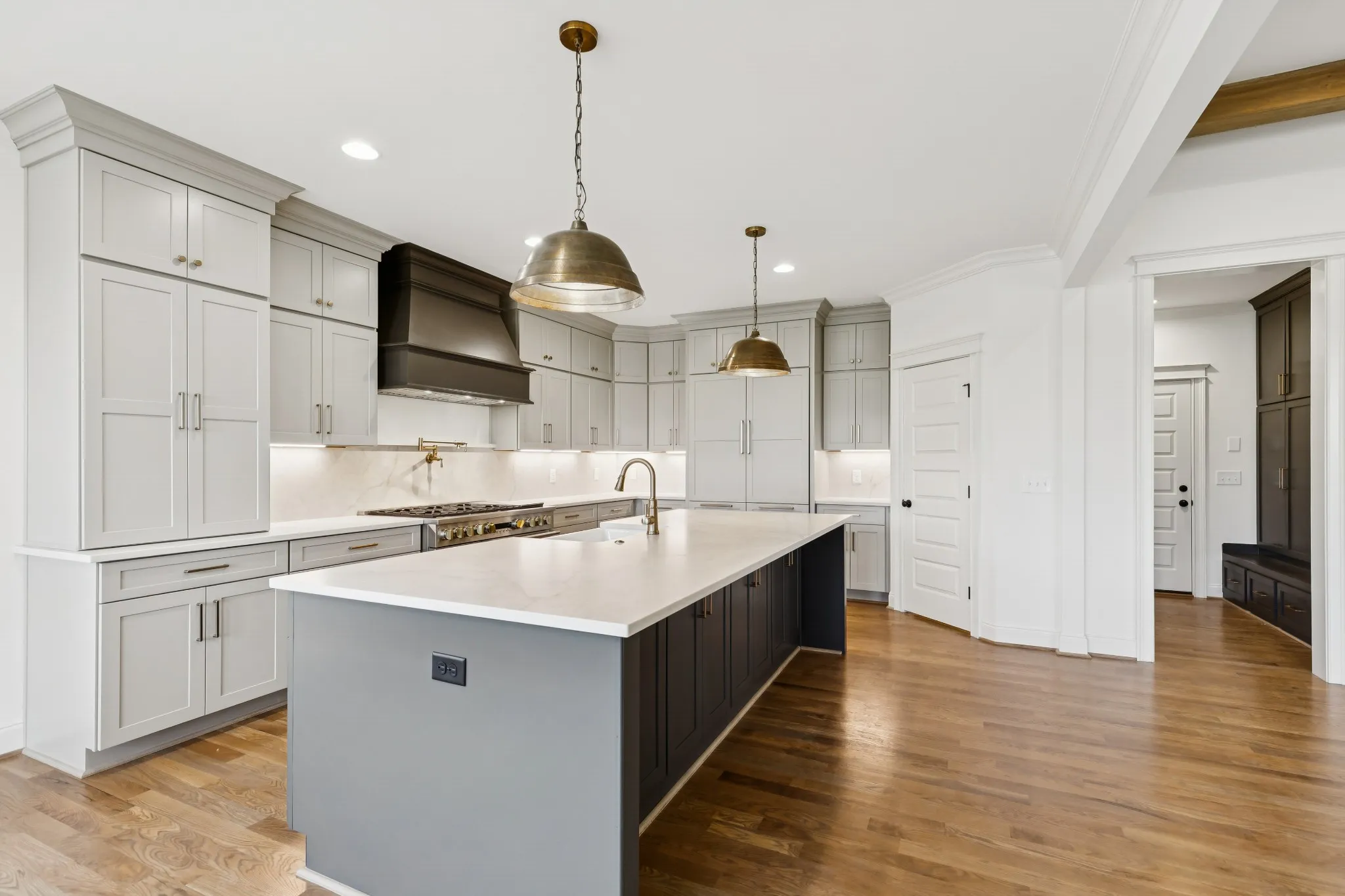 The modified Teesdale II plan offers a thoughtful layout with high-end finishes included as standard. Highlights include hardwood flooring throughout the main level, a gourmet kitchen with a large island and walk-in pantry with wood shelving, and a family room featuring wood beams and a stone fireplace. The covered back porch with an outdoor brick fireplace is perfect for year-round enjoyment.