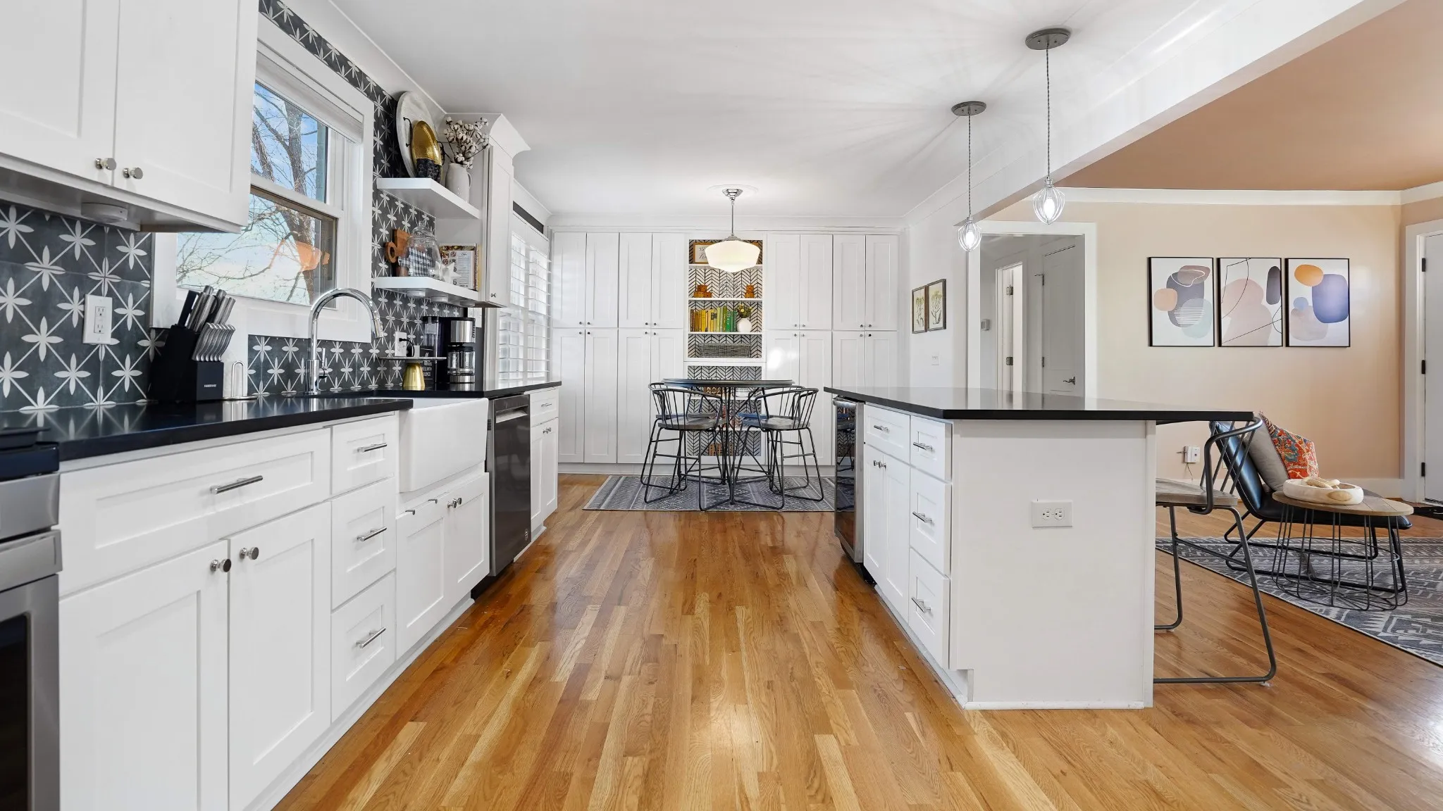 Step inside to find beautiful wood floors throughout and a spacious, updated kitchen featuring brand-new cabinetry, a farmhouse sink, and a large island with seating for three—perfect for casual dining or entertaining. Just off the kitchen, a cozy den provides versatile space ideal for a home office, playroom, or additional living area.
