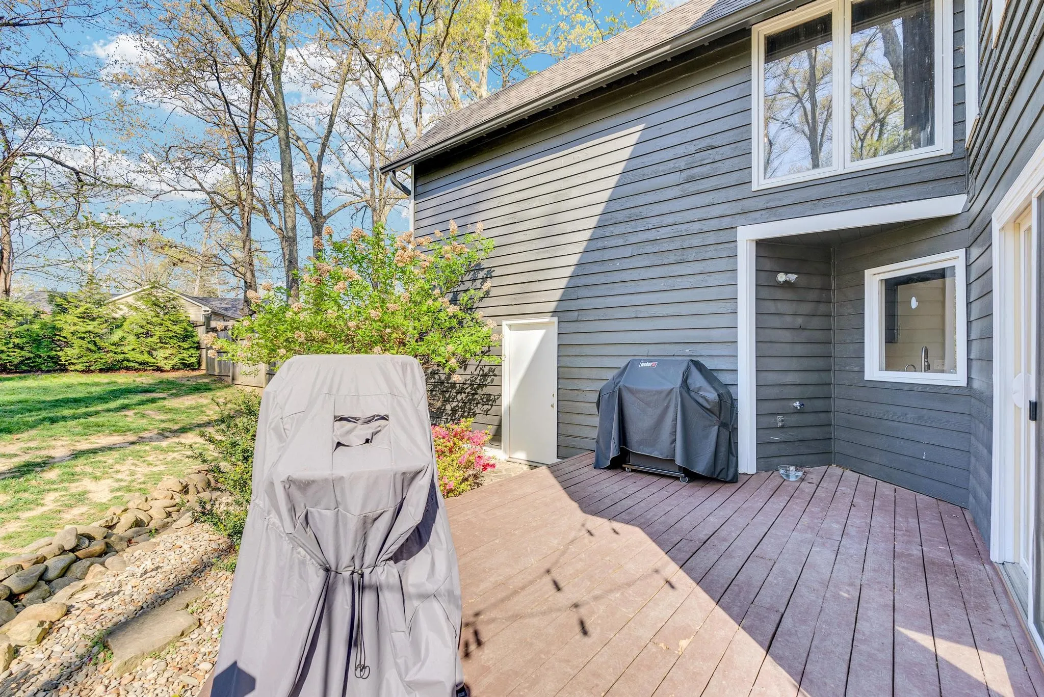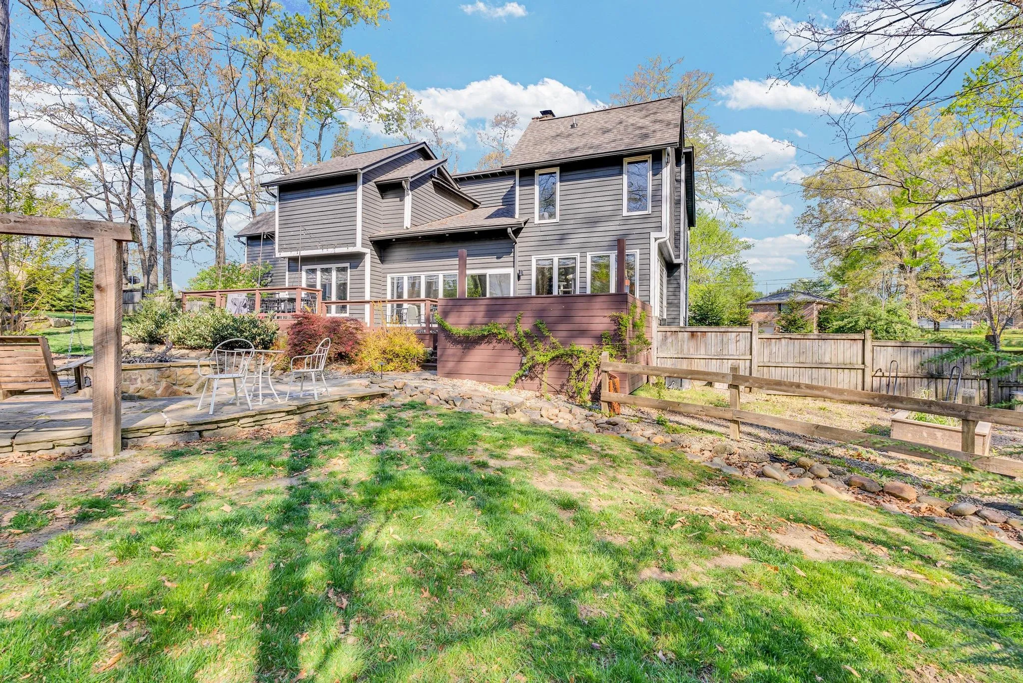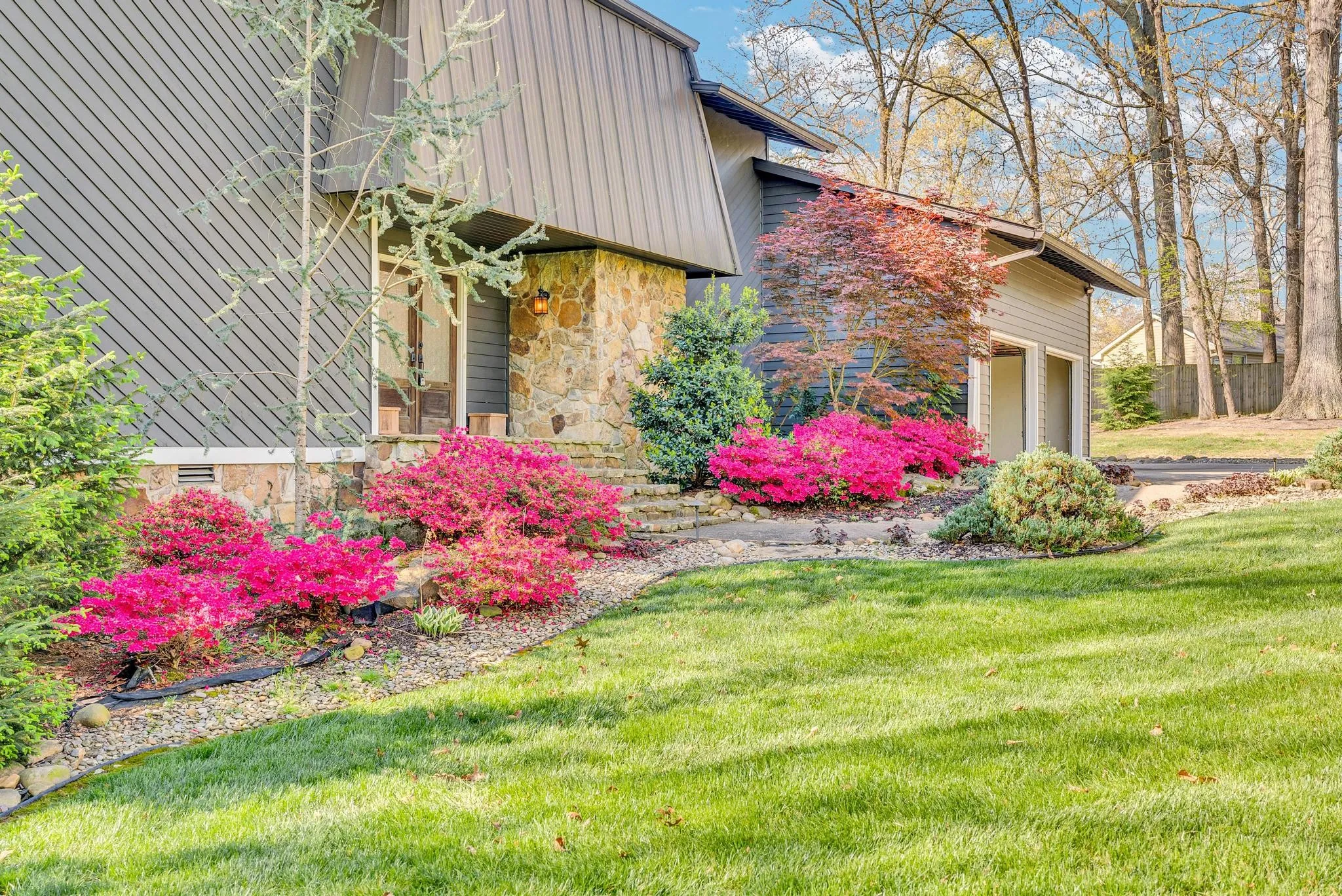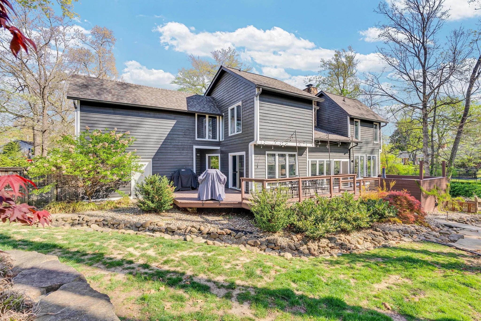 Exceptional 4-bedroom, 2.5-bath contemporary residence set on a private, tree-lined lot in an established setting. A striking architectural exterior with rich charcoal tones, dramatic rooflines, and manicured landscaping creates unforgettable curb appeal. Inside, sophisticated living spaces are anchored by a stunning floor-to-ceiling stone fireplace, blending timeless elegance with modern design. The updated kitchen features stylish finishes, quality cabinetry, and ample workspace, and is seamlessly connected to the living room—perfect for everyday living and entertaining. On the opposite side of the living room, a dedicated dining room provides a defined yet accessible space for hosting gatherings. A spacious bonus room offers flexibility for a home office, media room, or additional living space to suit your needs. Step outside to an expansive deck overlooking a park-like, fully fenced backyard—an ideal setting for relaxing, entertaining, or enjoying the peaceful natural surroundings. Expansive windows invite natural light and serene views throughout, while the thoughtfully designed floor plan ensures effortless flow for both refined entertaining and everyday comfort. Surrounded by mature trees and lush seasonal color, this property offers a rare blend of privacy, luxury, and architectural character—truly a standout residence that combines modern sophistication with natural beauty.