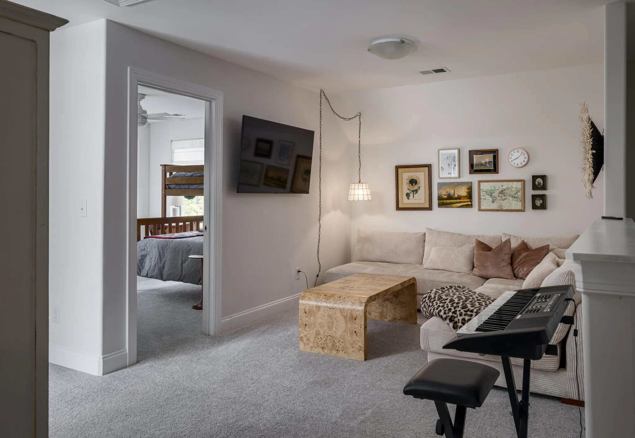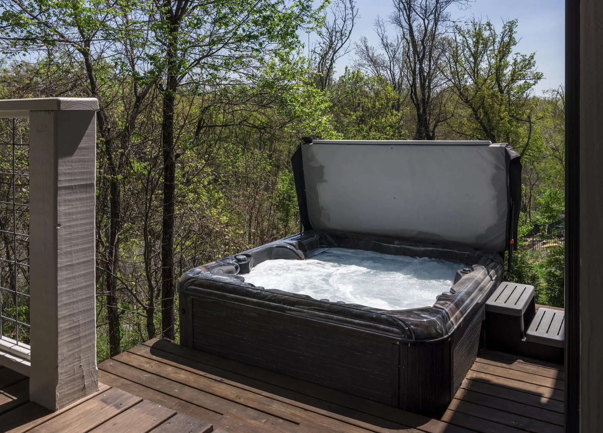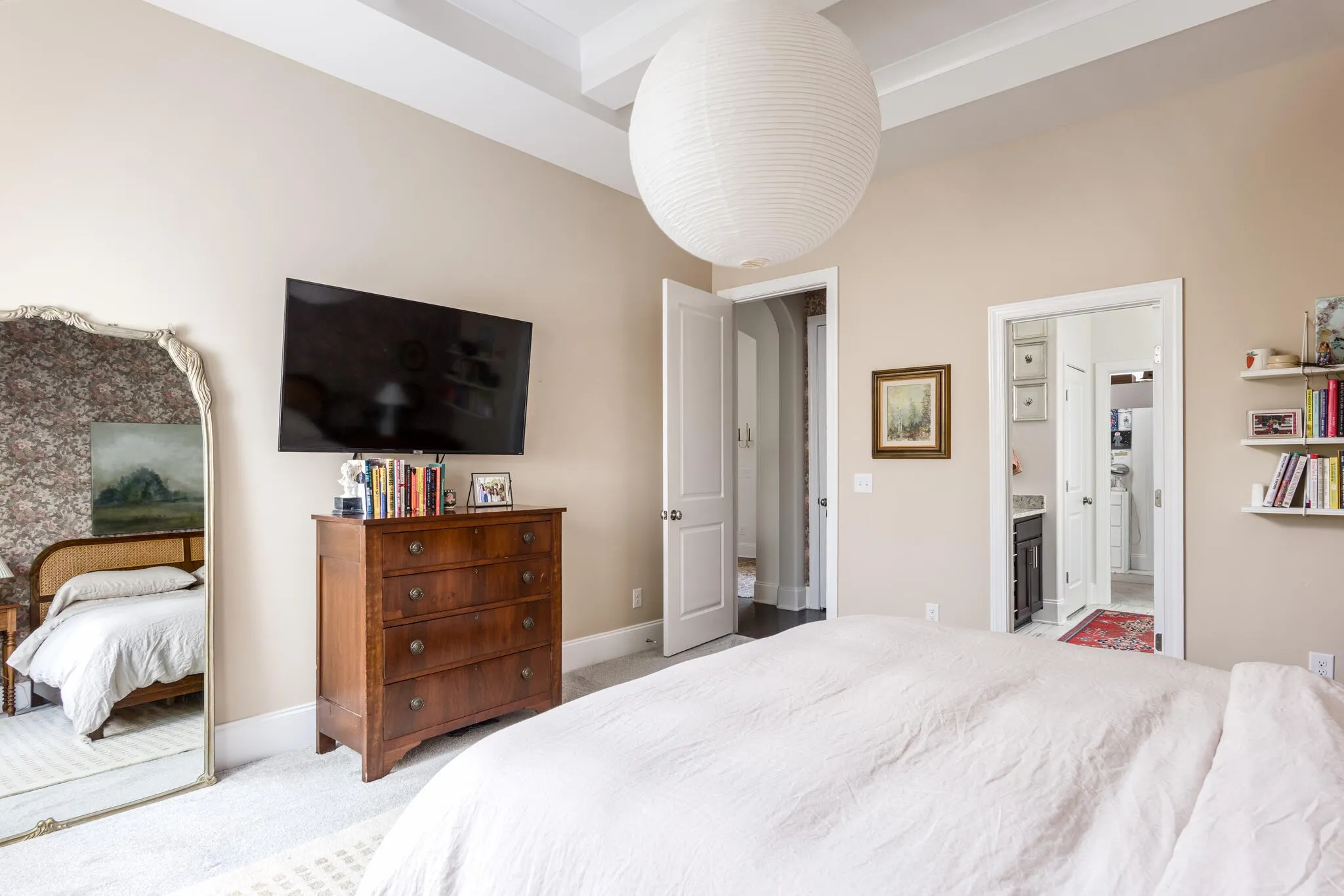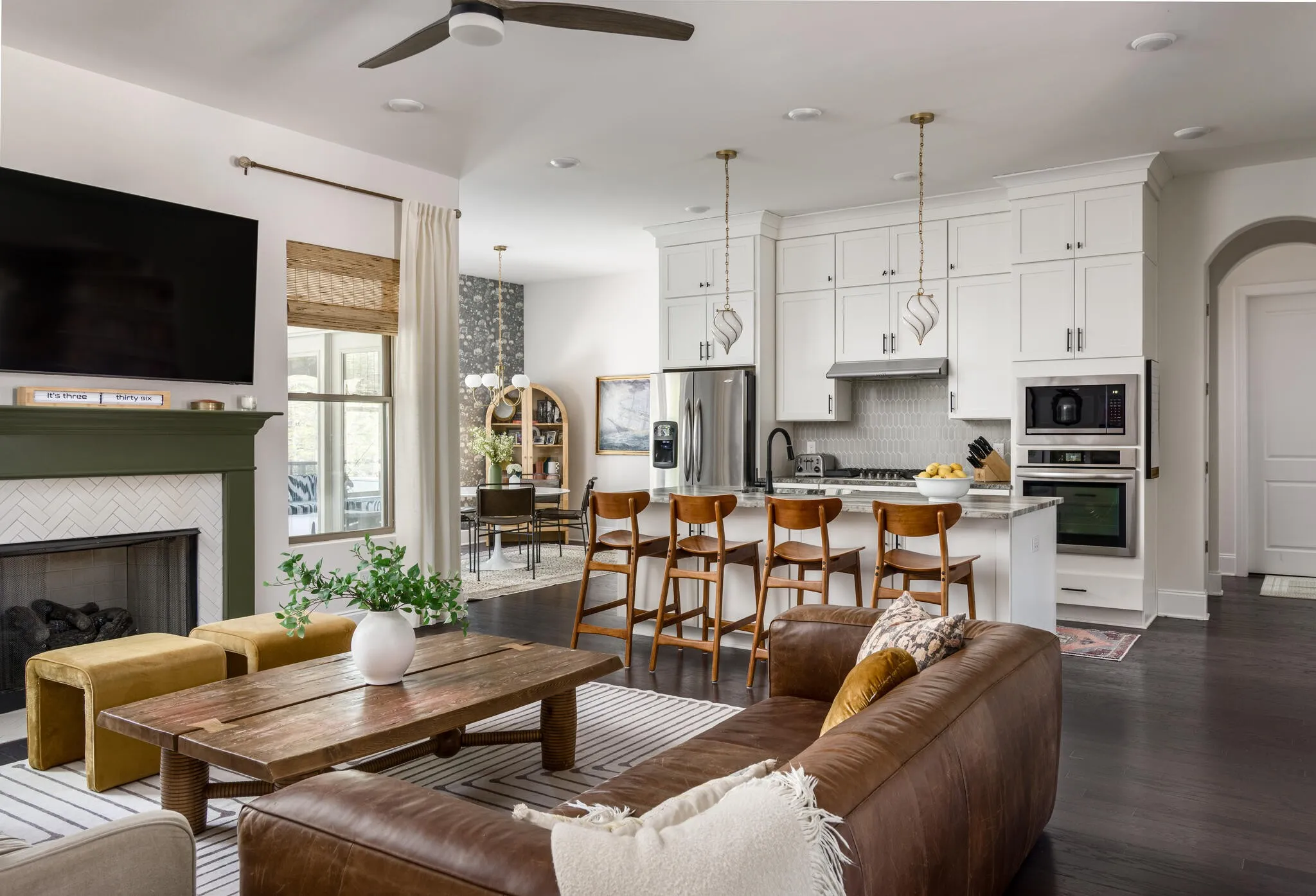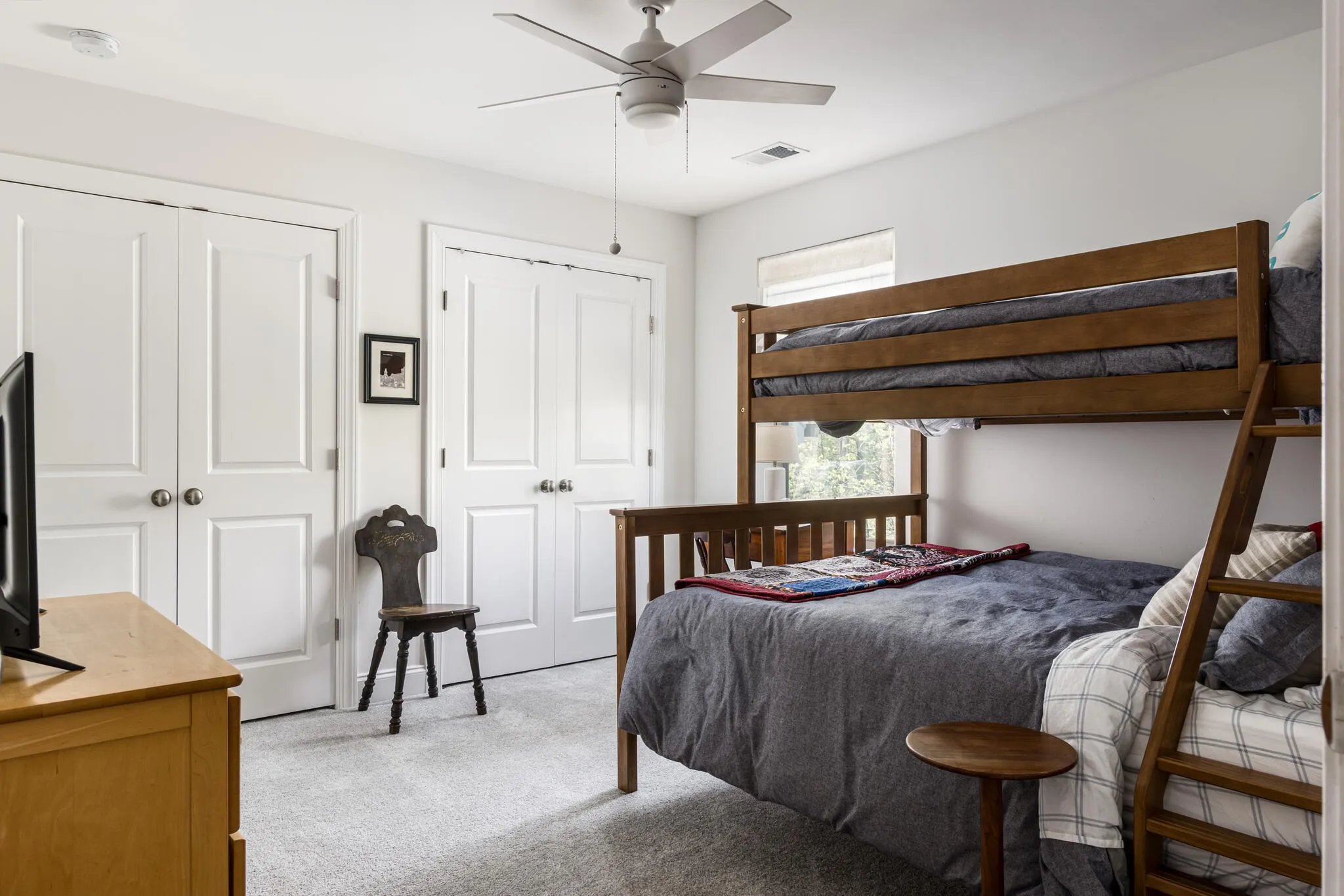 Inside, natural light fills the home from every angle and shifts beautifully throughout the day. The layout is open, connected, and thoughtfully designed for everyday living. The kitchen serves as the heart of the home, where daily life unfolds and simple moments turn into lasting memories. With two distinct living spaces, there is room for everyone, from cozy movie nights upstairs for the kids to a separate downstairs retreat where adults can unwind. Just beyond the back door, the expansive deck, completed in Fall 2025, extends your living space outdoors. Enjoy dinner in the open air, laughter drifting through the trees, and relaxing in the hot tub as the day winds down. Weekend mornings begin with coffee and peaceful views to start the day, while fall evenings are perfect for watching a football game in the crisp air. Thoughtful upgrades add both character and function throughout. Custom closets in the primary and upstairs bedrooms, along with quality built-ins in the large upstairs bedroom featuring Rejuvenation hardware, offer both practicality and style. Designer wallpaper and high-end light fixtures bring warmth and personality to each space.