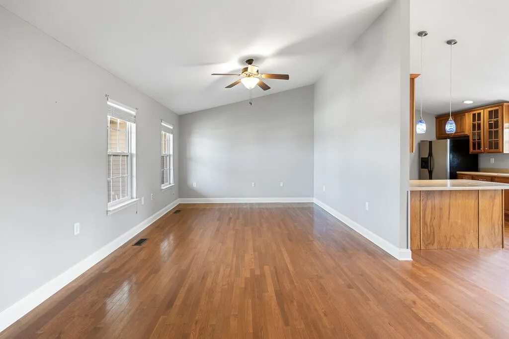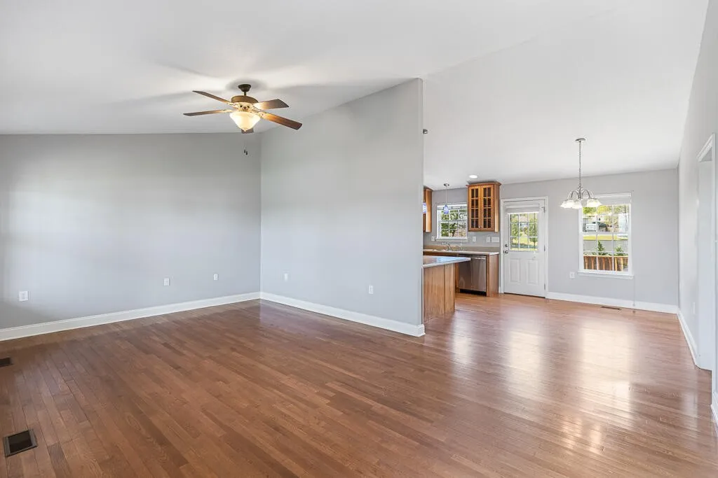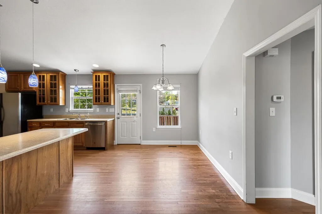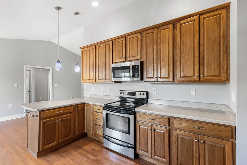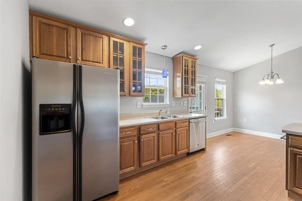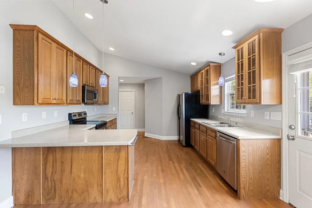 Step inside to an inviting open floor plan featuring hardwood and tile flooring throughout. The spacious kitchen is a standout, offering abundant counter space, rich hickory cabinetry with 42” upper cabinets, and a functional eat-in bar–perfect for both everyday living and entertaining.