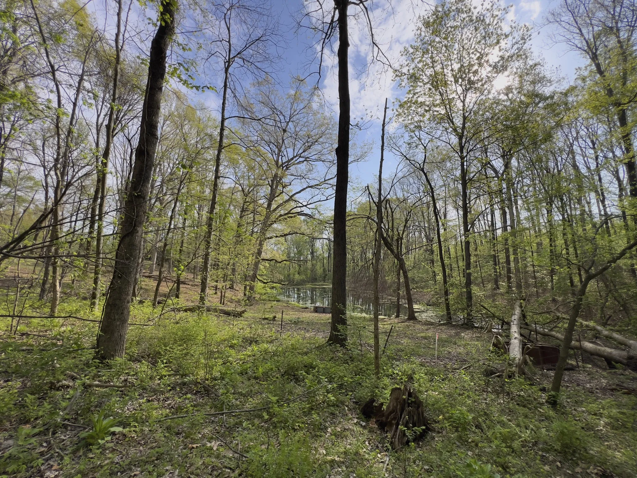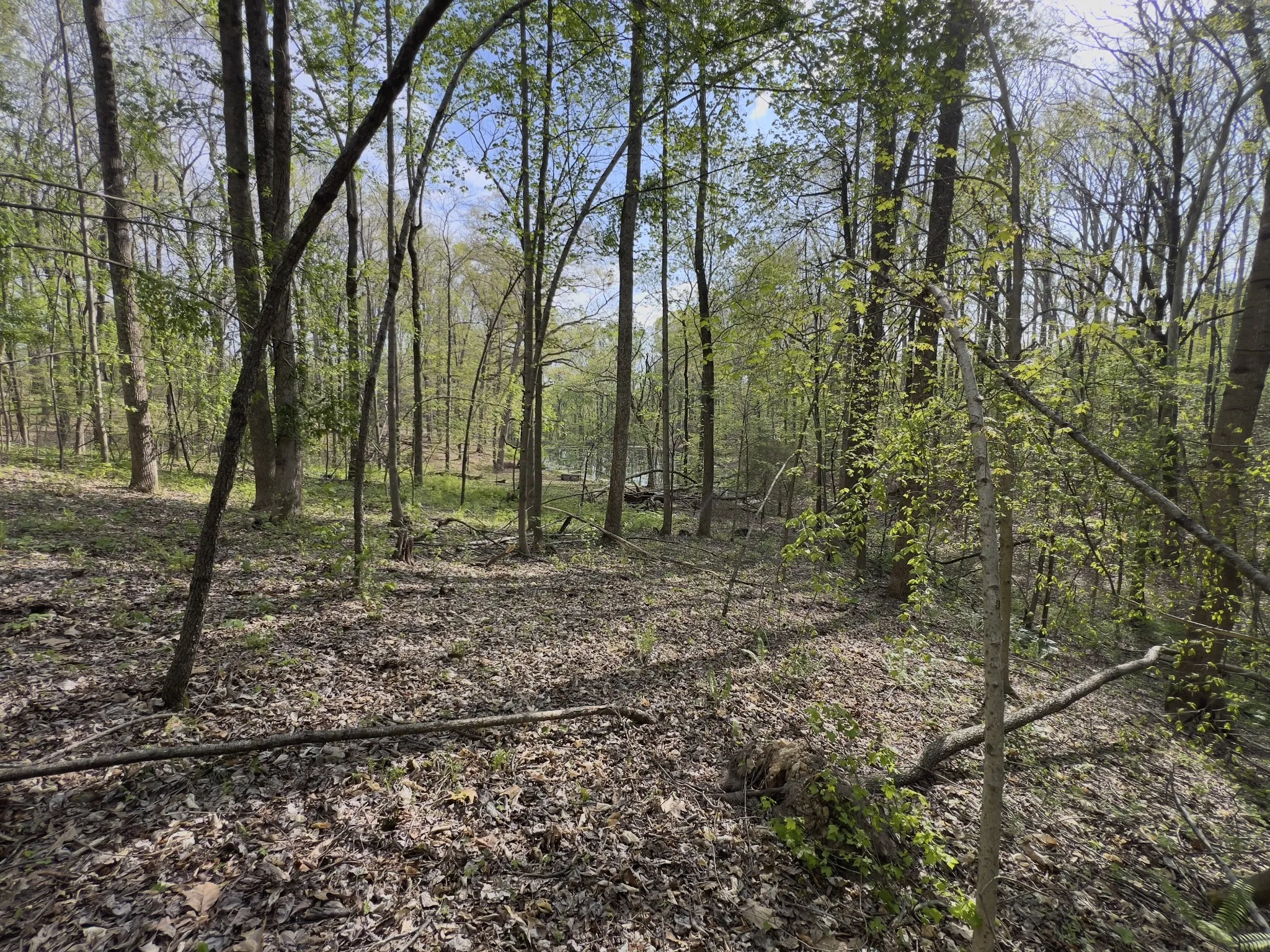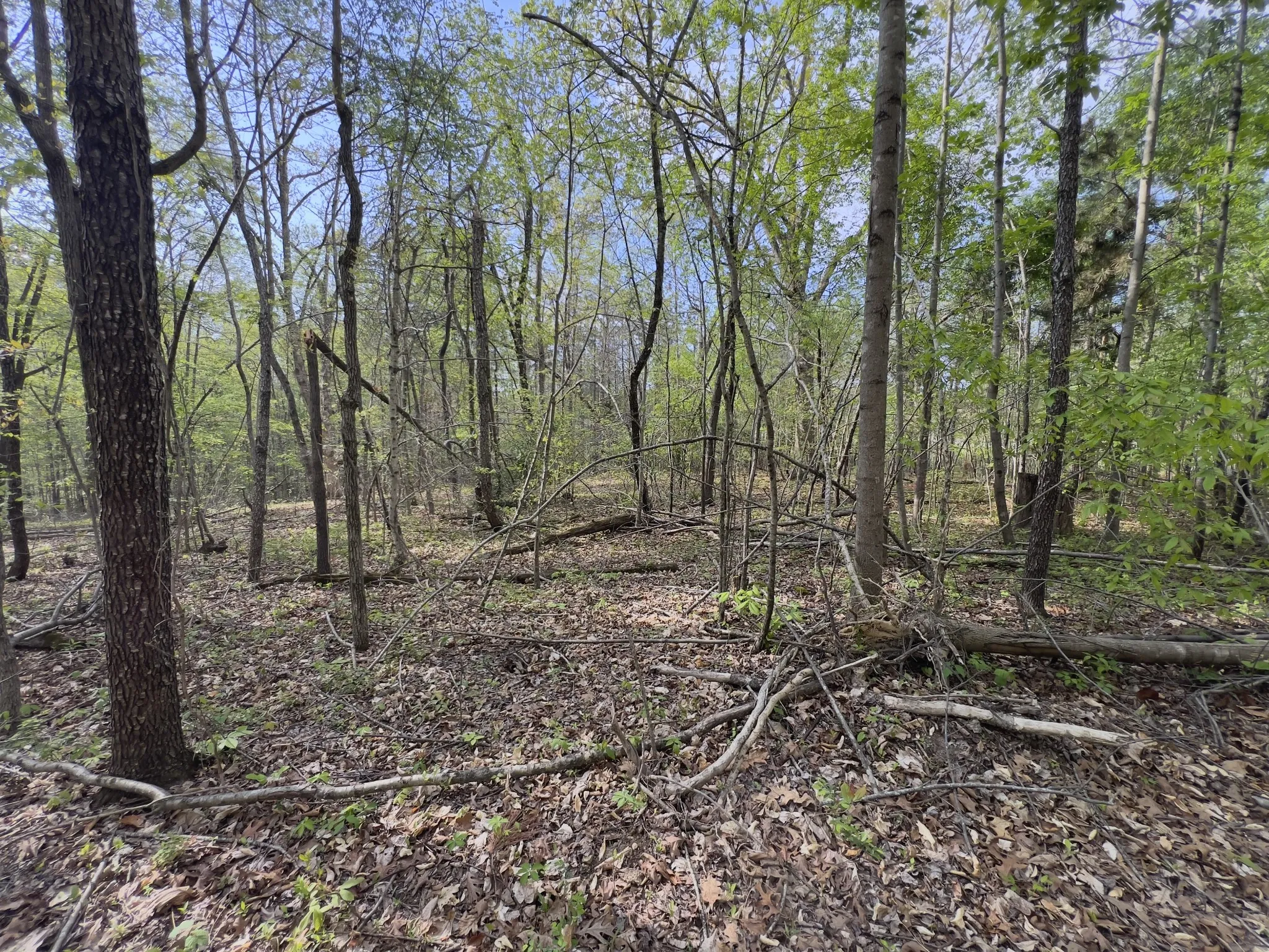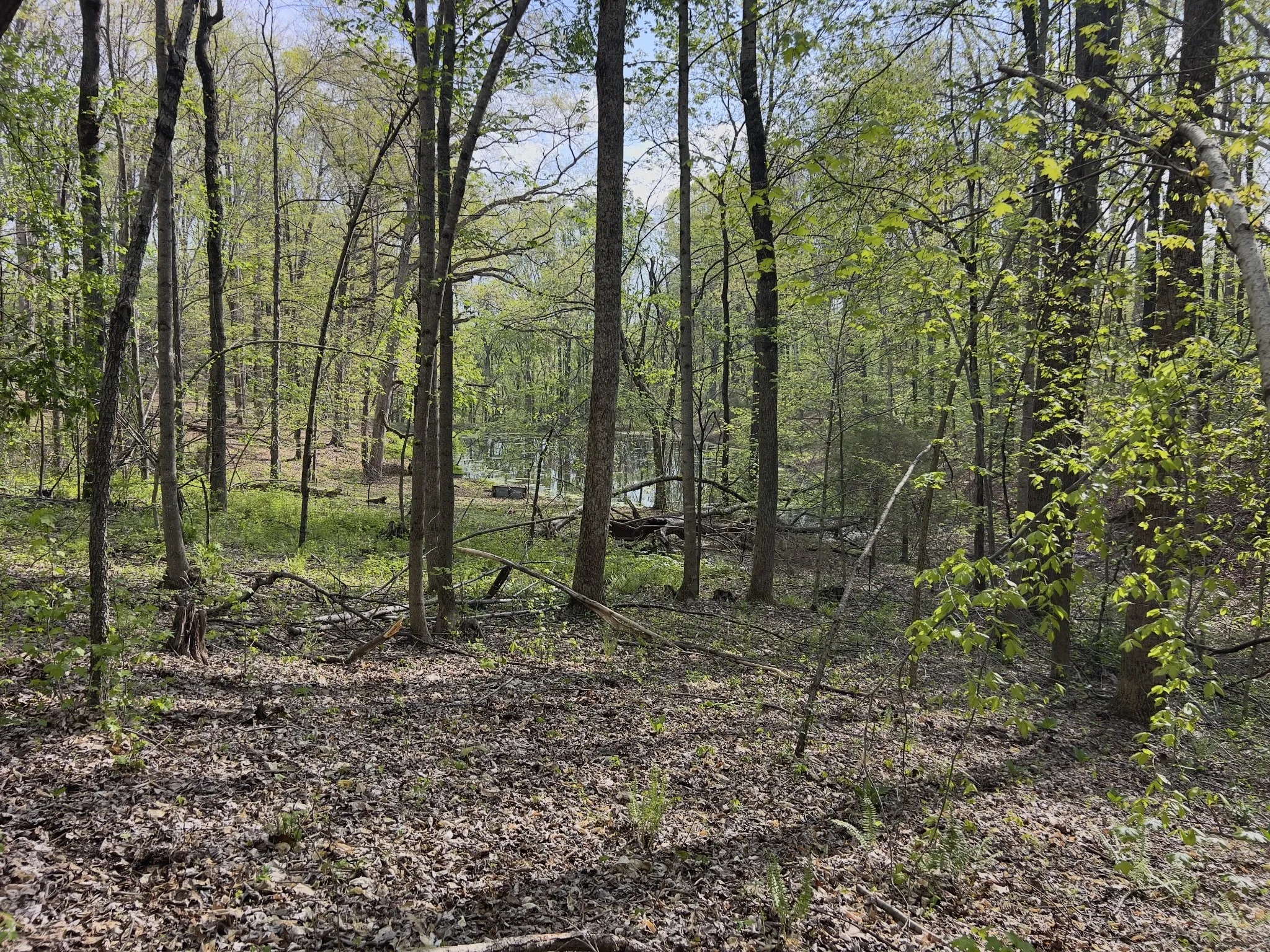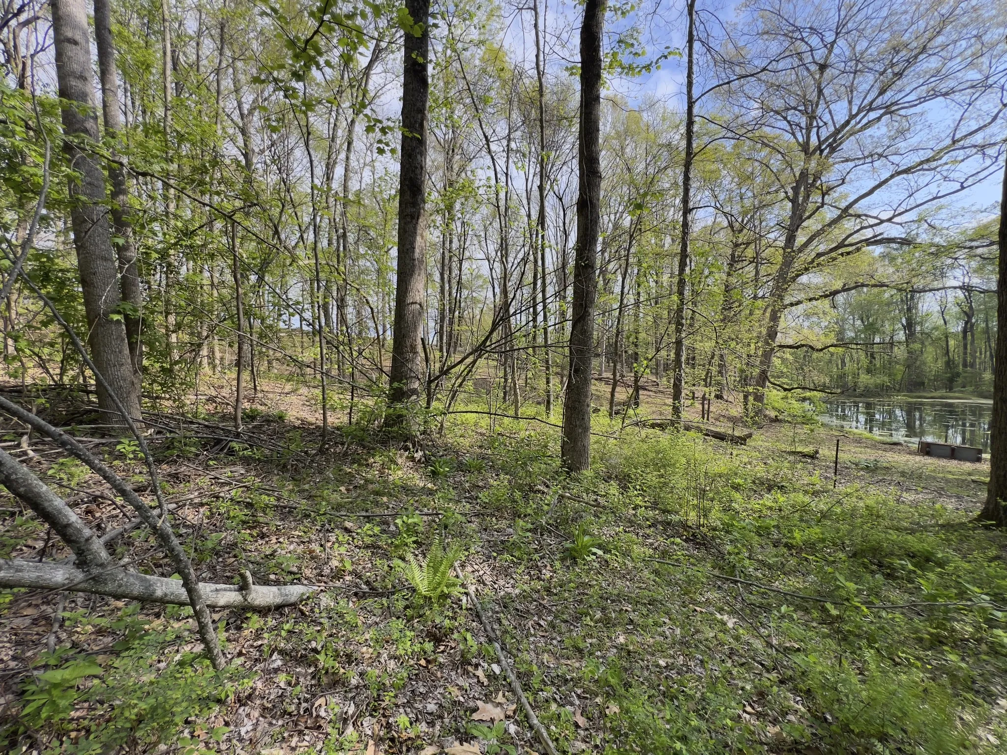 The land features mature timber with a mix of level to gently sloping terrain, ideal for a custom home site. Scenic surroundings with a neighboring pond add to the overall appeal.