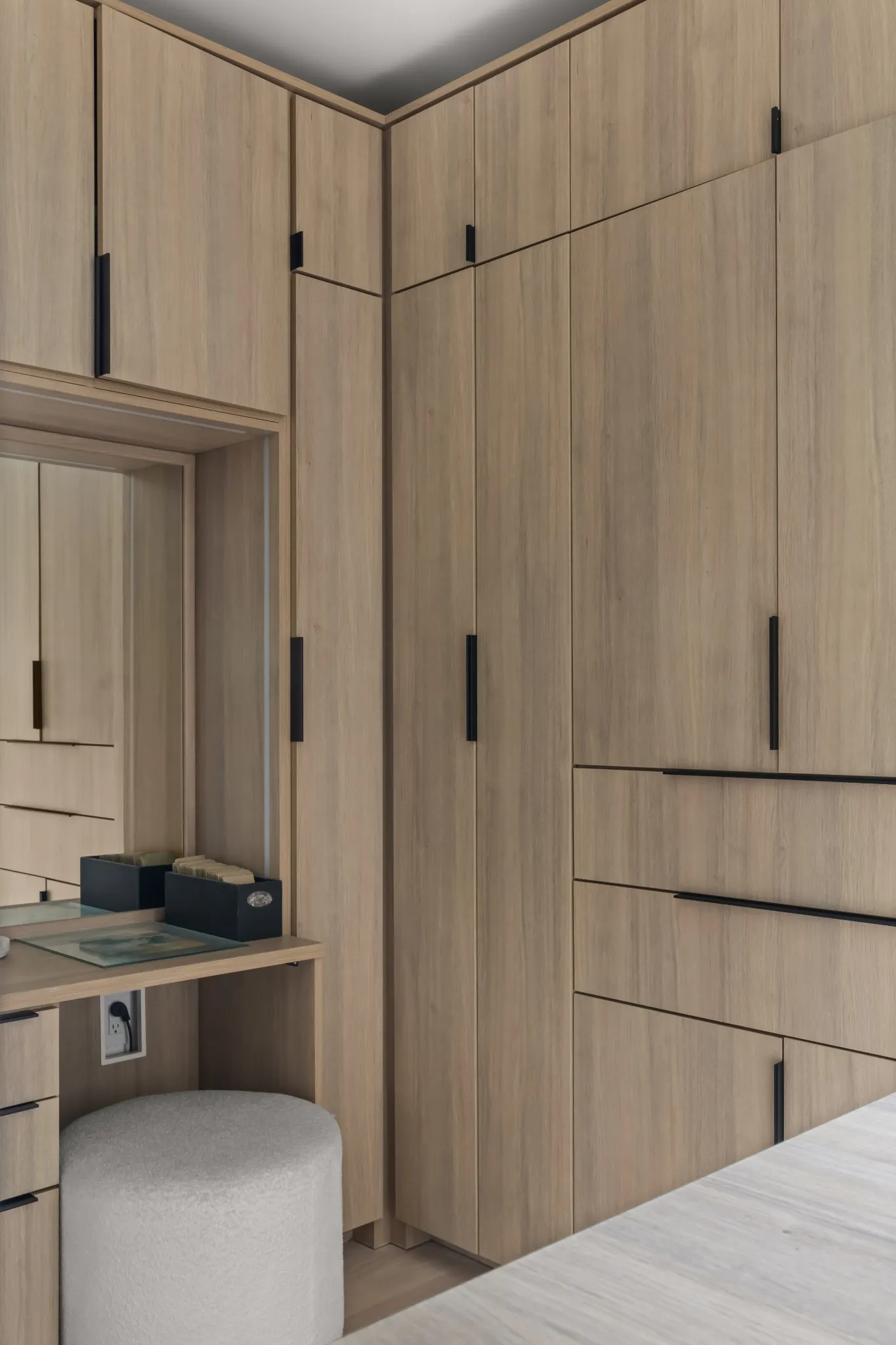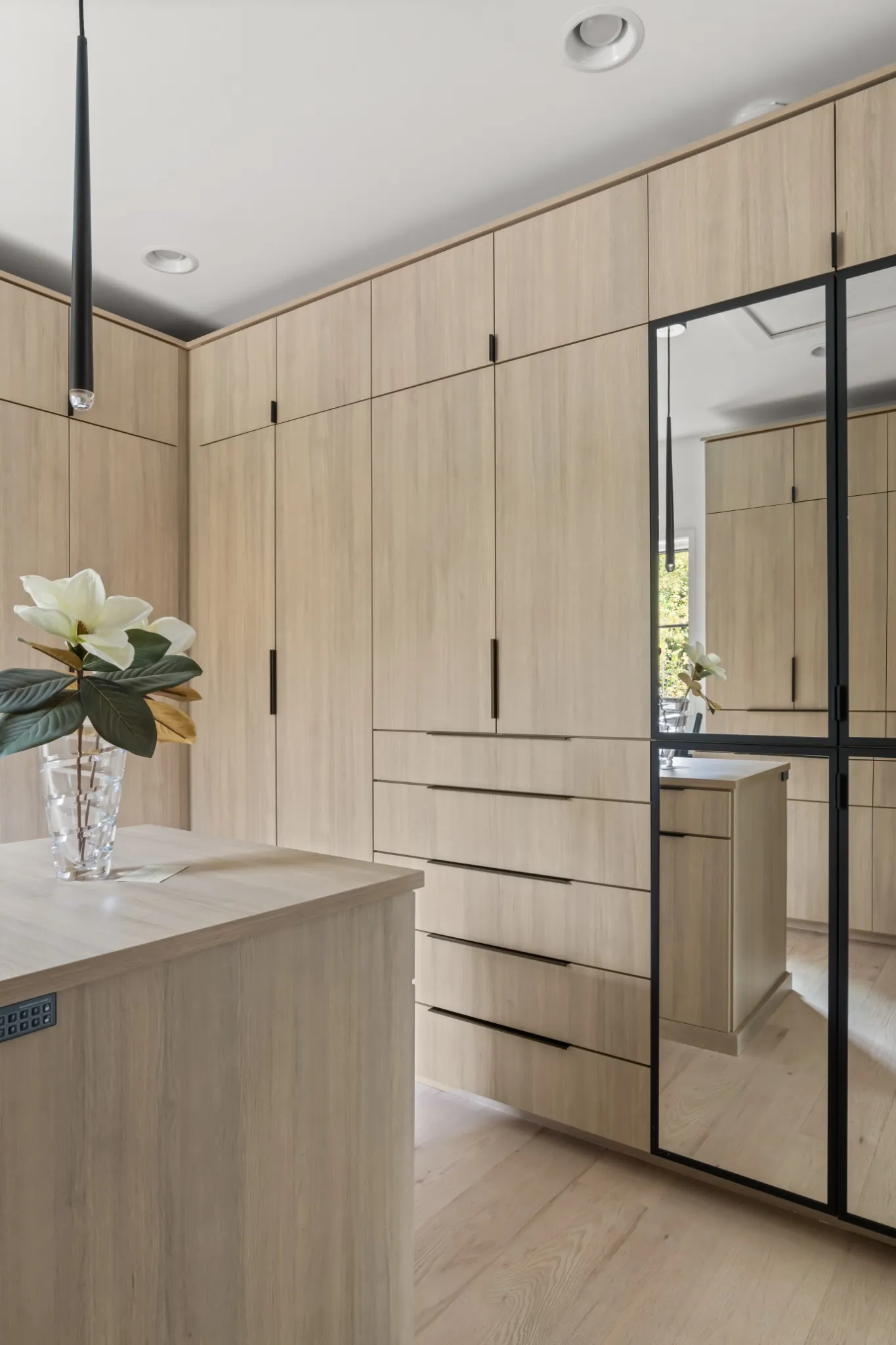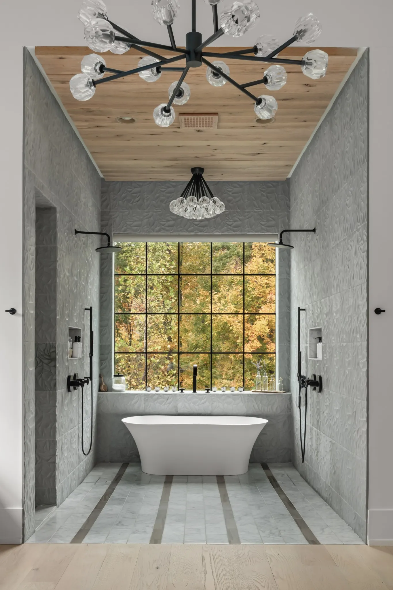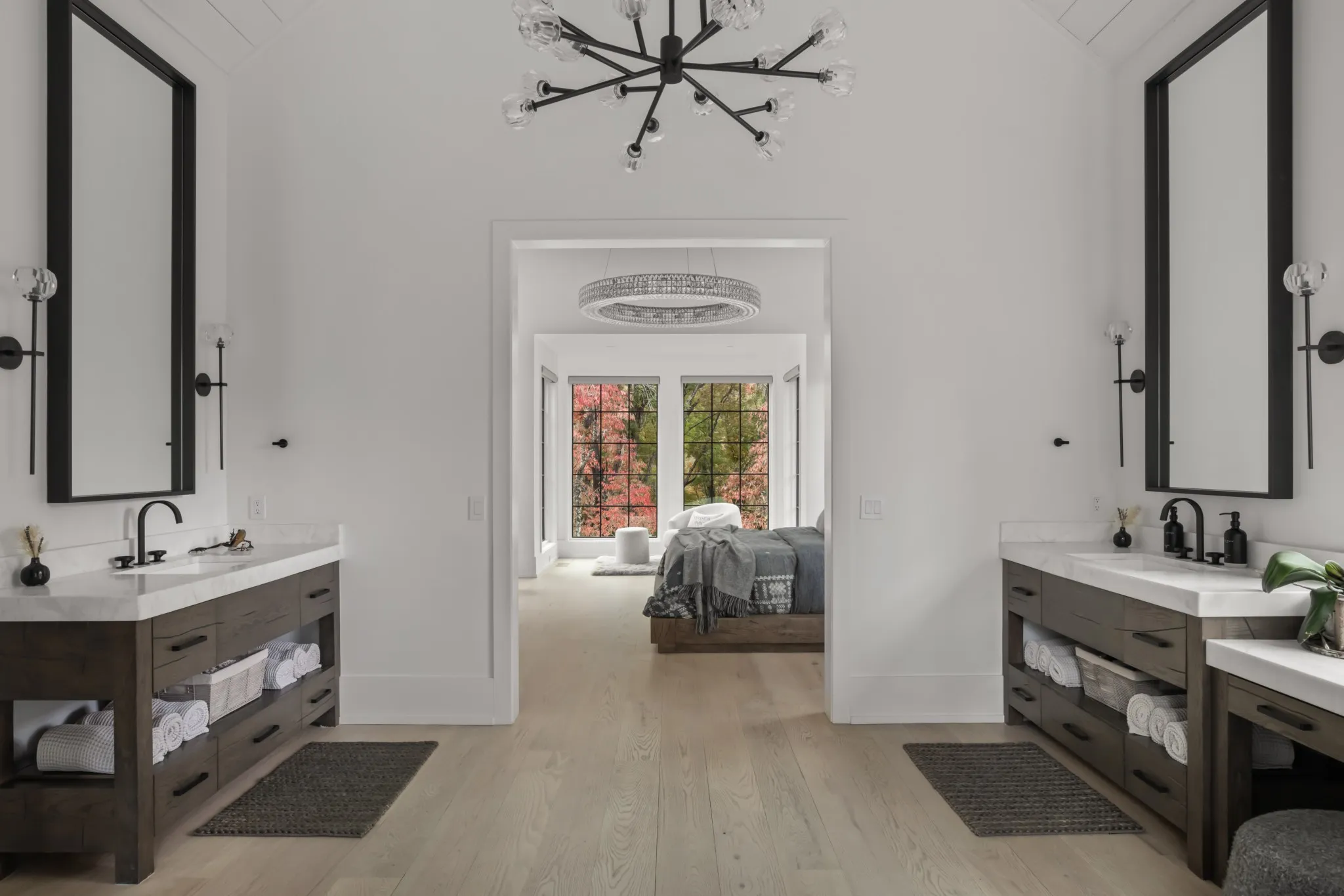The private primary suite offers treetop views, its own fireplace, a sitting area, spa-like bath with soaking tub, dual showers and vanities, and a custom closet with premium cabinetry and built-ins.