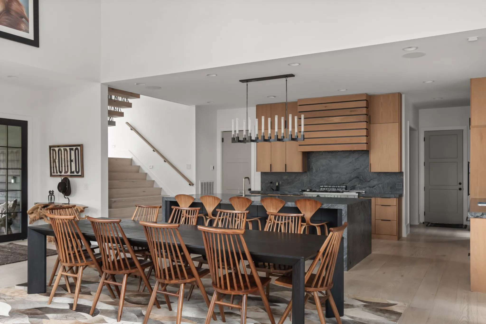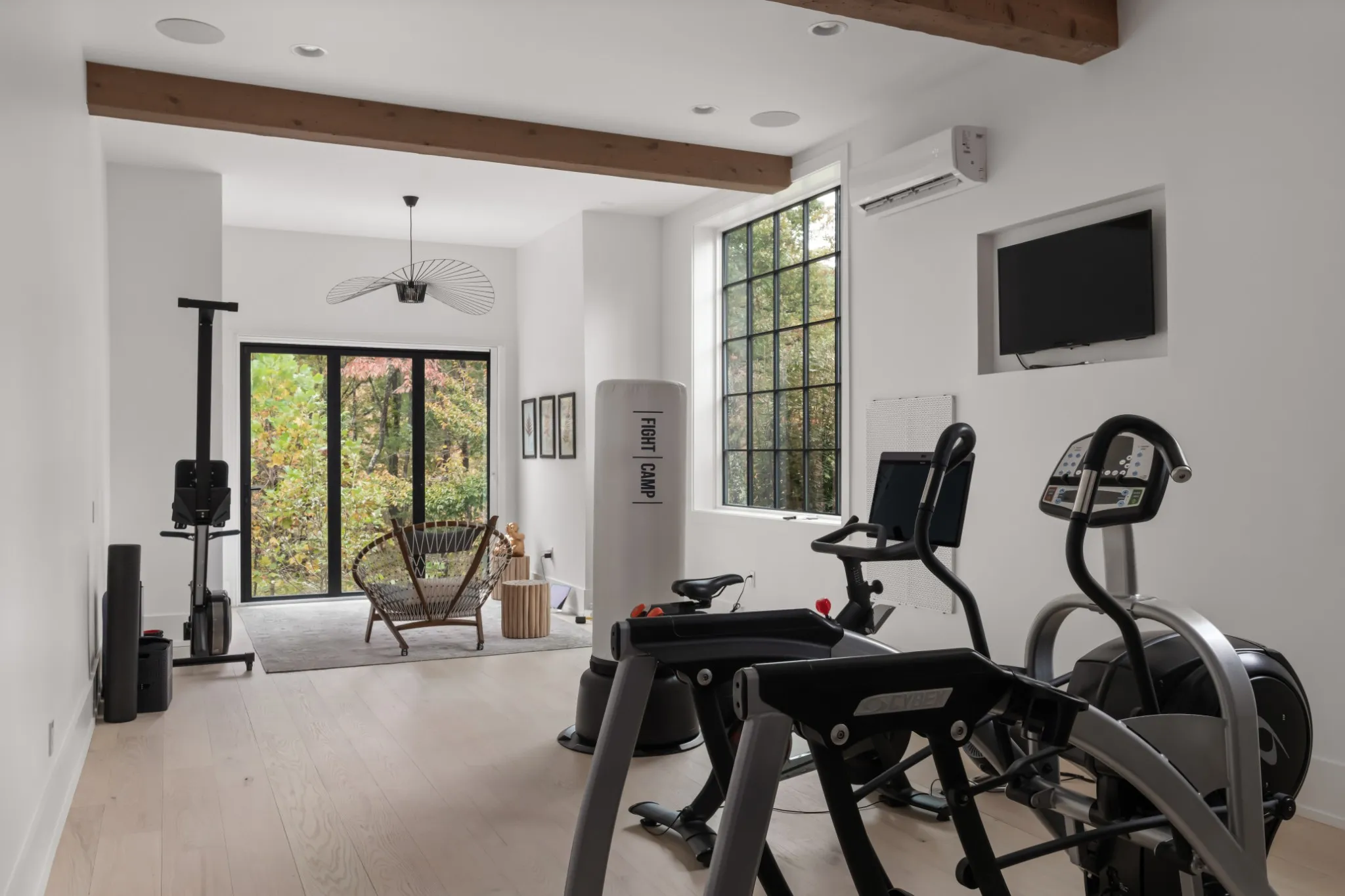 Designed for both wellness and entertaining, the home includes a gym with a nano wall opening to the outdoors, a Sunlighten sauna, and a custom home theater. Functional highlights include a 3-car garage with lift, mudroom with built-ins, desk station, working pantry, bar area, and laundry room. Upstairs are three additional bedroom suites and a kids’ den.