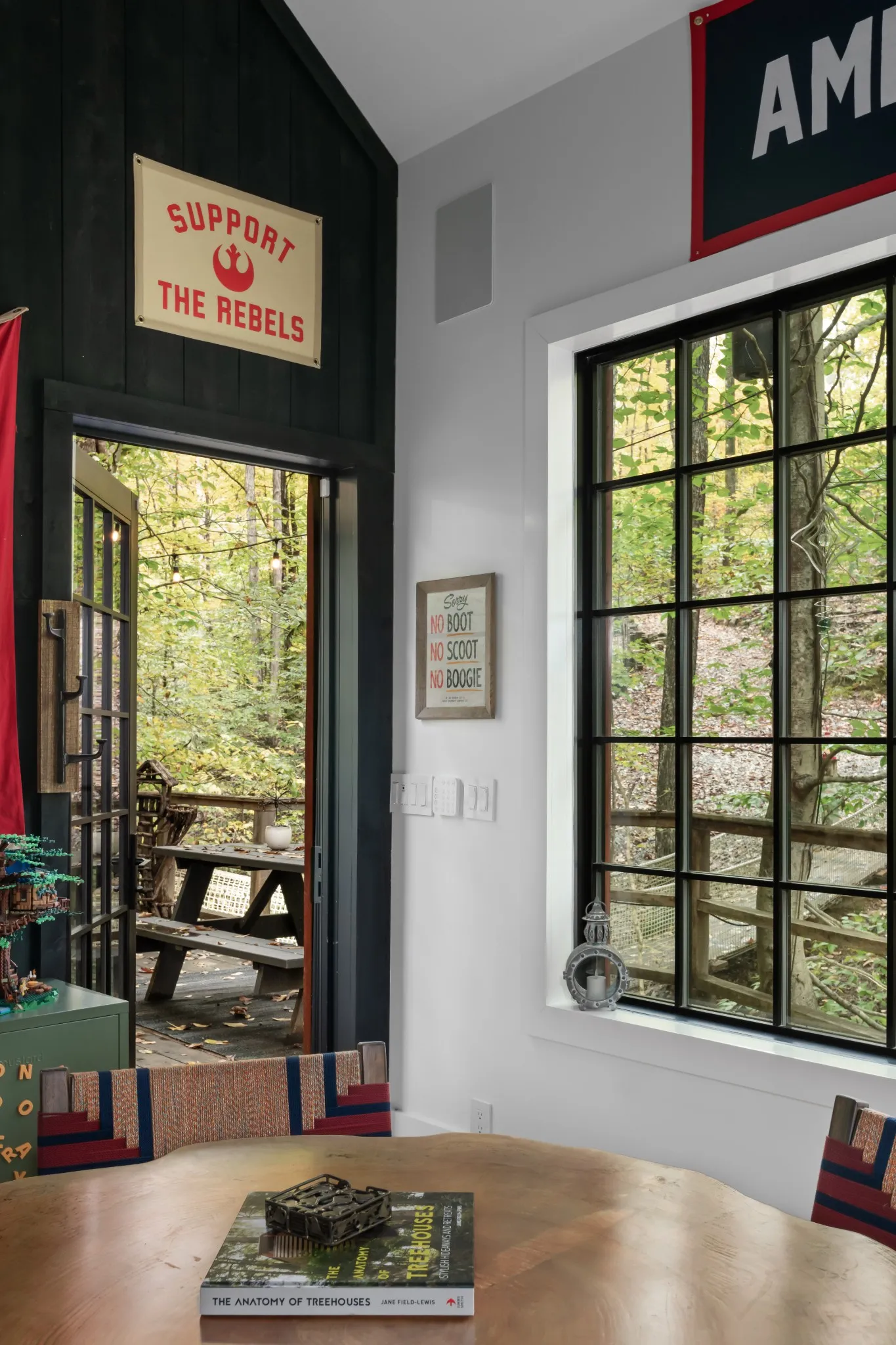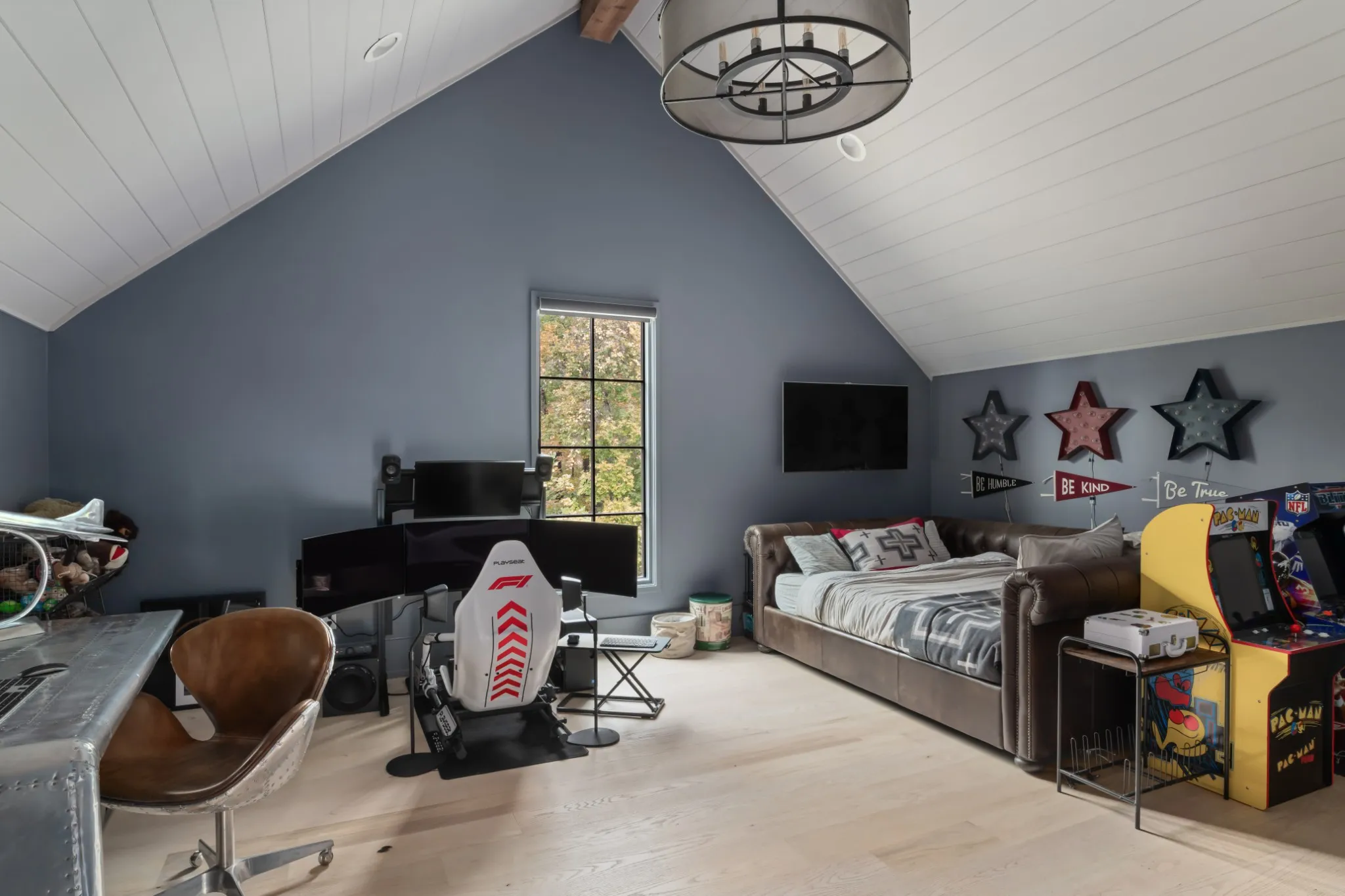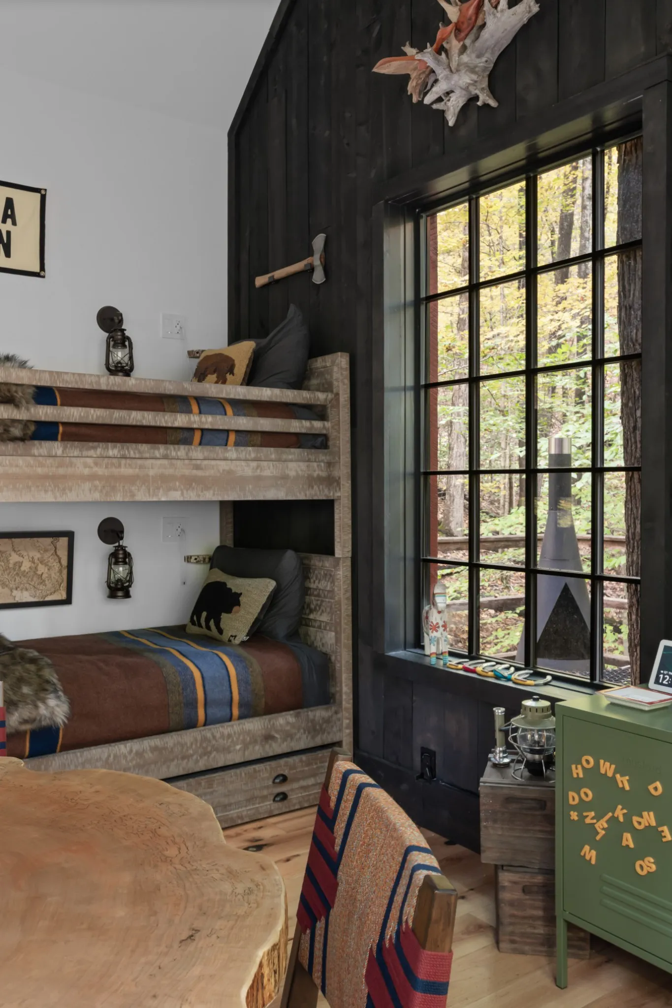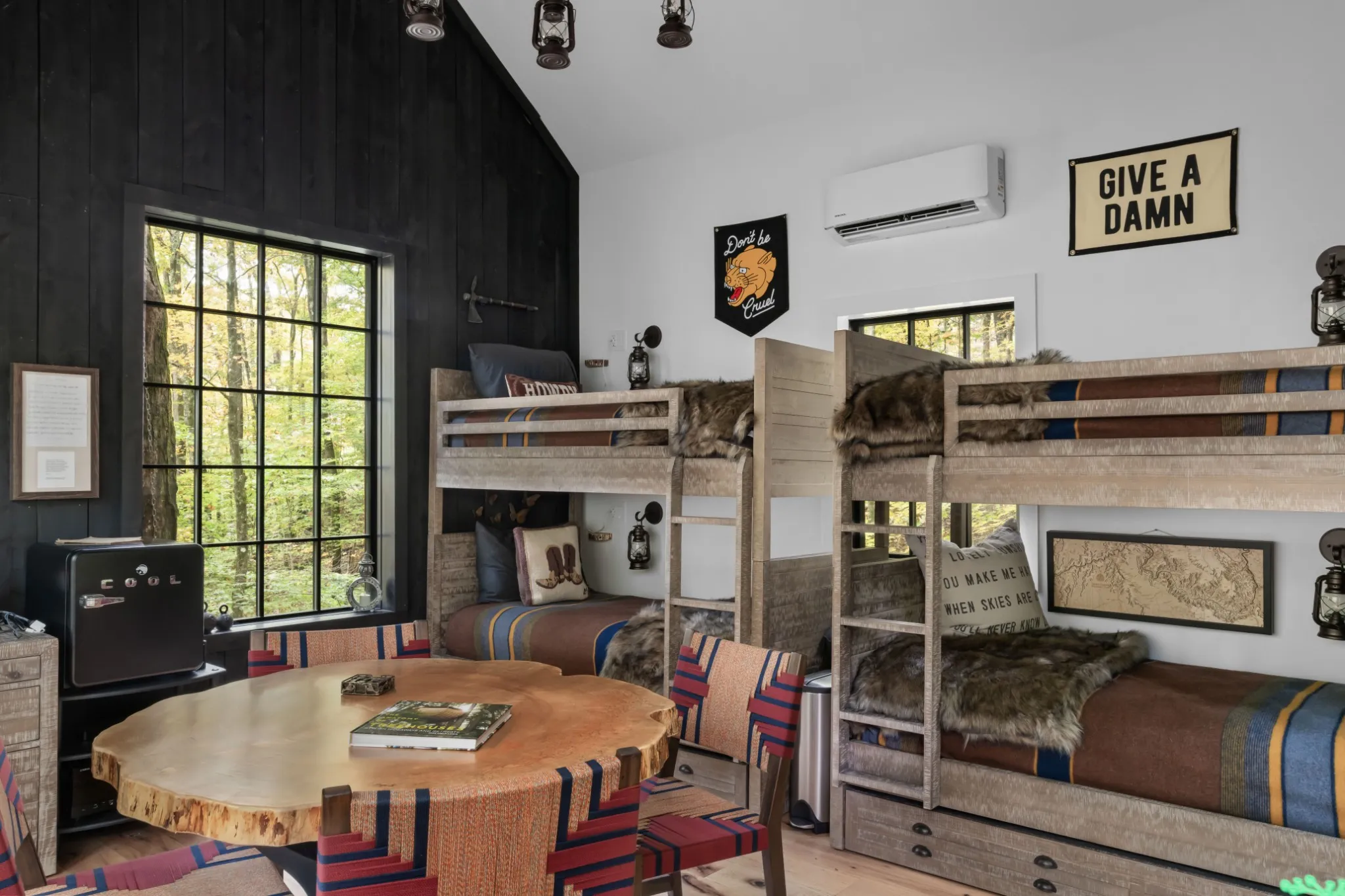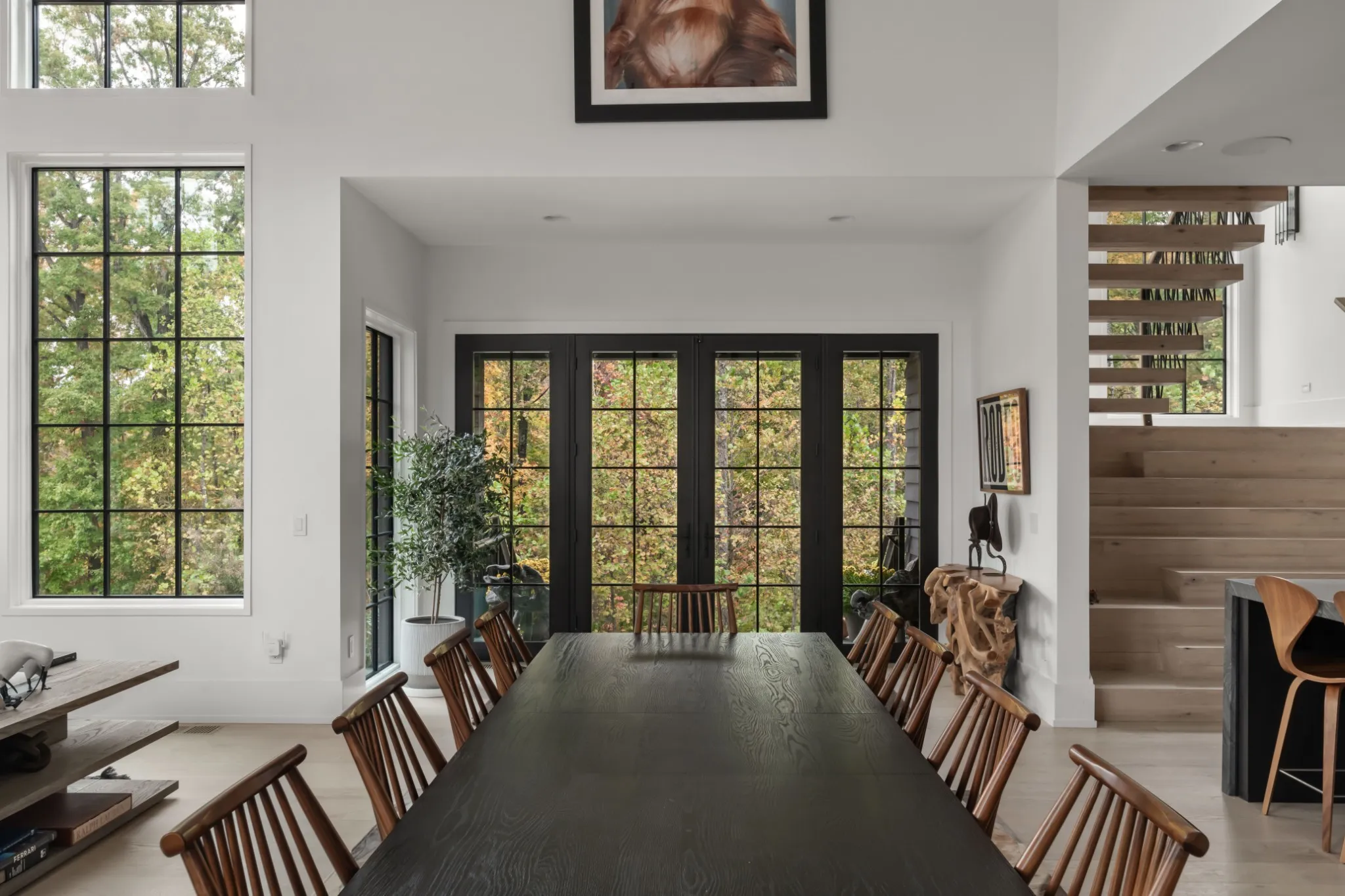 The soaring living room anchors the home with double-height ceilings, exposed beams, and a wood-burning fireplace. Hand-milled hardwood floors—crafted from trees cleared on-site—add rare authenticity and character.