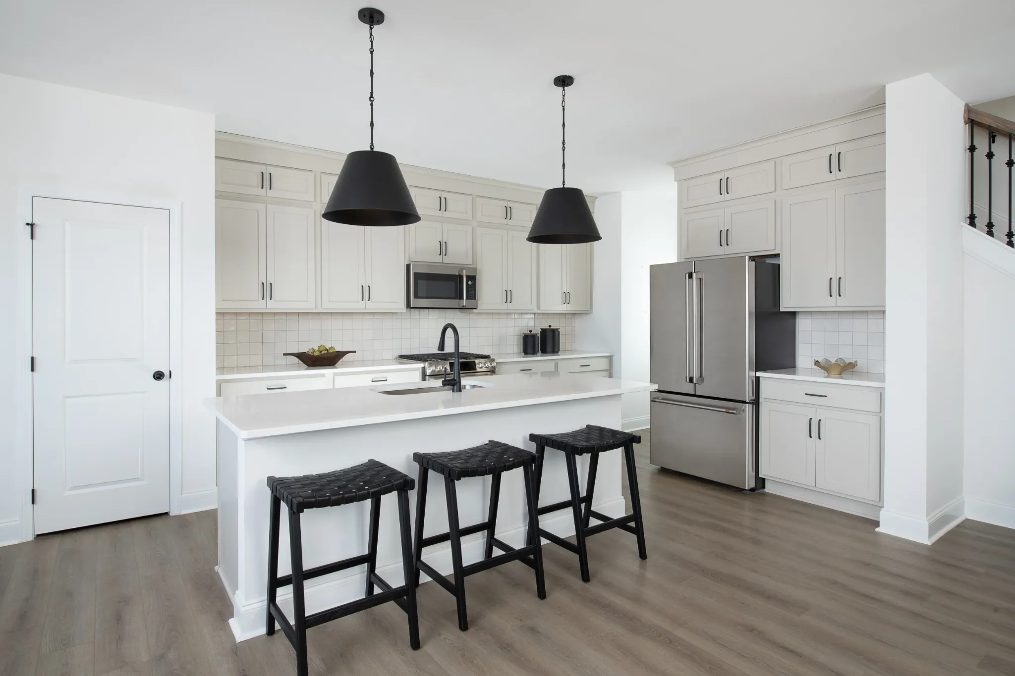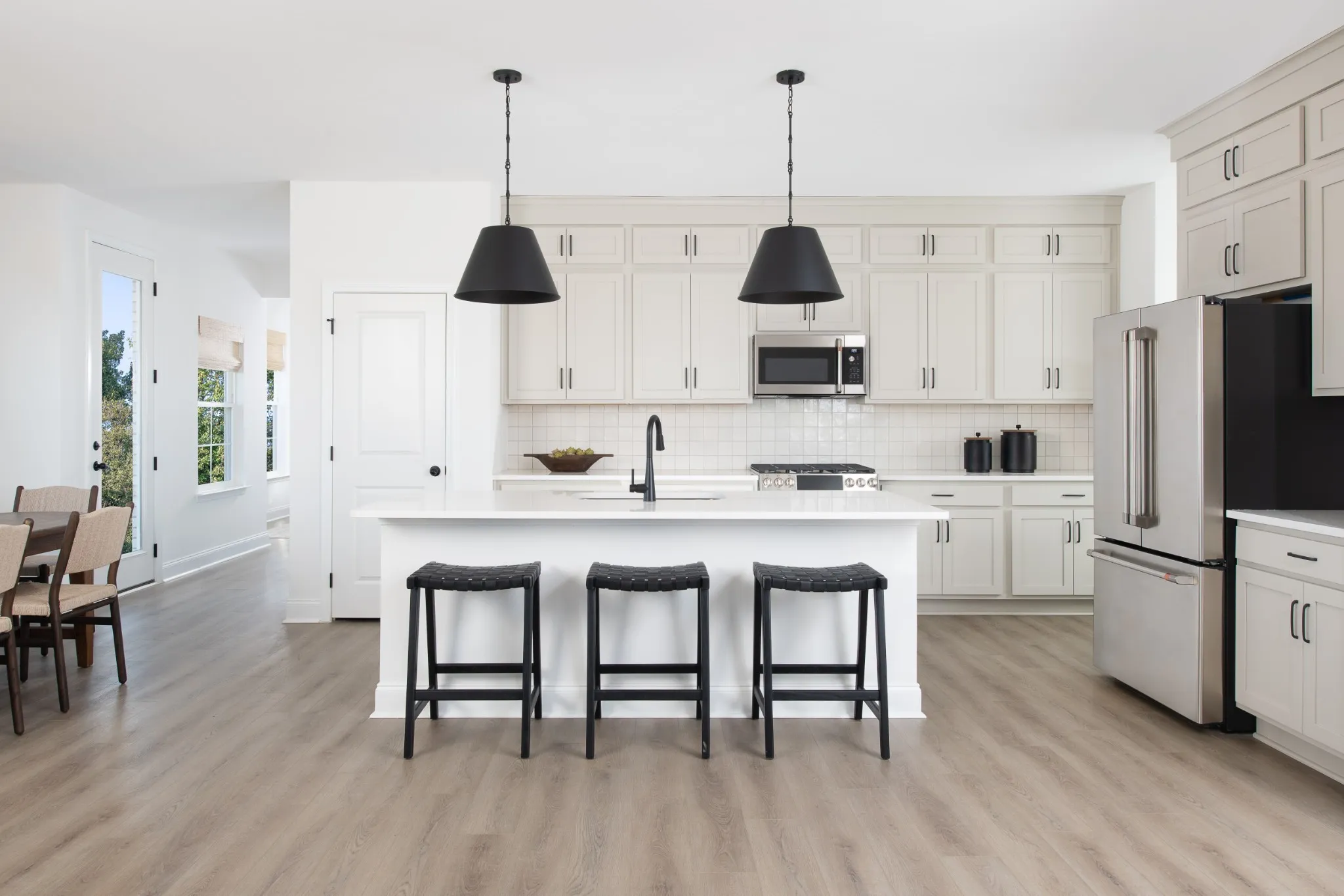 Professionally curated with the Artisan Collection, the kitchen offers gray mist cabinetry with soft-close doors, quartz countertops, and a 4″ x 4″ tile backsplash. Abundant windows invite natural light into every corner, highlighting the clean lines, airy ambiance, and carefully selected finishes that bring warmth and sophistication to the space. A refrigerator and window blinds are also included, making move-in simple and convenient from day one.