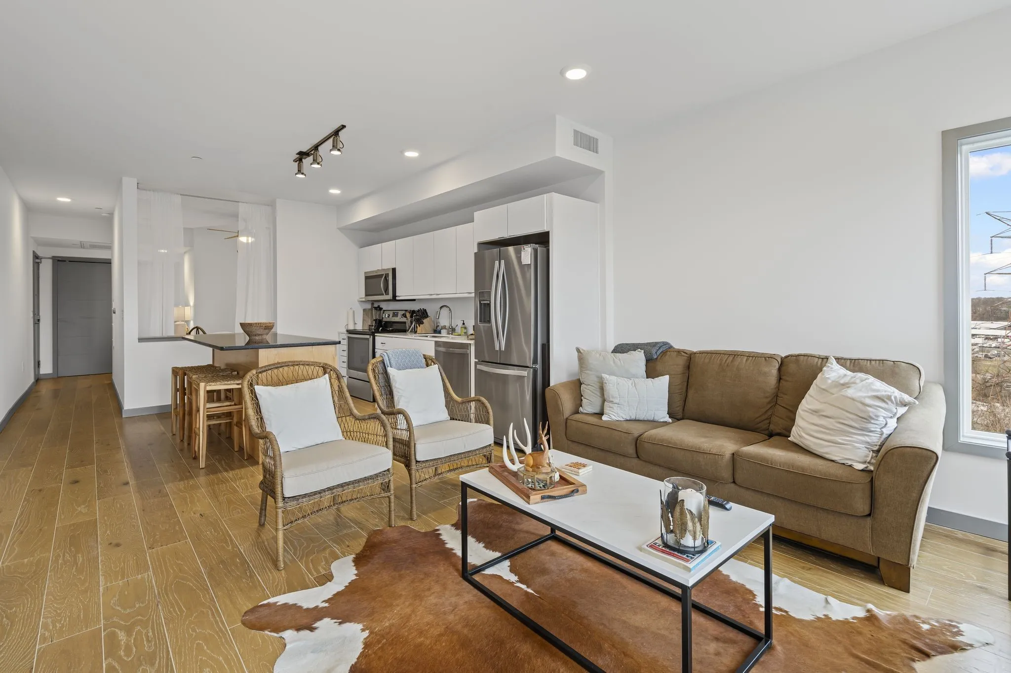 Here it is, the one you’ve been looking for! Desirable end unit with a large balcony facing the pool, Nashville skyline and Geodis Soccer Park! Freshly painted, adorable one bedroom, full bath with large shower and a fabulous walk-in closet w/stacked washer and dryer included. One of a kind custom kitchen island with granite countertop giving you extra storage, countertop space and seating! Stainless steel appliances, fridge remains, quartz countertops and white cabinets all open to your large living room with extra corner window. Awesome clubroom that owners can rent out for free and includes a full kitchen, living room with large TV, office space w/ WIFI and a private board room. In-ground pool to hang and get to know your friendly neighbors. Dog park on the premesis as well! Also on-site short term rentals available to owners w/potential discount. You will love the location, 2.5 miles to downtown and short 10 minute drive to airport. Lots to love!***100% Financing and No PMI Available with Preferred lender through The Affordable housing Program for an Owner Occupant***