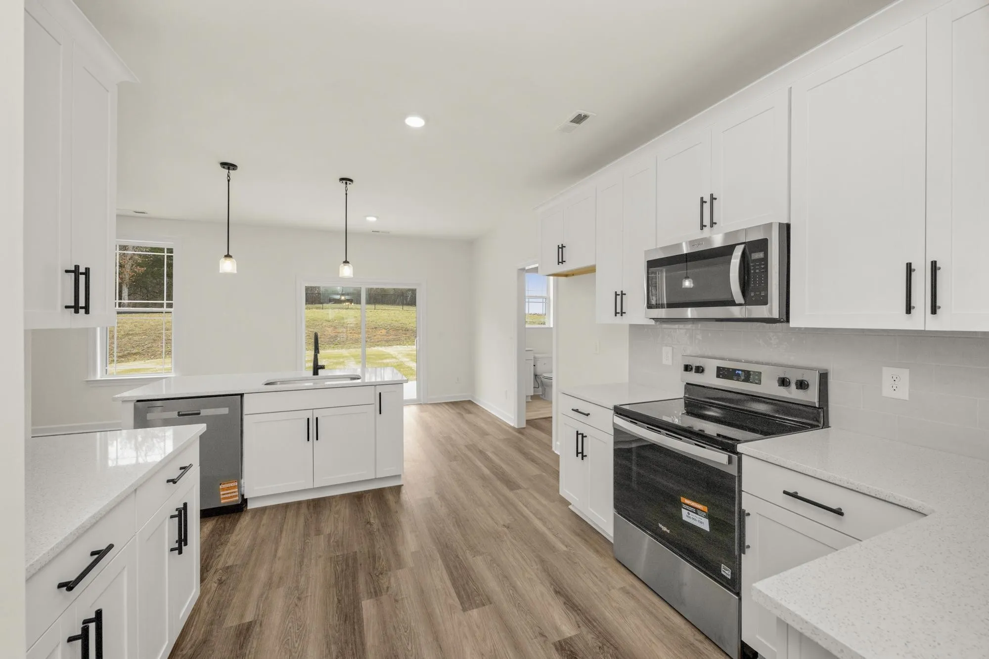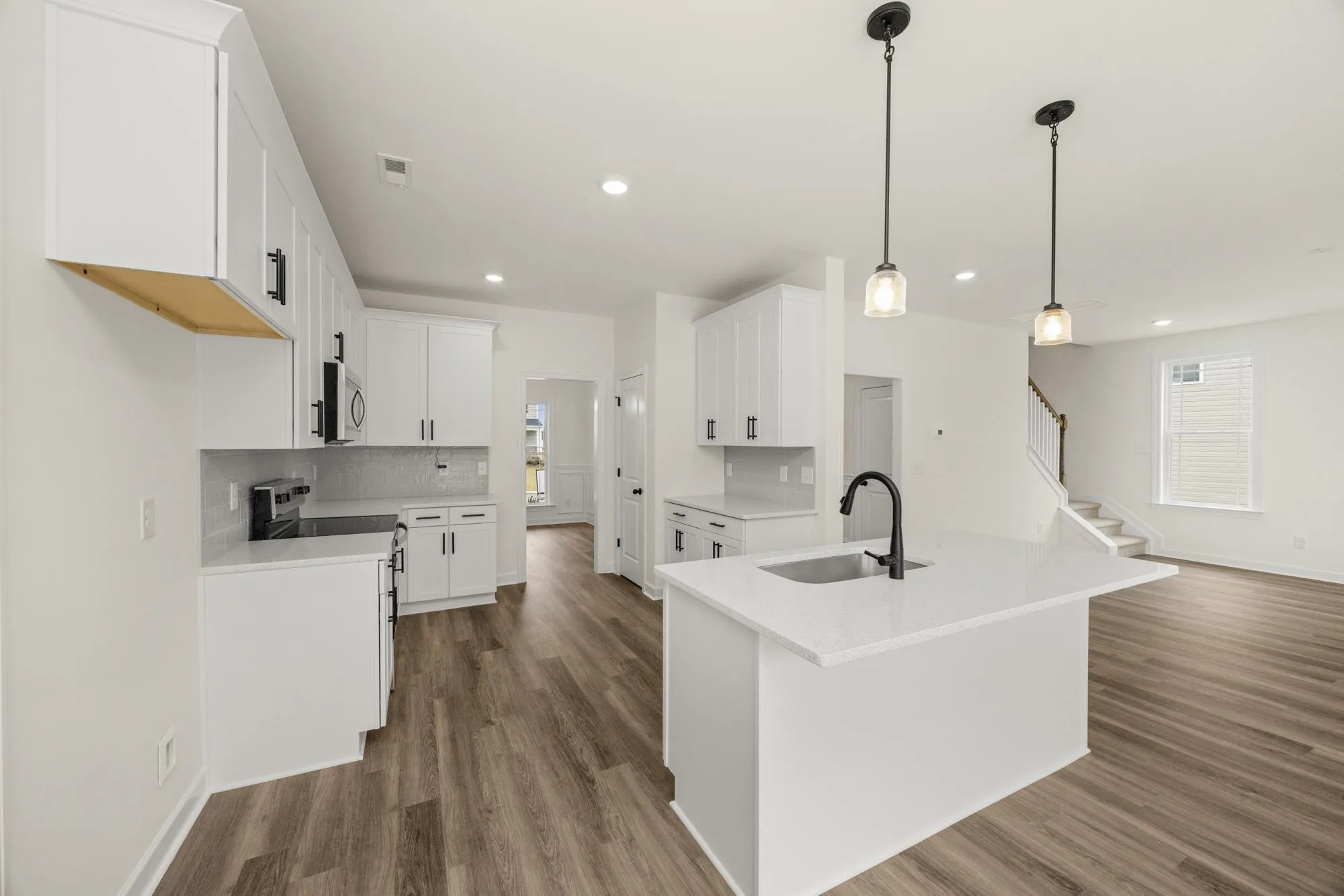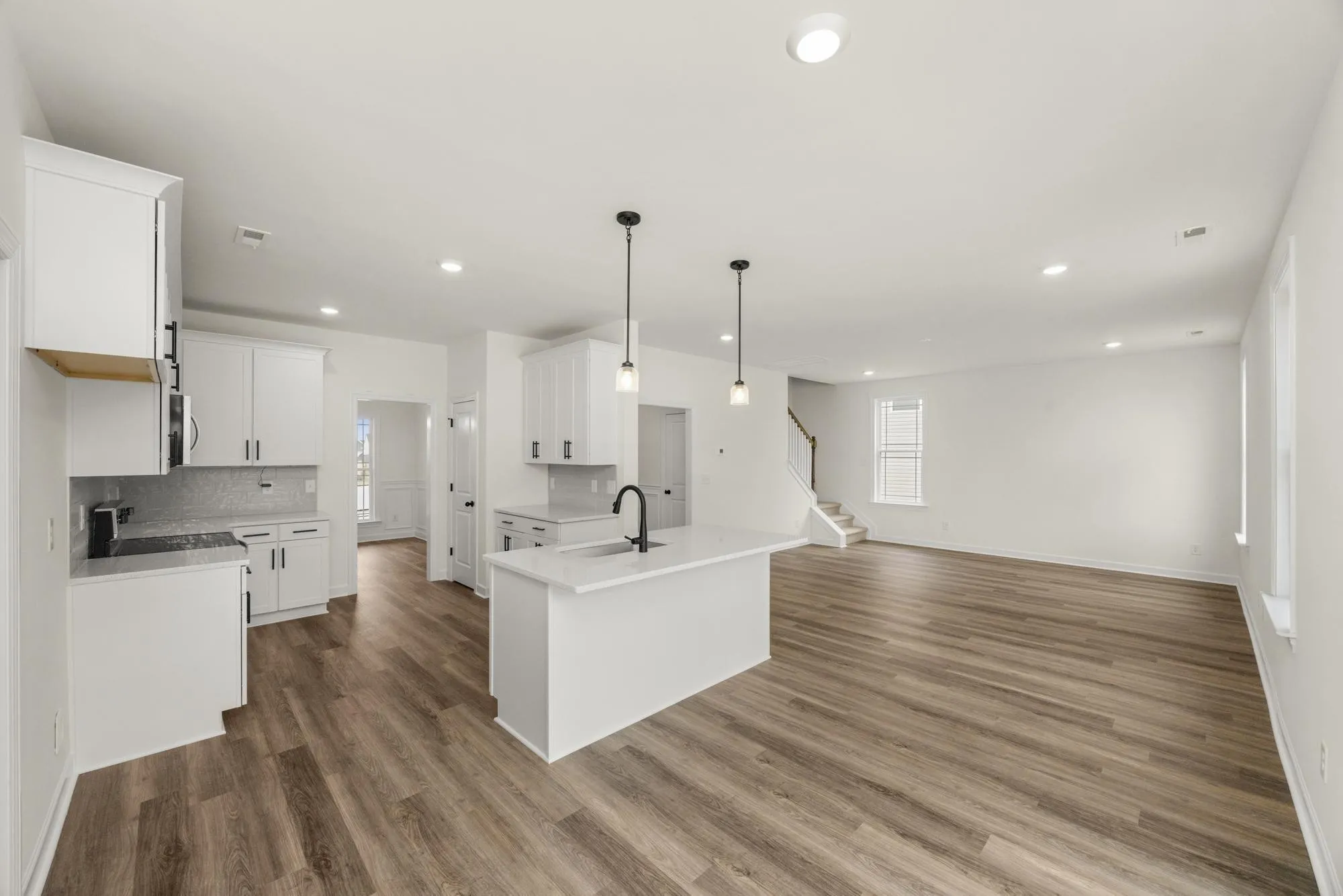 Welcome home to the Lockwood 3, a stunning, move-in-ready home offering over 3,000 square feet of thoughtfully designed living space. The main floor features beautiful luxury vinyl plank flooring and modern matte black fixtures throughout, creating a sleek and cohesive look. You’ll find a private home office behind elegant French doors, as well as a guest bedroom and full bath perfect for visitors. The heart of the home is the chef-inspired kitchen, complete with 42″ white shaker soft-close cabinets, stainless steel appliances, and an oversized island that overlooks both formal and informal dining areas.