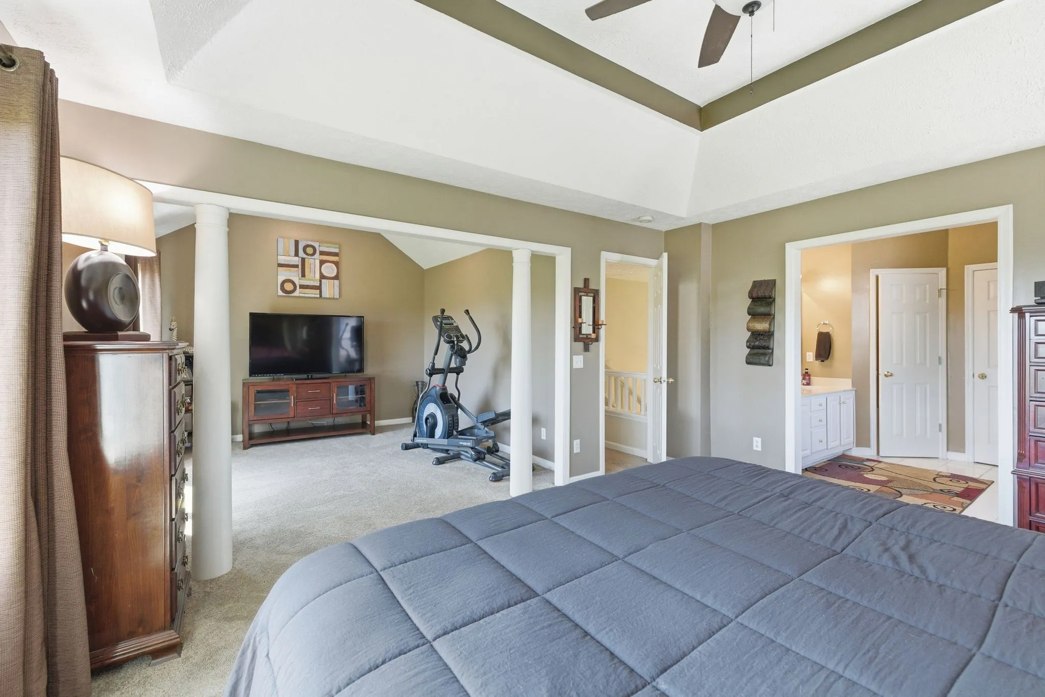Upstairs, the expansive primary suite serves as a true retreat, featuring a private sitting area, double vanities, a soaking tub, walk-in shower, and a generous walk-in closet. Two additional bedrooms and a full bath provide comfortable accommodations for family or guests.