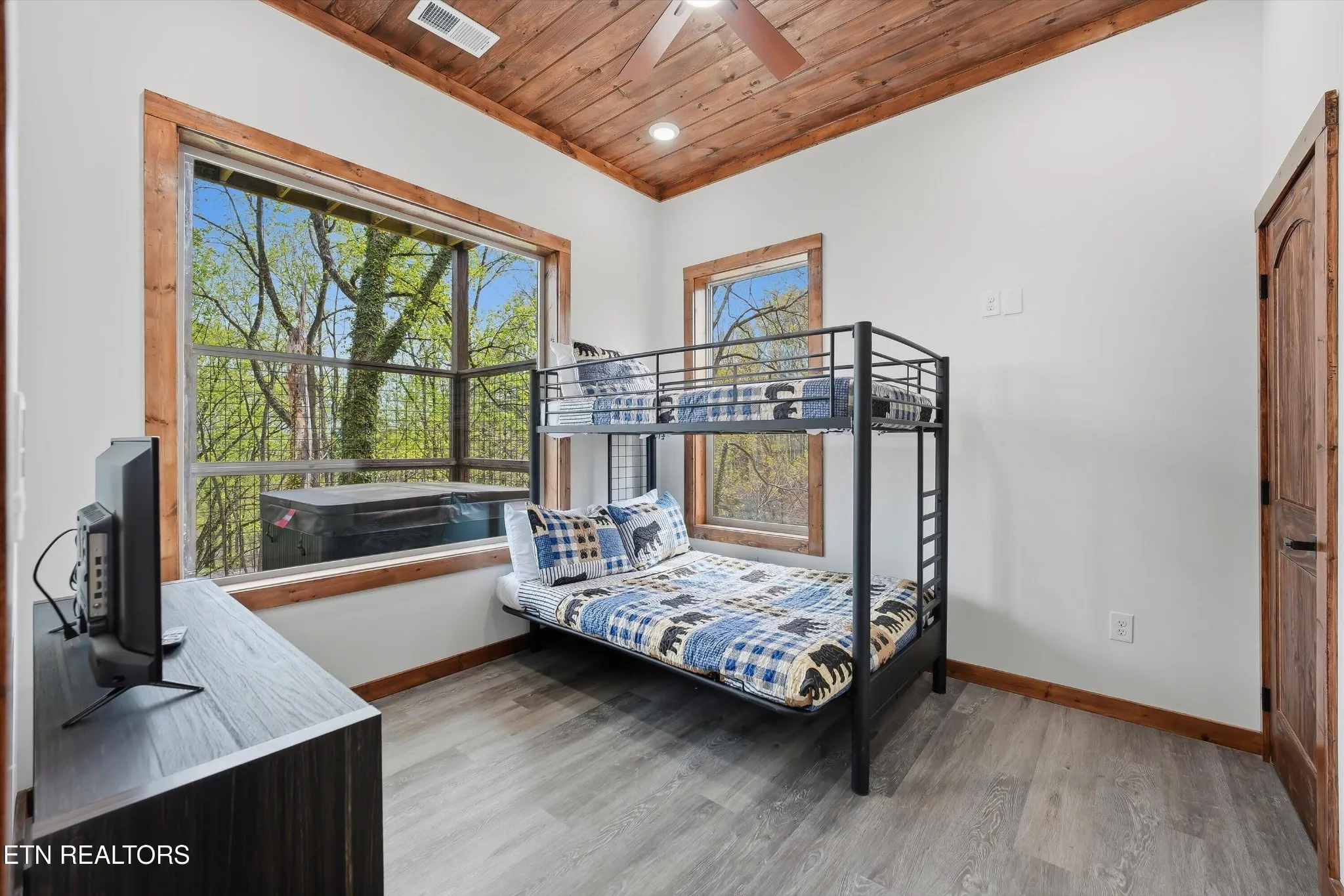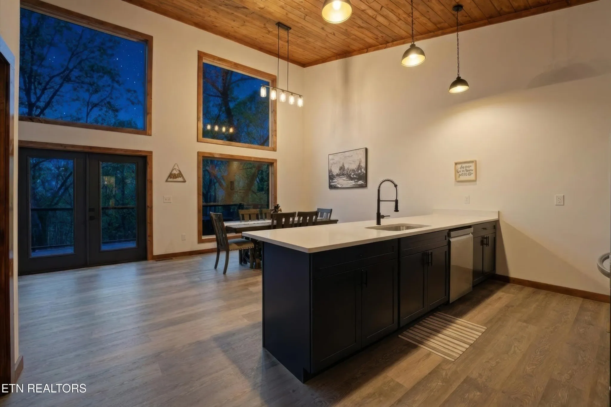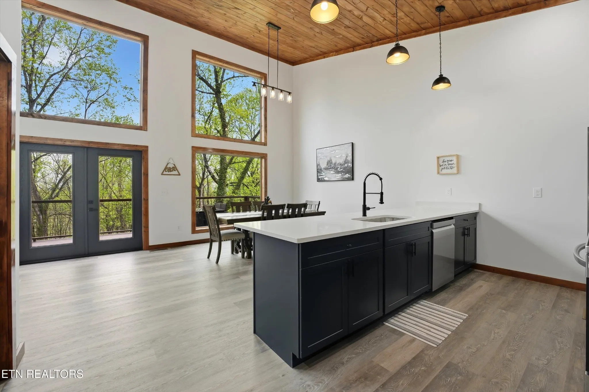 Perfectly situated in a prime Gatlinburg location, this brand-new cabin blends modern style with stunning views – an ideal opportunity for an income-producing overnight rental or personal mountain retreat. The open living space, framed by vaulted wooden ceilings and expansive windows, is designed to keep the scenery front and center. Luxury vinyl flooring flows into a chic kitchen featuring bold blue cabinetry, bright white countertops, and stainless steel appliances. Just off the dedicated dining area, French doors open to a wide deck – perfect for guests to relax and take in the fresh mountain air.