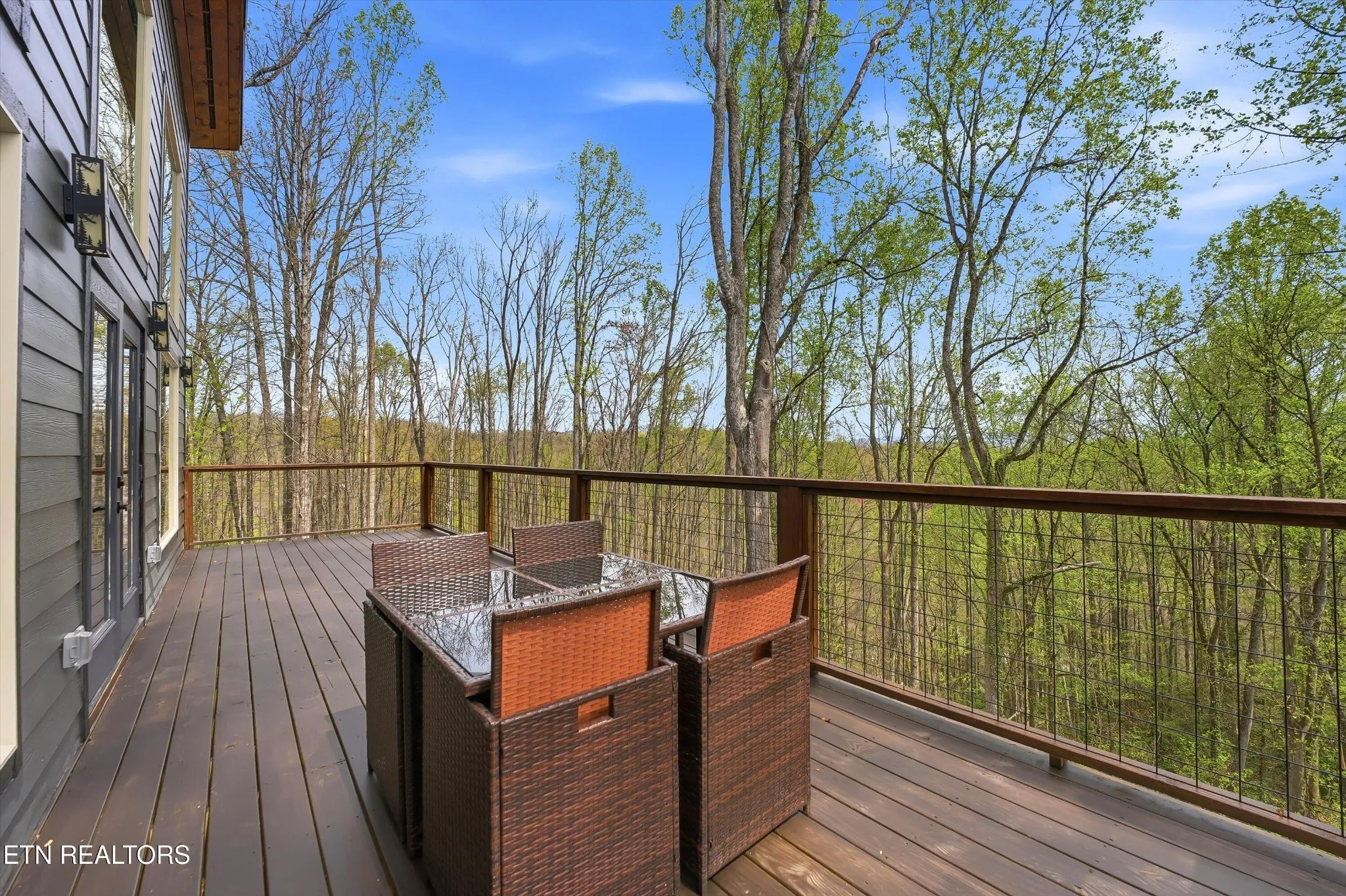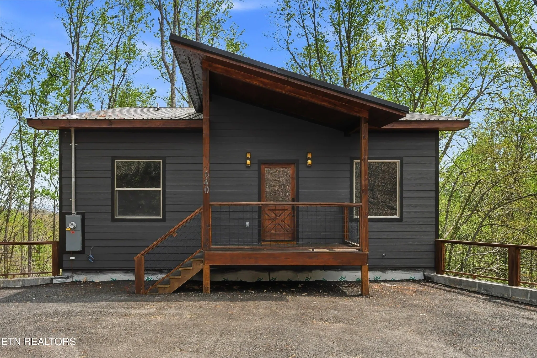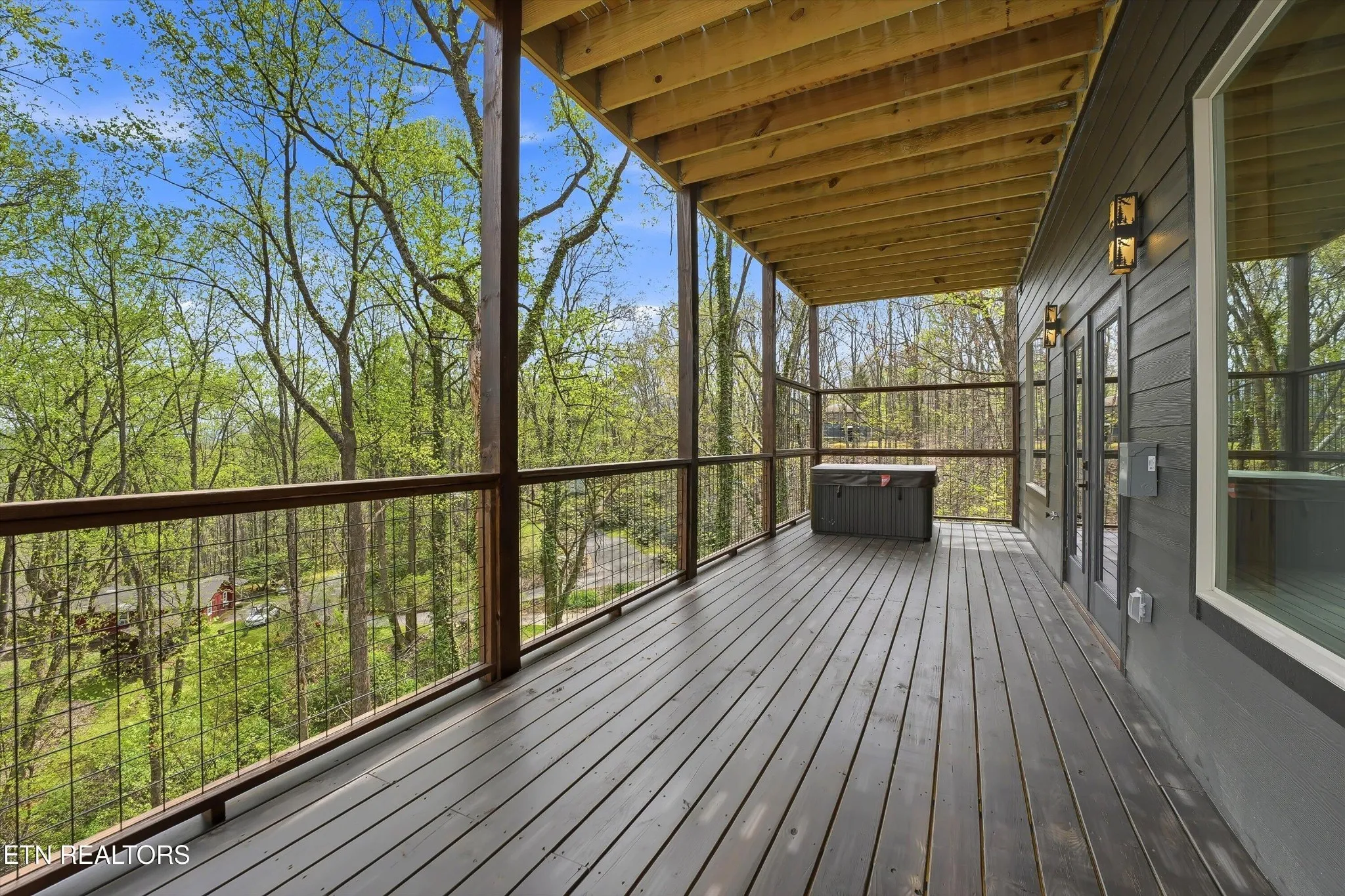 Perfectly situated in a prime Gatlinburg location, this brand-new cabin blends modern style with stunning views – an ideal opportunity for an income-producing overnight rental or personal mountain retreat. The open living space, framed by vaulted wooden ceilings and expansive windows, is designed to keep the scenery front and center. Luxury vinyl flooring flows into a chic kitchen featuring bold blue cabinetry, bright white countertops, and stainless steel appliances. Just off the dedicated dining area, French doors open to a wide deck – perfect for guests to relax and take in the fresh mountain air.