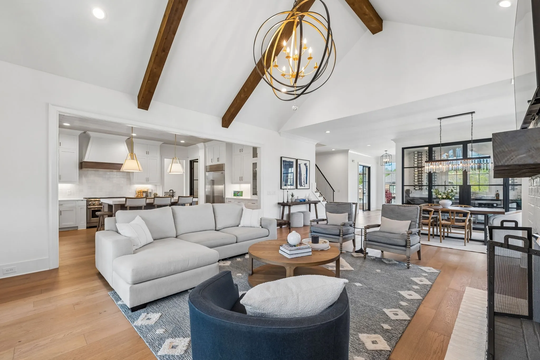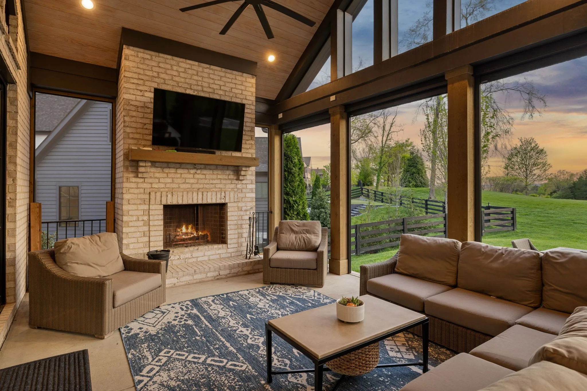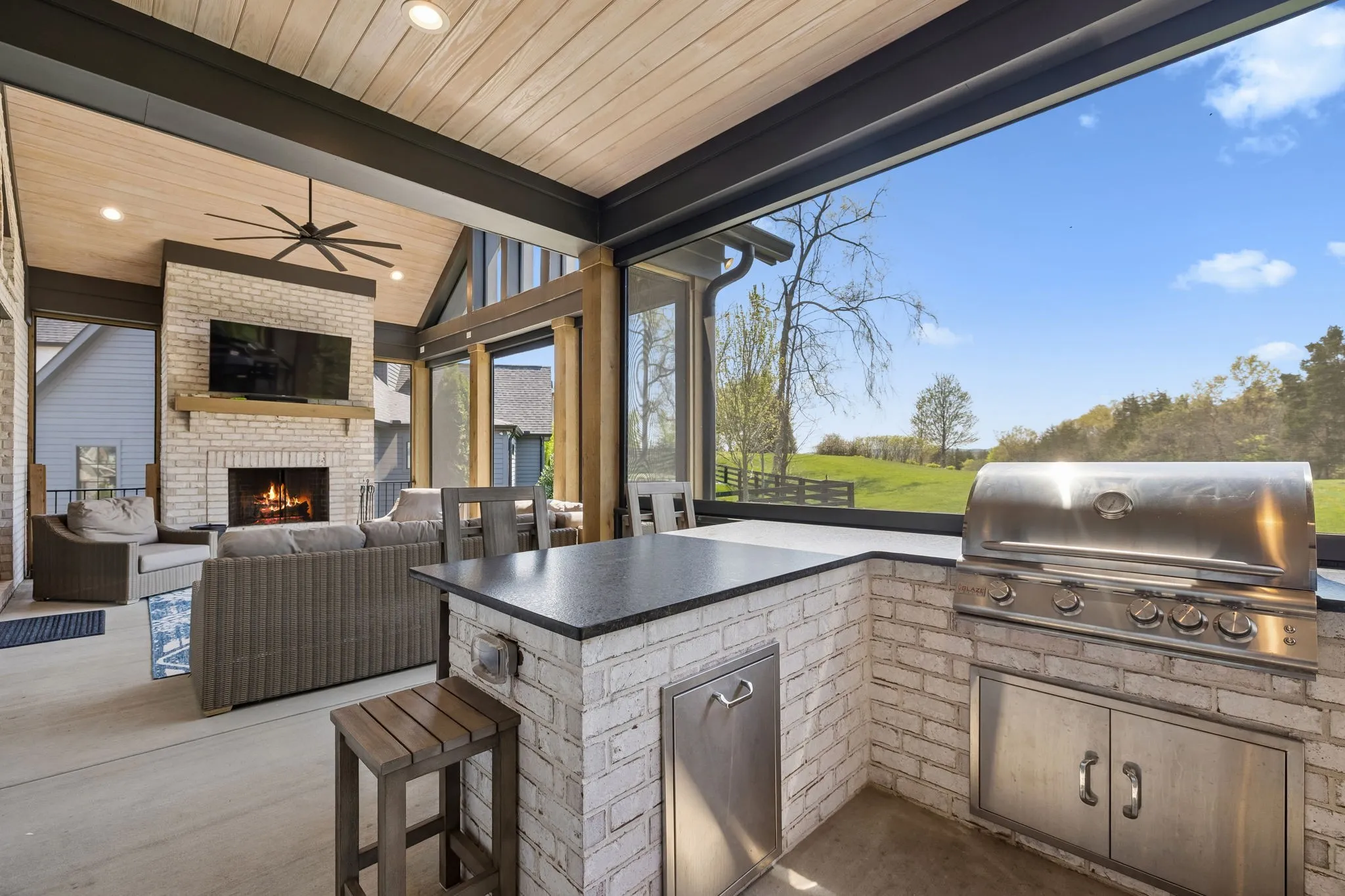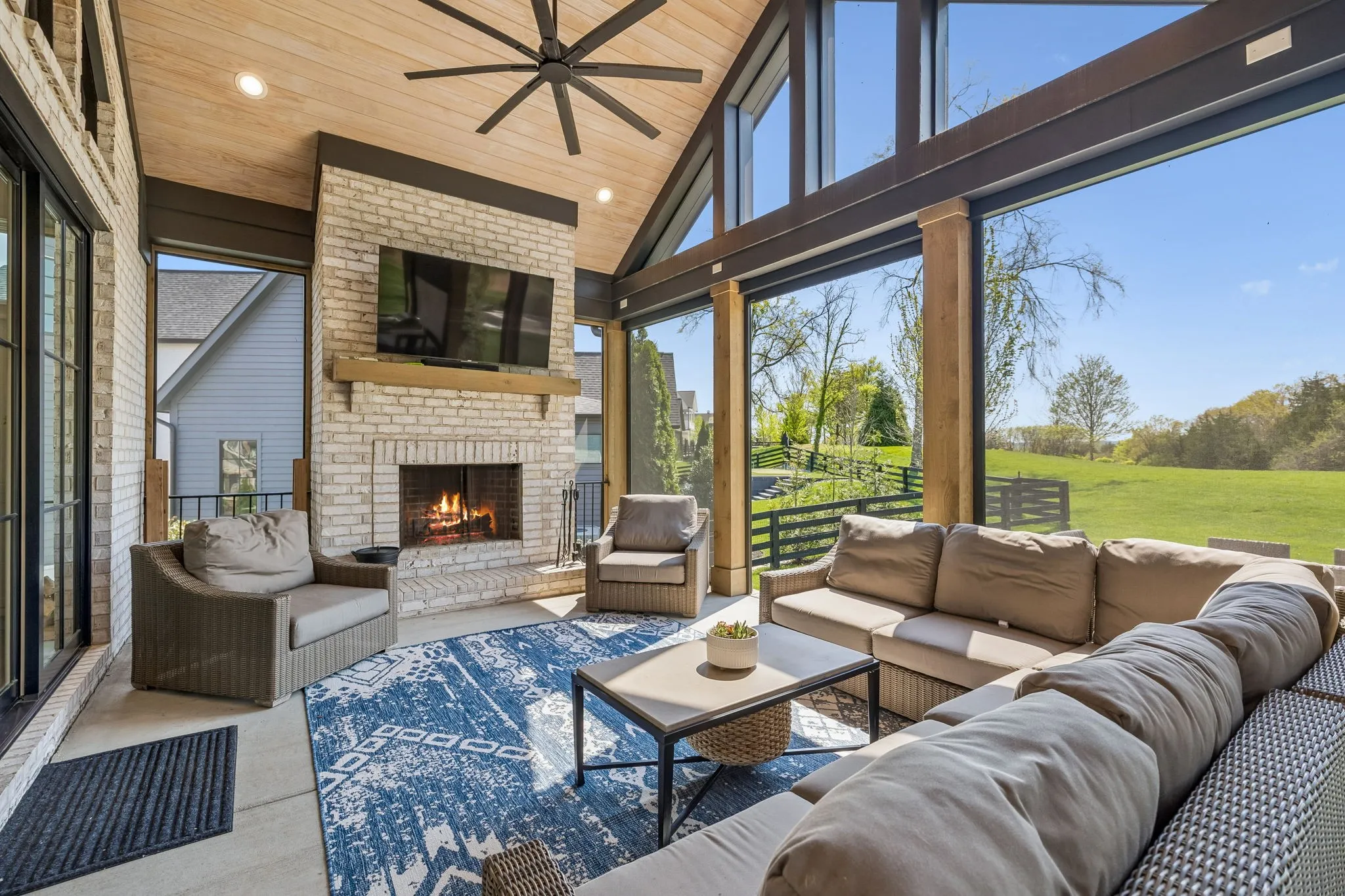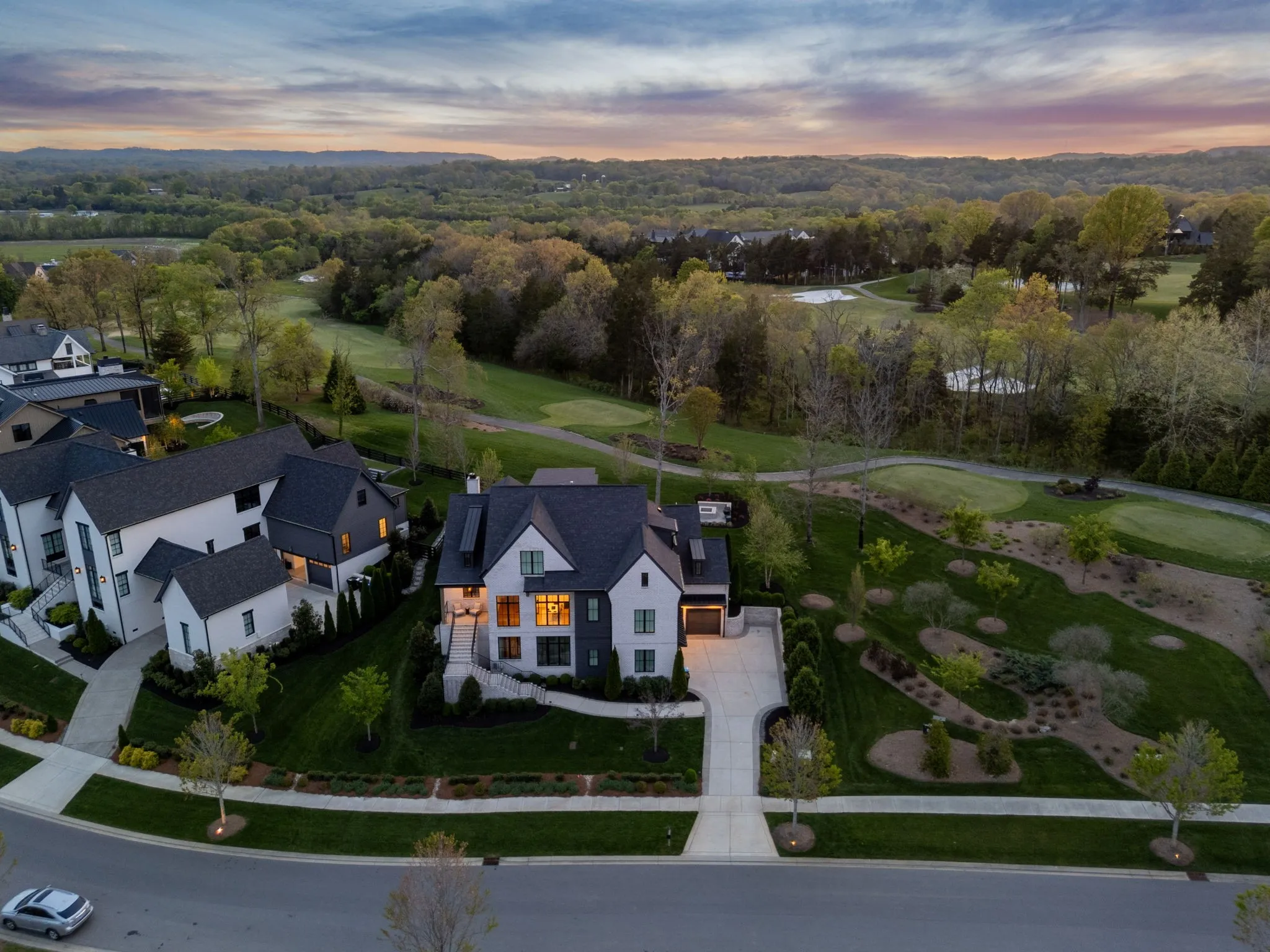Gracefully positioned on Hole #4 of the prestigious Troubadour Championship Golf Course, this exceptional luxury residence offers refined design, thoughtful craftsmanship, and breathtaking golf course views. The open‑concept main level is anchored by a stunning chef’s kitchen featuring a substantial island with custom wood cabinetry, quartz countertops, professional‑grade appliances, designer lighting, and an inviting beamed tongue‑and‑groove ceiling. The kitchen flows seamlessly into the light‑filled living area, where soaring ceilings, exposed beams, a gas fireplace with custom surround, and expansive windows frame the panoramic fairway views. Designed for effortless entertaining, the home includes a striking glass‑enclosed wine room with custom racking, beverage refrigeration, and stone countertops. Sliding glass doors extend the living space outdoors to a covered, screened porch with a fireplace and serene views of the course and surrounding landscape, perfect for year‑round enjoyment. The main‑level primary suite is a private retreat, highlighted by vaulted ceilings, exposed beams, and wall‑to‑wall windows overlooking the lush grounds. The spa‑inspired en suite bath offers timeless finishes, and the expansive custom walk‑in closet features a center island and built‑in storage. Additional spaces include a beautifully designed office or flex room with custom cabinetry and shelving, a spacious laundry room with abundant cabinetry, and high‑end finishes throughout. Outdoor living is elevated by a meticulously landscaped backyard with stone fire pit, ideal for gathering under the stars while enjoying sweeping golf course views. The fully finished basement provides a generous extension of the living space, offering exceptional flexibility for recreation, media, fitness, or additional entertaining. With its elegant exterior, exceptional indoor‑outdoor flow, and premier Troubadour location, this home offers a rare opportunity to experience luxury living at its finest.