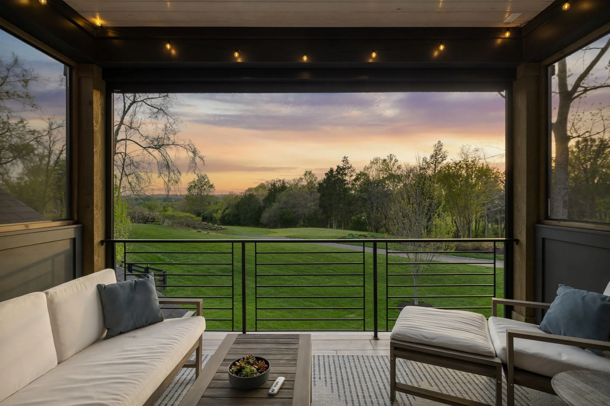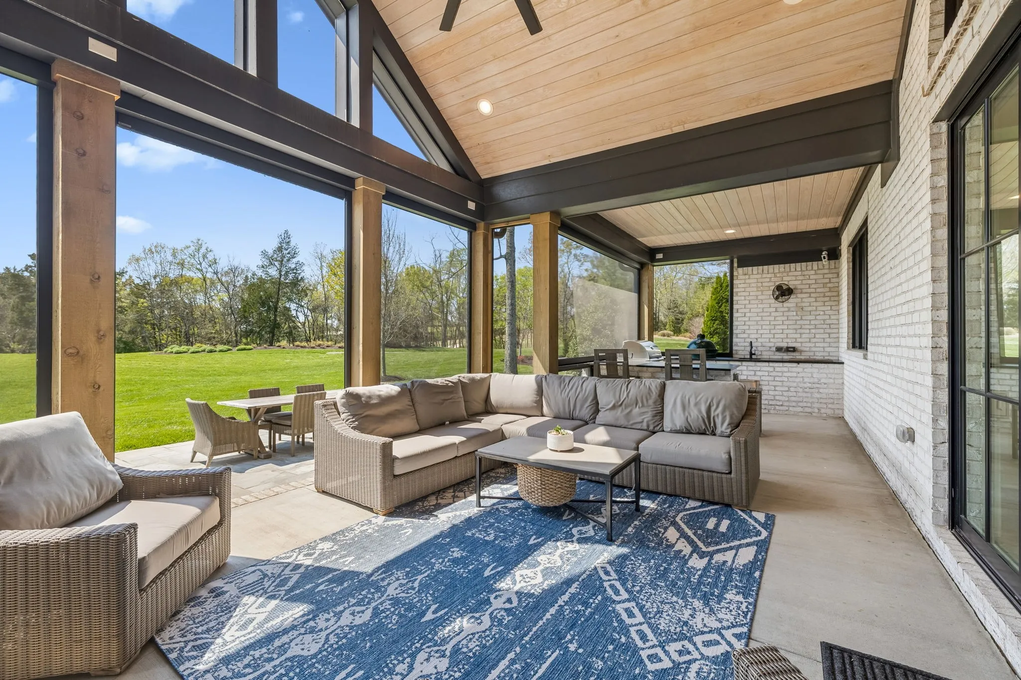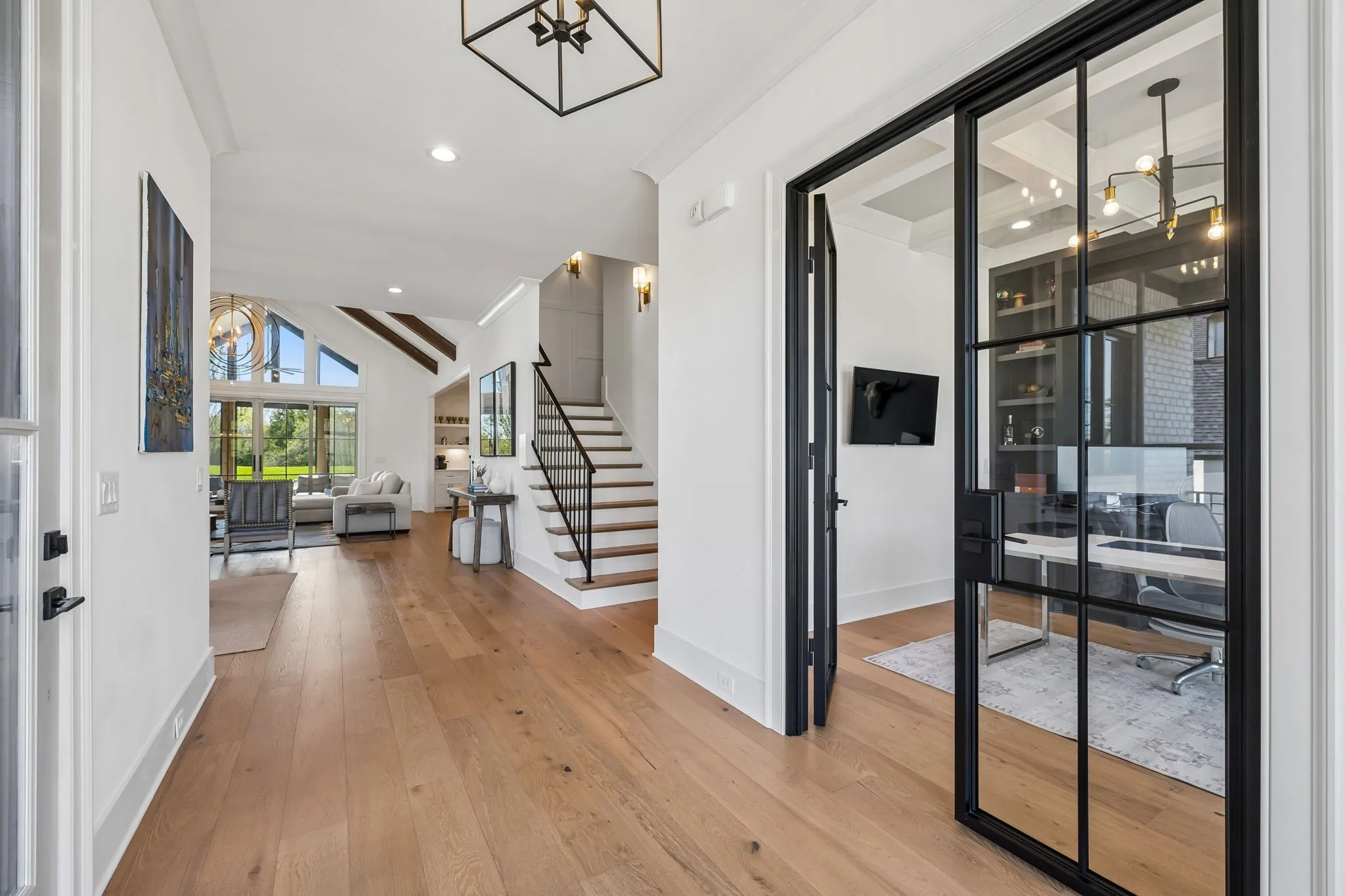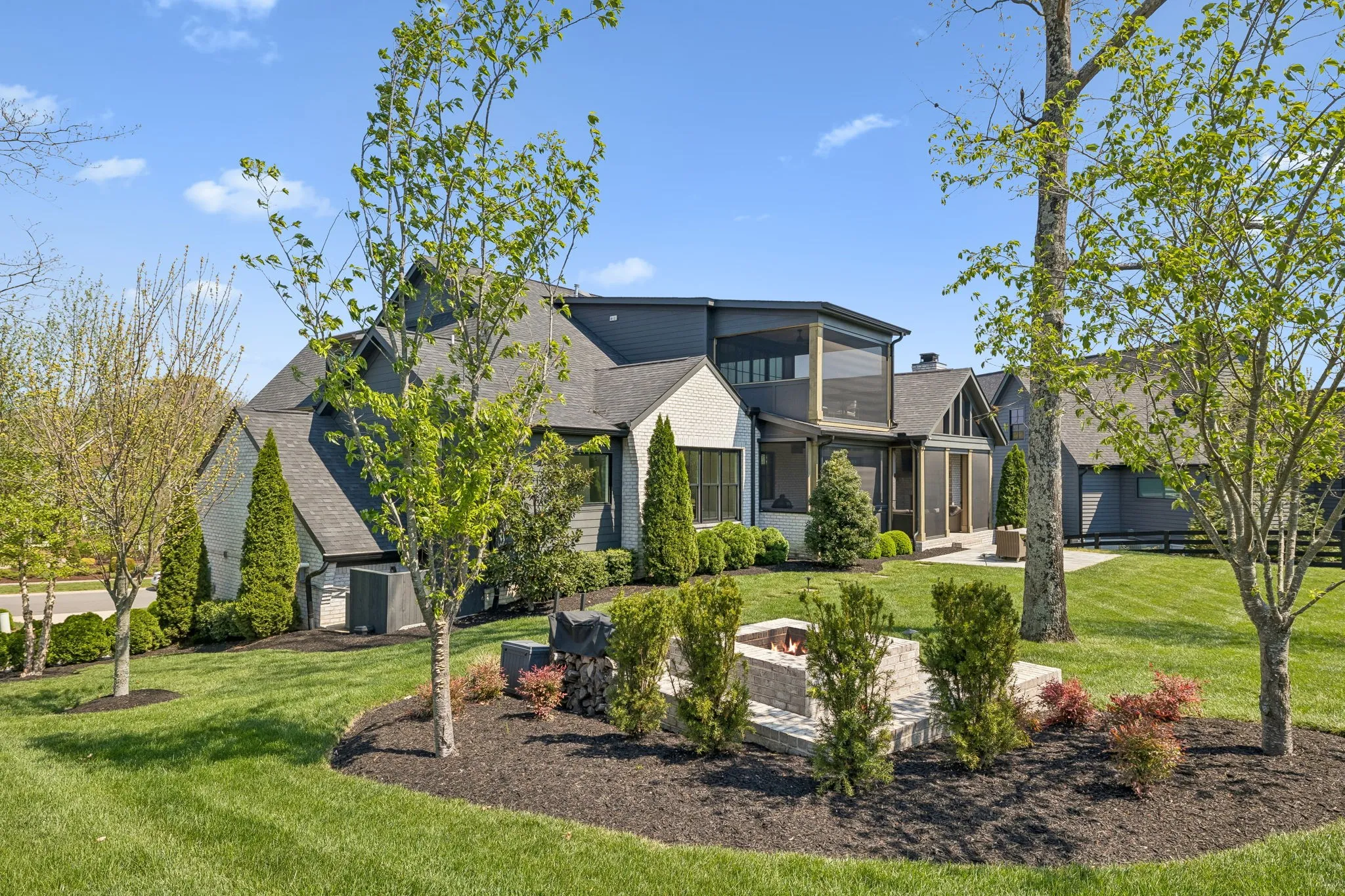 Gracefully positioned on Hole #4 of the prestigious Troubadour Championship Golf Course, this exceptional luxury residence offers refined design, thoughtful craftsmanship, and breathtaking golf course views. The open‑concept main level is anchored by a stunning chef’s kitchen featuring a substantial island with custom wood cabinetry, quartz countertops, professional‑grade appliances, designer lighting, and an inviting beamed tongue‑and‑groove ceiling. The kitchen flows seamlessly into the light‑filled living area, where soaring ceilings, exposed beams, a gas fireplace with custom surround, and expansive windows frame the panoramic fairway views. Designed for effortless entertaining, the home includes a striking glass‑enclosed wine room with custom racking, beverage refrigeration, and stone countertops. Sliding glass doors extend the living space outdoors to a covered, screened porch with a fireplace and serene views of the course and surrounding landscape, perfect for year‑round enjoyment. The main‑level primary suite is a private retreat, highlighted by vaulted ceilings, exposed beams, and wall‑to‑wall windows overlooking the lush grounds. The spa‑inspired en suite bath offers timeless finishes, and the expansive custom walk‑in closet features a center island and built‑in storage. Additional spaces include a beautifully designed office or flex room with custom cabinetry and shelving, a spacious laundry room with abundant cabinetry, and high‑end finishes throughout. Outdoor living is elevated by a meticulously landscaped backyard with stone fire pit, ideal for gathering under the stars while enjoying sweeping golf course views. The fully finished basement provides a generous extension of the living space, offering exceptional flexibility for recreation, media, fitness, or additional entertaining. With its elegant exterior, exceptional indoor‑outdoor flow, and premier Troubadour location, this home offers a rare opportunity to experience luxury living at its finest.