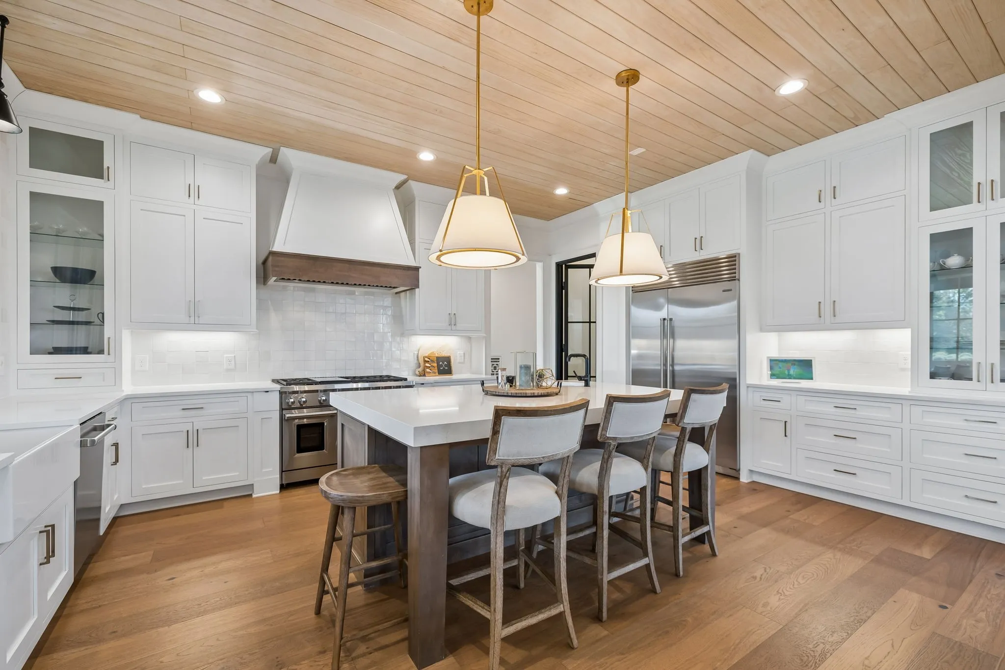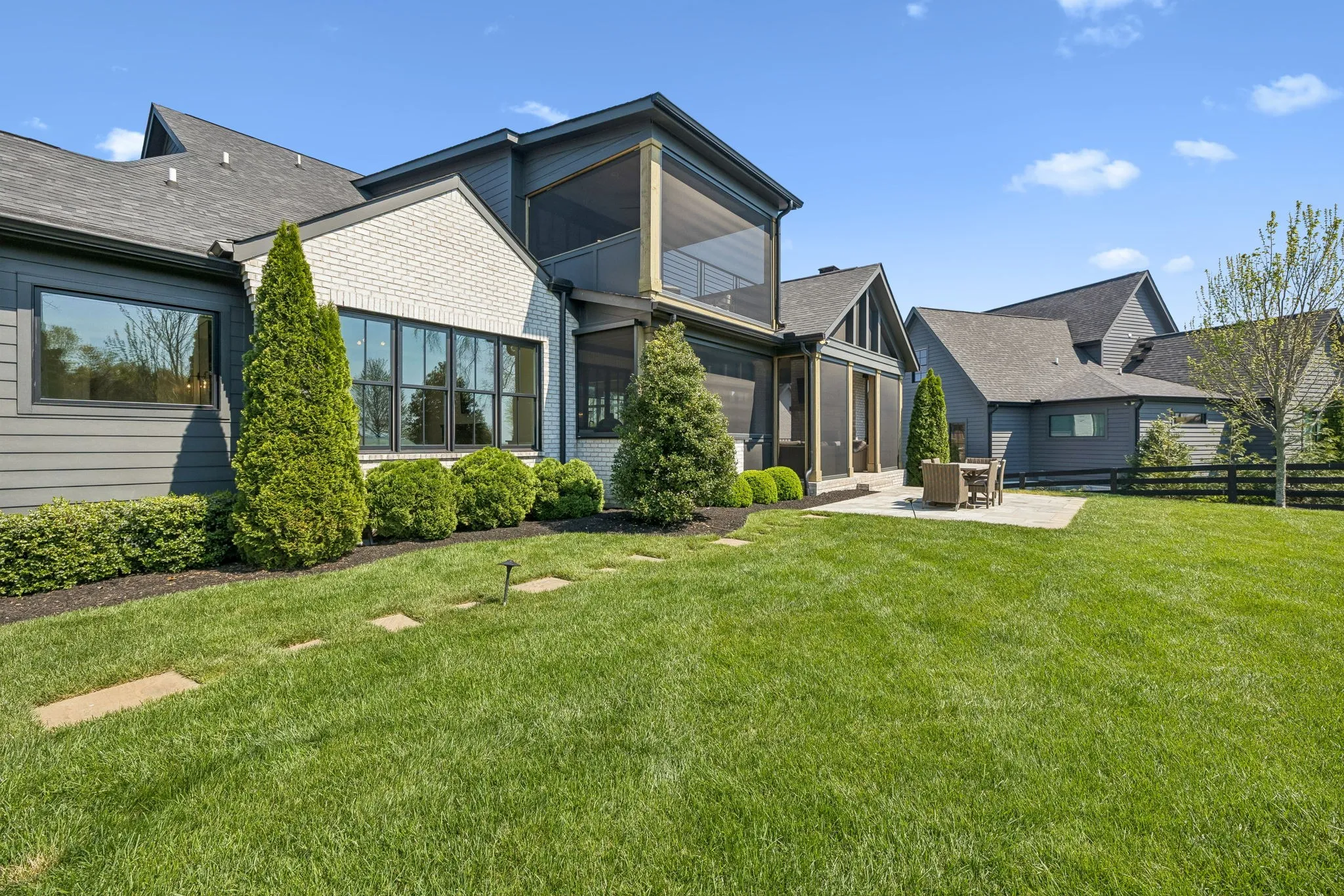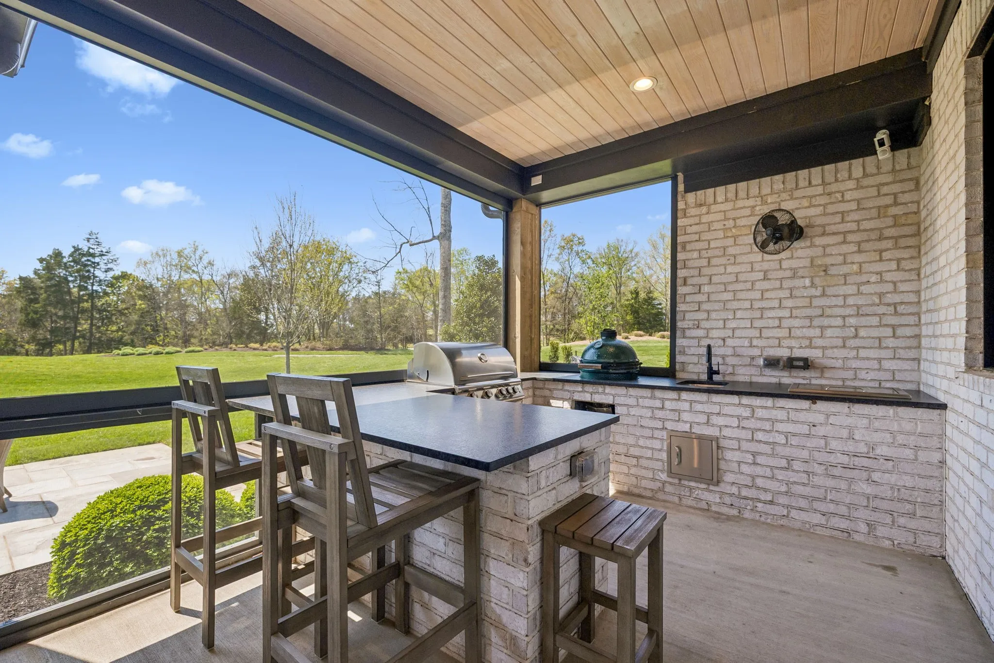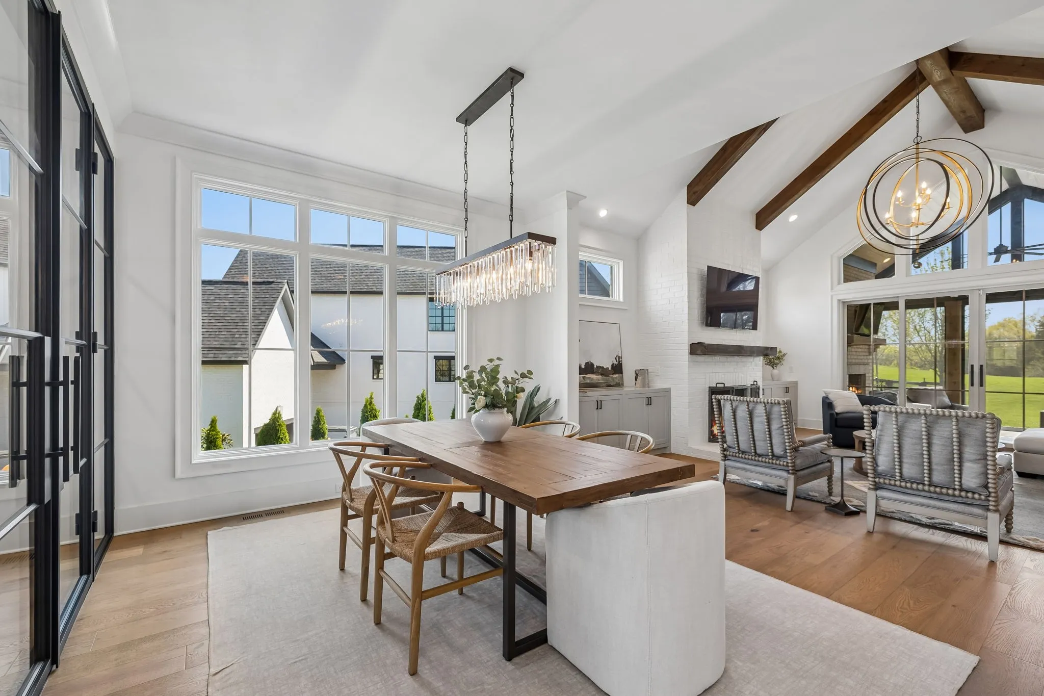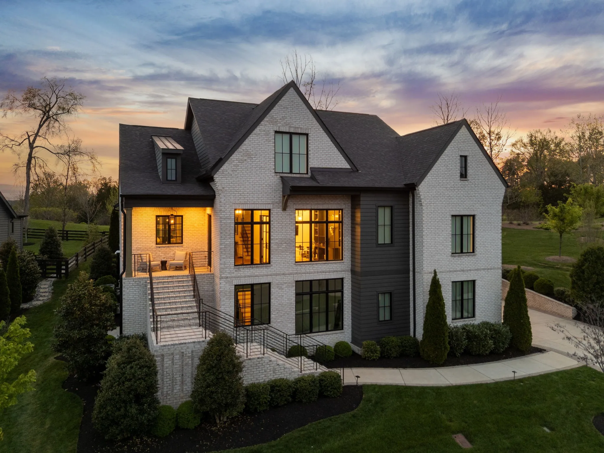 Gracefully positioned on Hole #4 of the prestigious Troubadour Championship Golf Course, this exceptional luxury residence offers refined design, thoughtful craftsmanship, and breathtaking golf course views. The open‑concept main level is anchored by a stunning chef’s kitchen featuring a substantial island with custom wood cabinetry, quartz countertops, professional‑grade appliances, designer lighting, and an inviting beamed tongue‑and‑groove ceiling. The kitchen flows seamlessly into the light‑filled living area, where soaring ceilings, exposed beams, a gas fireplace with custom surround, and expansive windows frame the panoramic fairway views. Designed for effortless entertaining, the home includes a striking glass‑enclosed wine room with custom racking, beverage refrigeration, and stone countertops. Sliding glass doors extend the living space outdoors to a covered, screened porch with a fireplace and serene views of the course and surrounding landscape, perfect for year‑round enjoyment. The main‑level primary suite is a private retreat, highlighted by vaulted ceilings, exposed beams, and wall‑to‑wall windows overlooking the lush grounds. The spa‑inspired en suite bath offers timeless finishes, and the expansive custom walk‑in closet features a center island and built‑in storage. Additional spaces include a beautifully designed office or flex room with custom cabinetry and shelving, a spacious laundry room with abundant cabinetry, and high‑end finishes throughout. Outdoor living is elevated by a meticulously landscaped backyard with stone fire pit, ideal for gathering under the stars while enjoying sweeping golf course views. The fully finished basement provides a generous extension of the living space, offering exceptional flexibility for recreation, media, fitness, or additional entertaining. With its elegant exterior, exceptional indoor‑outdoor flow, and premier Troubadour location, this home offers a rare opportunity to experience luxury living at its finest.