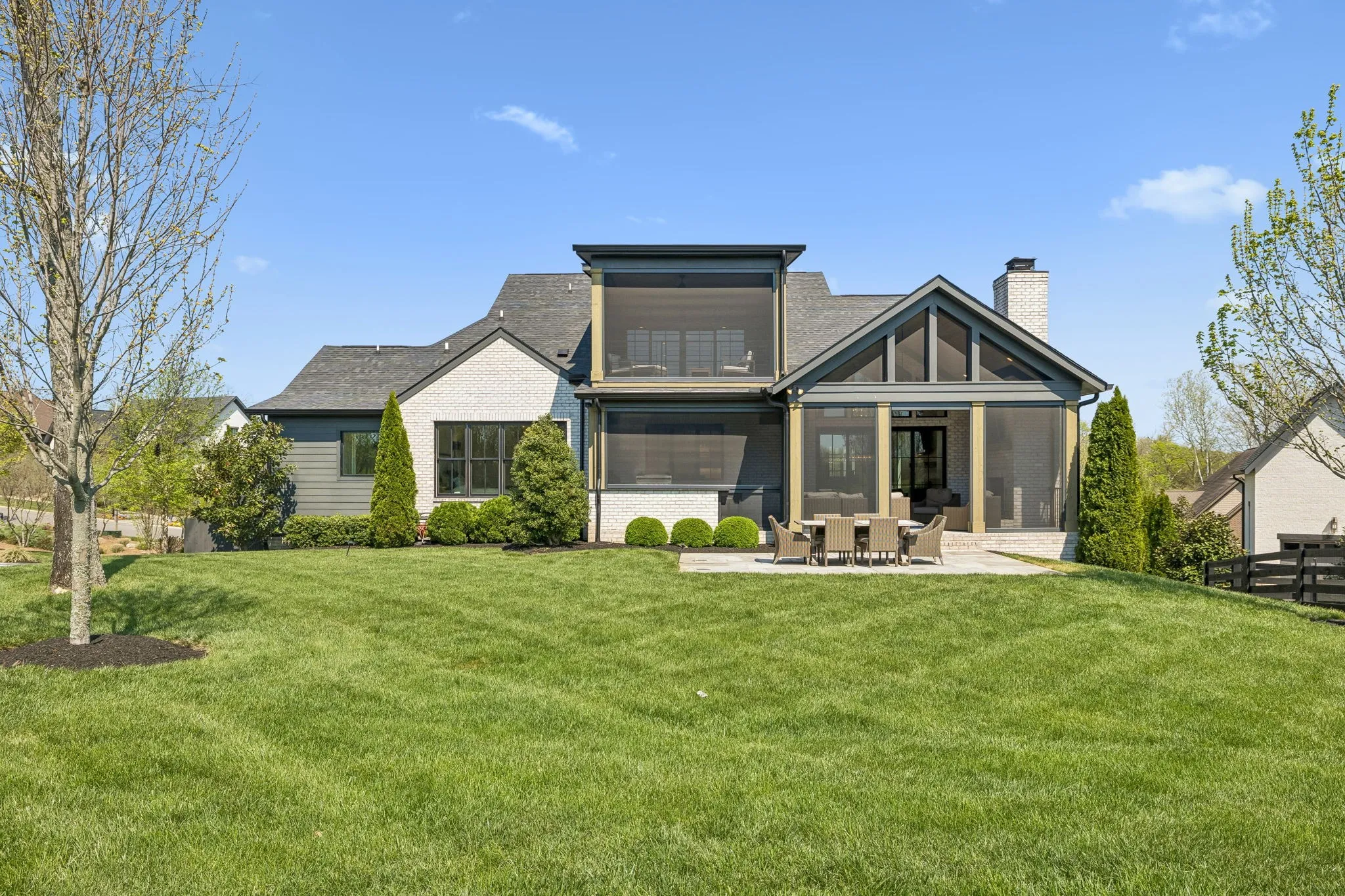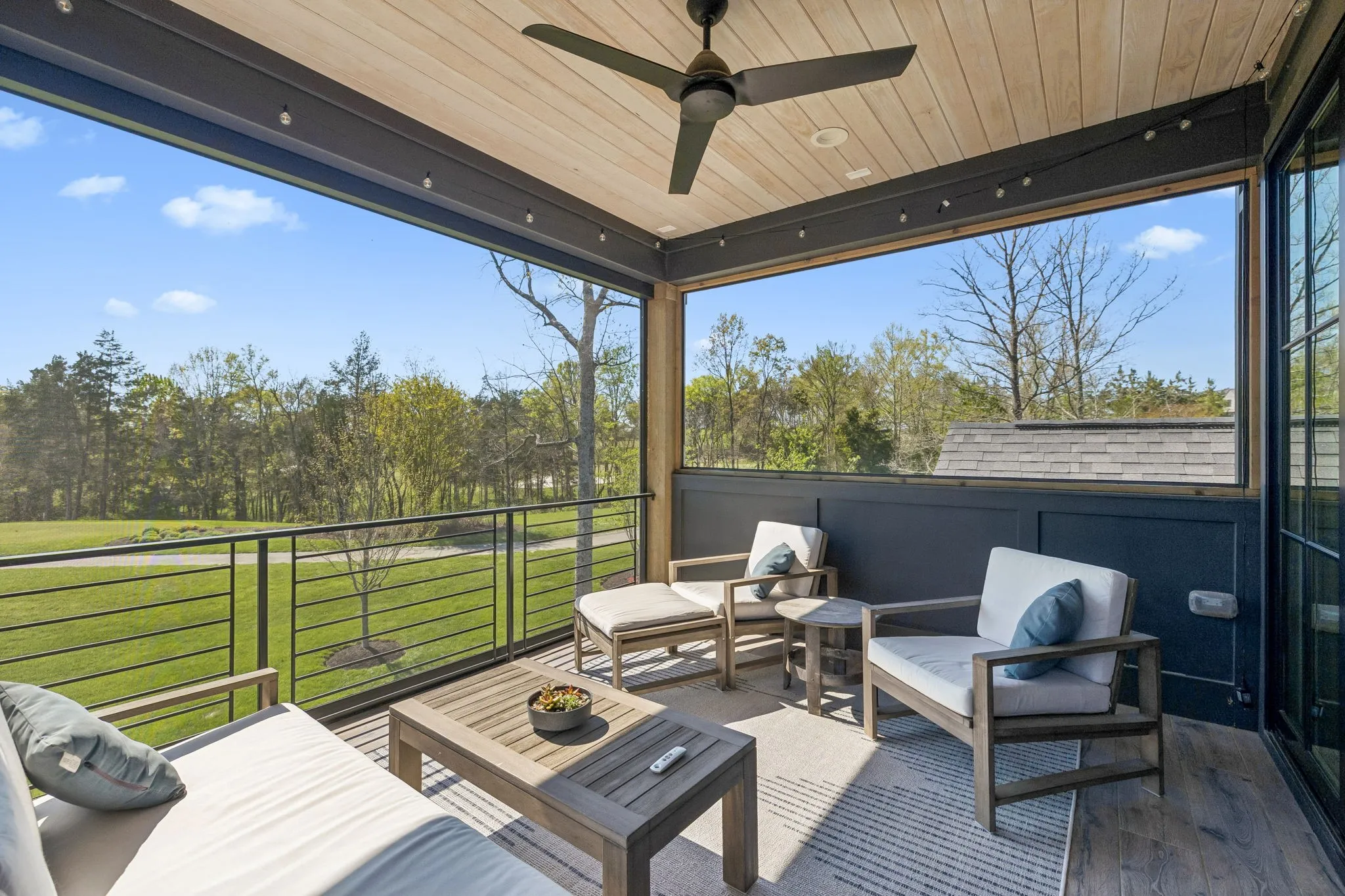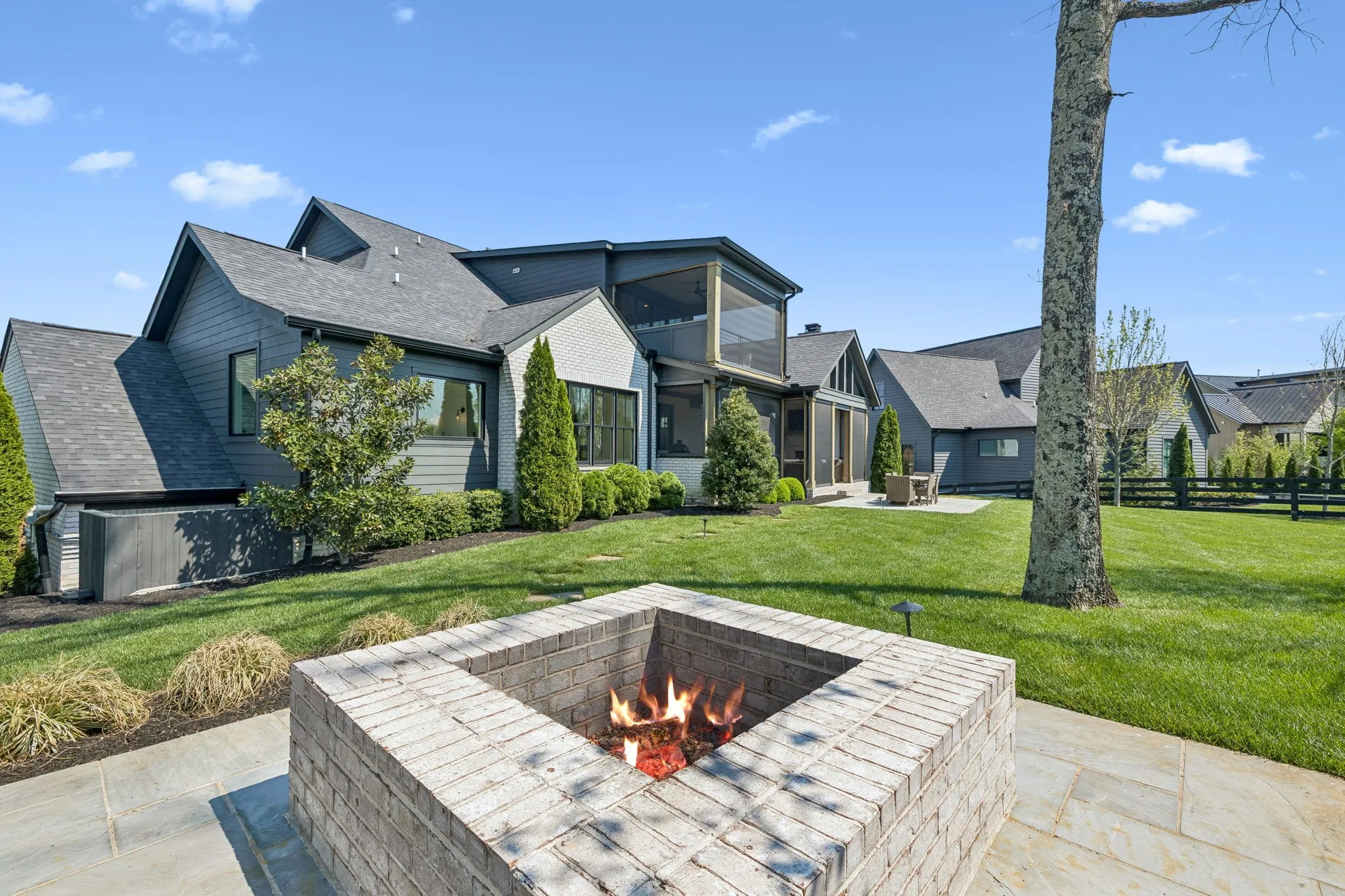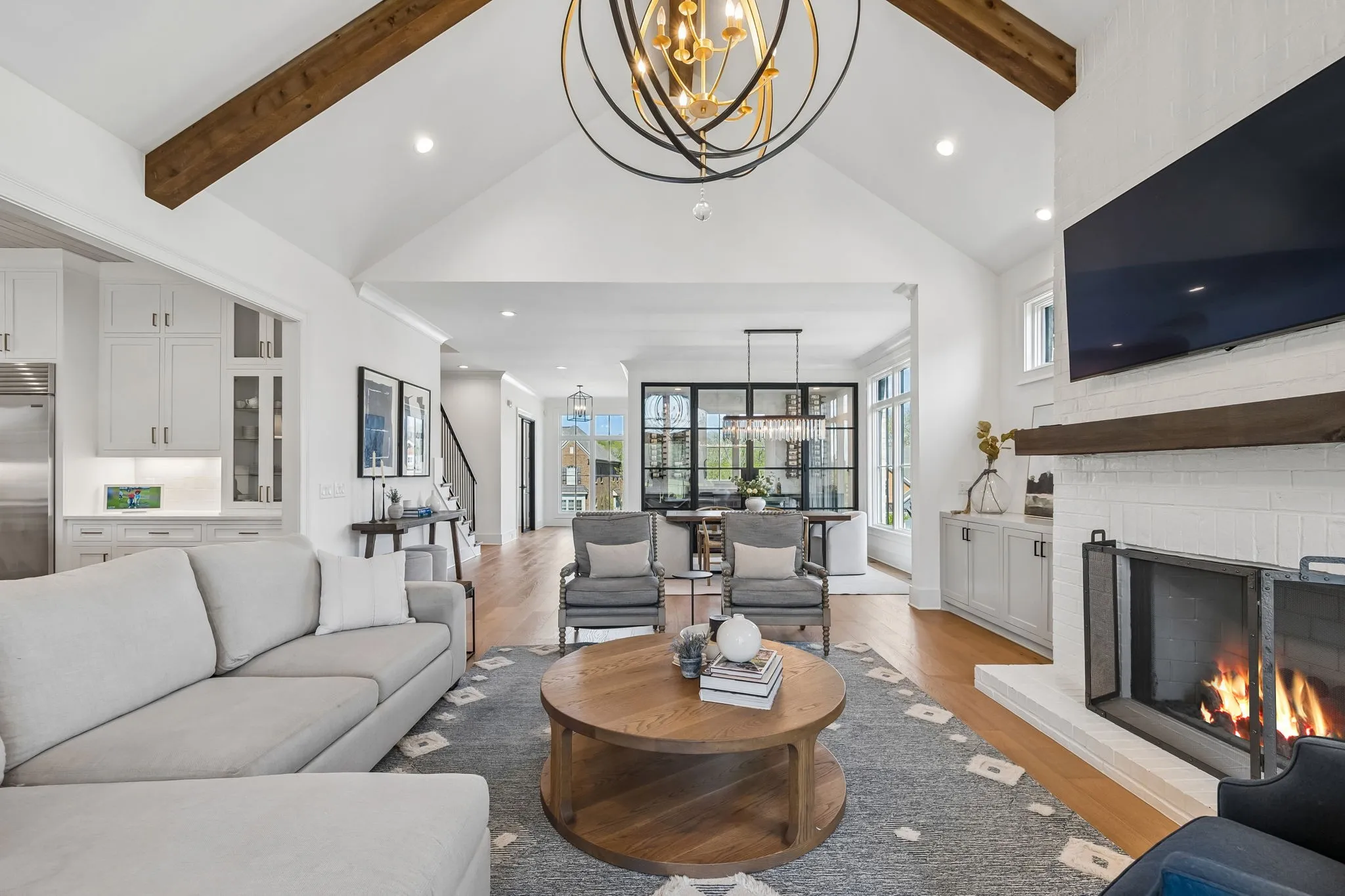 Gracefully positioned on Hole #4 of the prestigious Troubadour Championship Golf Course, this exceptional luxury residence offers refined design, thoughtful craftsmanship, and breathtaking golf course views. The open‑concept main level is anchored by a stunning chef’s kitchen featuring a substantial island with custom wood cabinetry, quartz countertops, professional‑grade appliances, designer lighting, and an inviting beamed tongue‑and‑groove ceiling. The kitchen flows seamlessly into the light‑filled living area, where soaring ceilings, exposed beams, a gas fireplace with custom surround, and expansive windows frame the panoramic fairway views. Designed for effortless entertaining, the home includes a striking glass‑enclosed wine room with custom racking, beverage refrigeration, and stone countertops. Sliding glass doors extend the living space outdoors to a covered, screened porch with a fireplace and serene views of the course and surrounding landscape, perfect for year‑round enjoyment. The main‑level primary suite is a private retreat, highlighted by vaulted ceilings, exposed beams, and wall‑to‑wall windows overlooking the lush grounds. The spa‑inspired en suite bath offers timeless finishes, and the expansive custom walk‑in closet features a center island and built‑in storage. Additional spaces include a beautifully designed office or flex room with custom cabinetry and shelving, a spacious laundry room with abundant cabinetry, and high‑end finishes throughout. Outdoor living is elevated by a meticulously landscaped backyard with stone fire pit, ideal for gathering under the stars while enjoying sweeping golf course views. The fully finished basement provides a generous extension of the living space, offering exceptional flexibility for recreation, media, fitness, or additional entertaining. With its elegant exterior, exceptional indoor‑outdoor flow, and premier Troubadour location, this home offers a rare opportunity to experience luxury living at its finest.