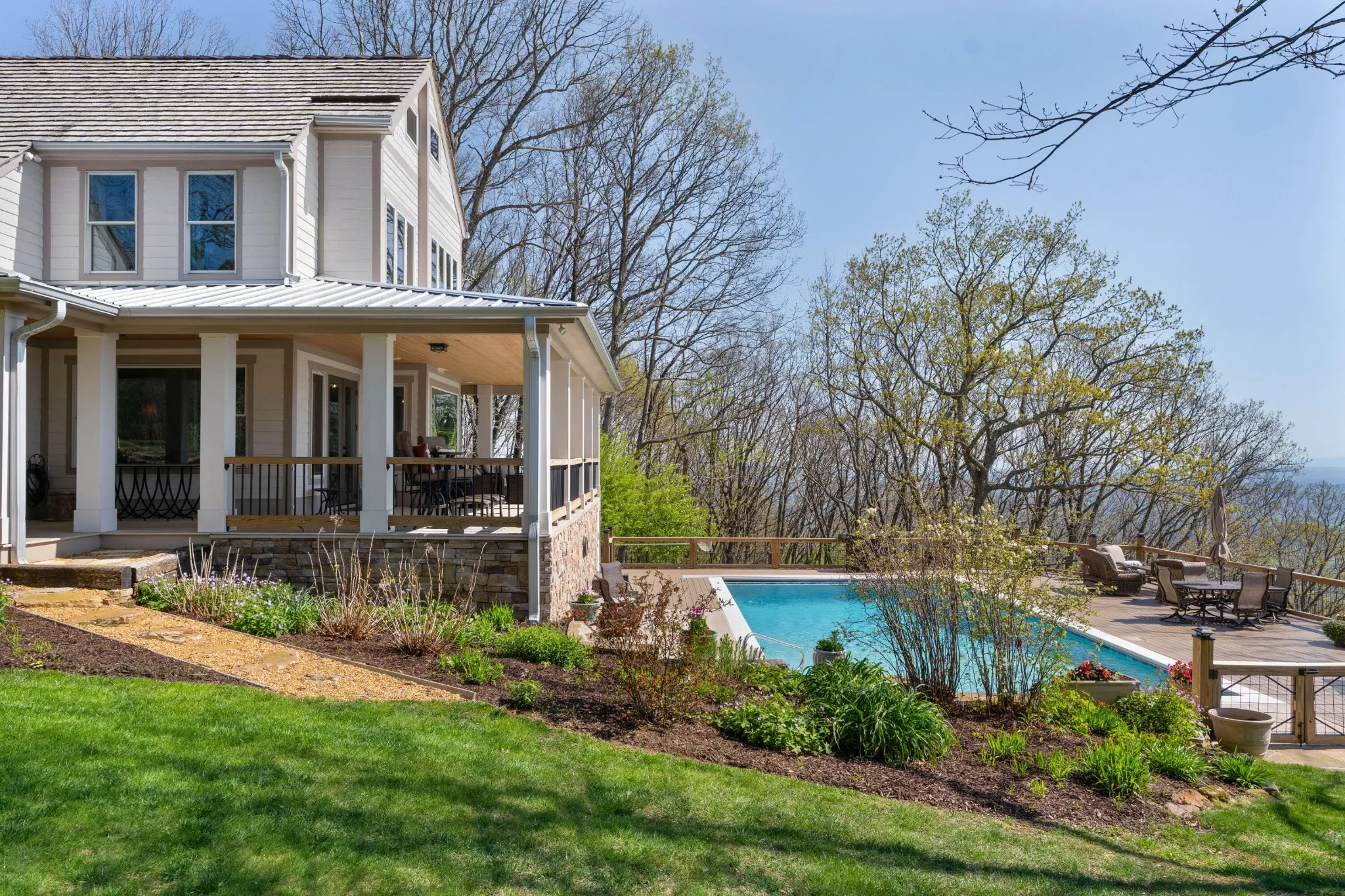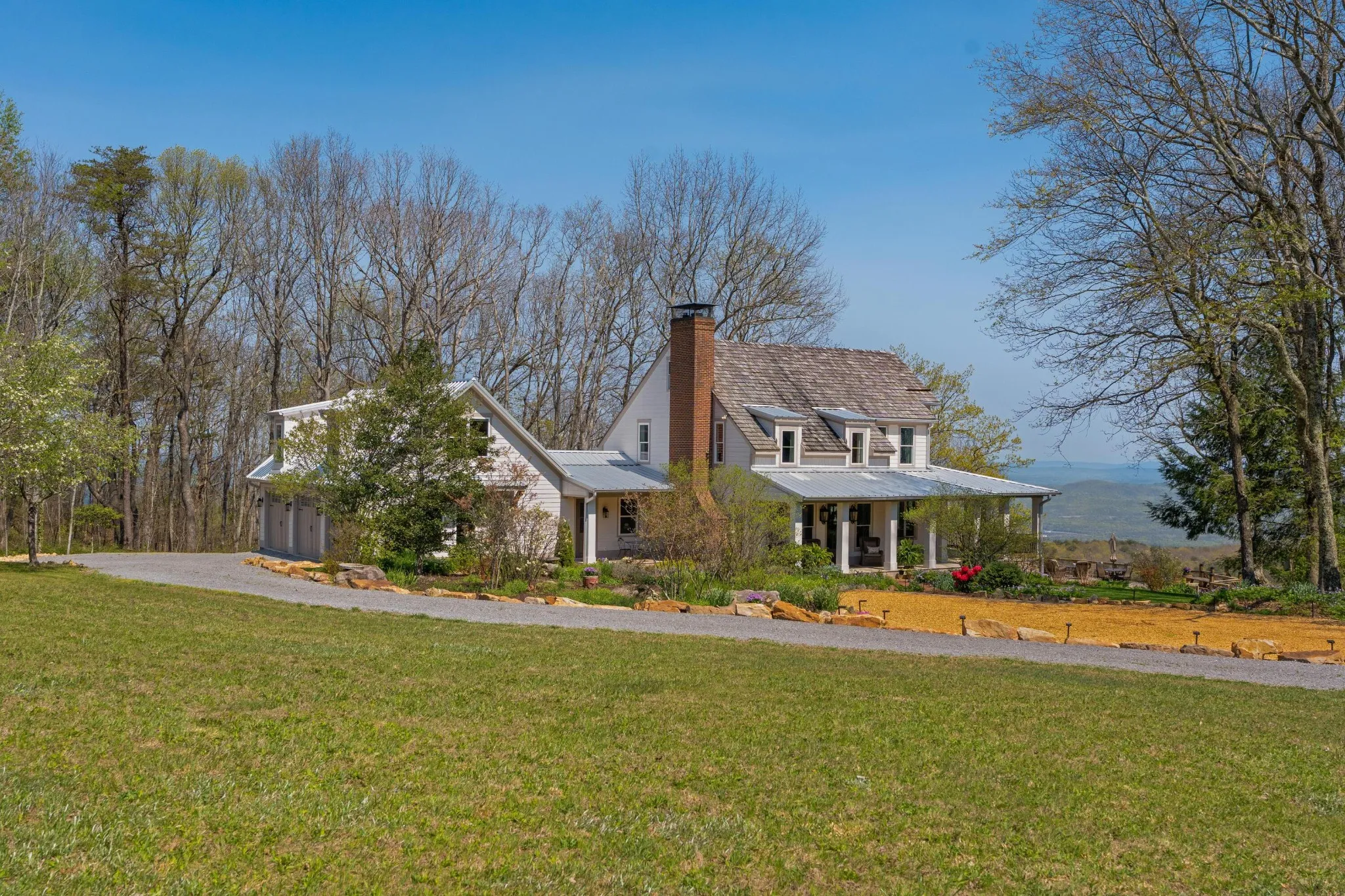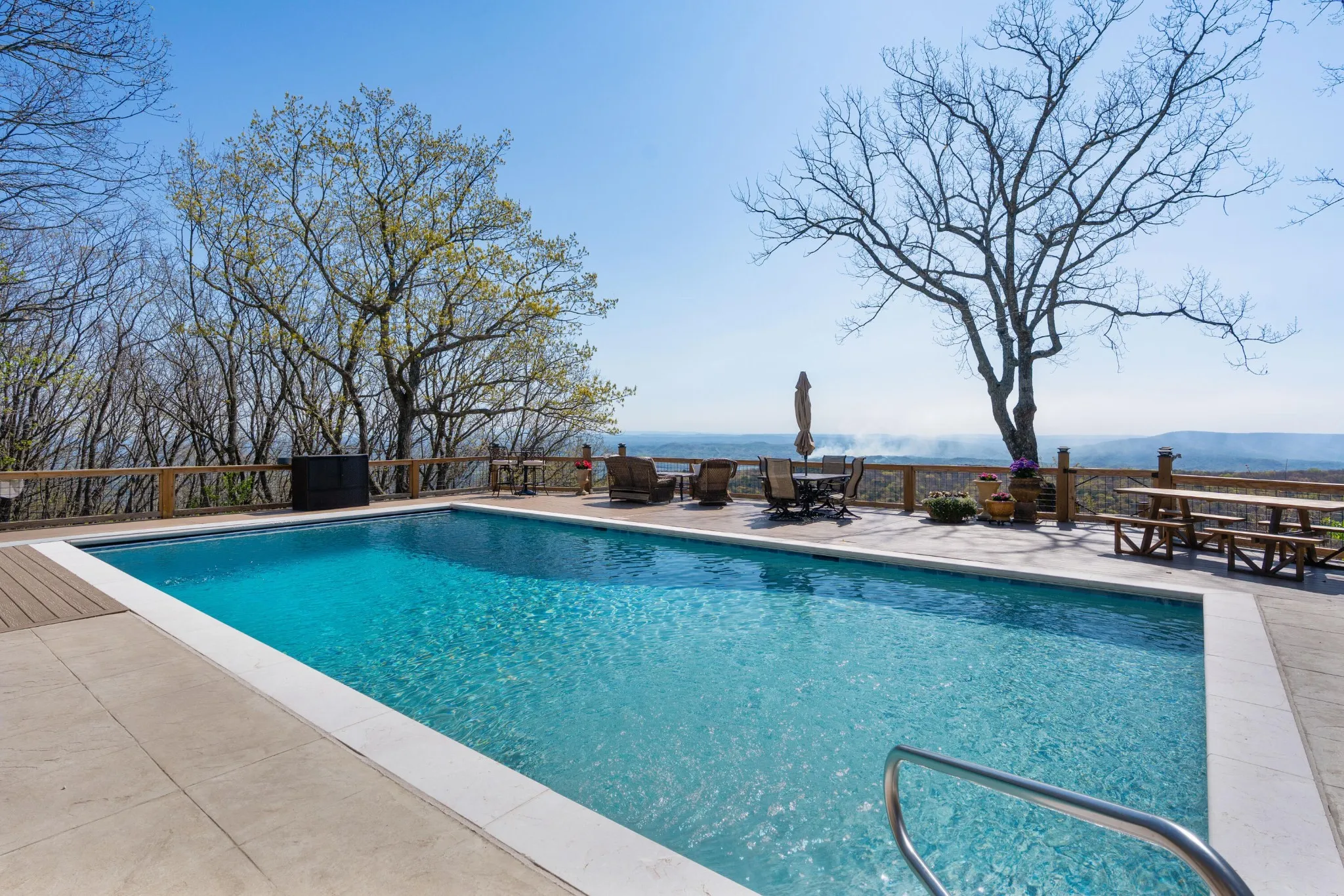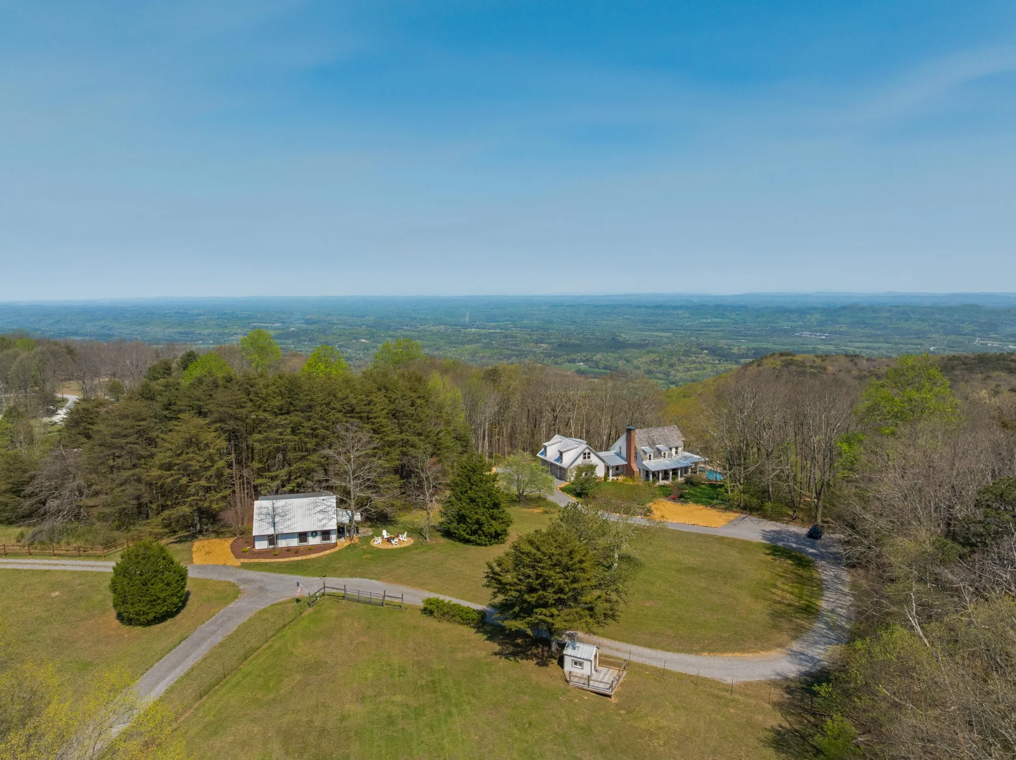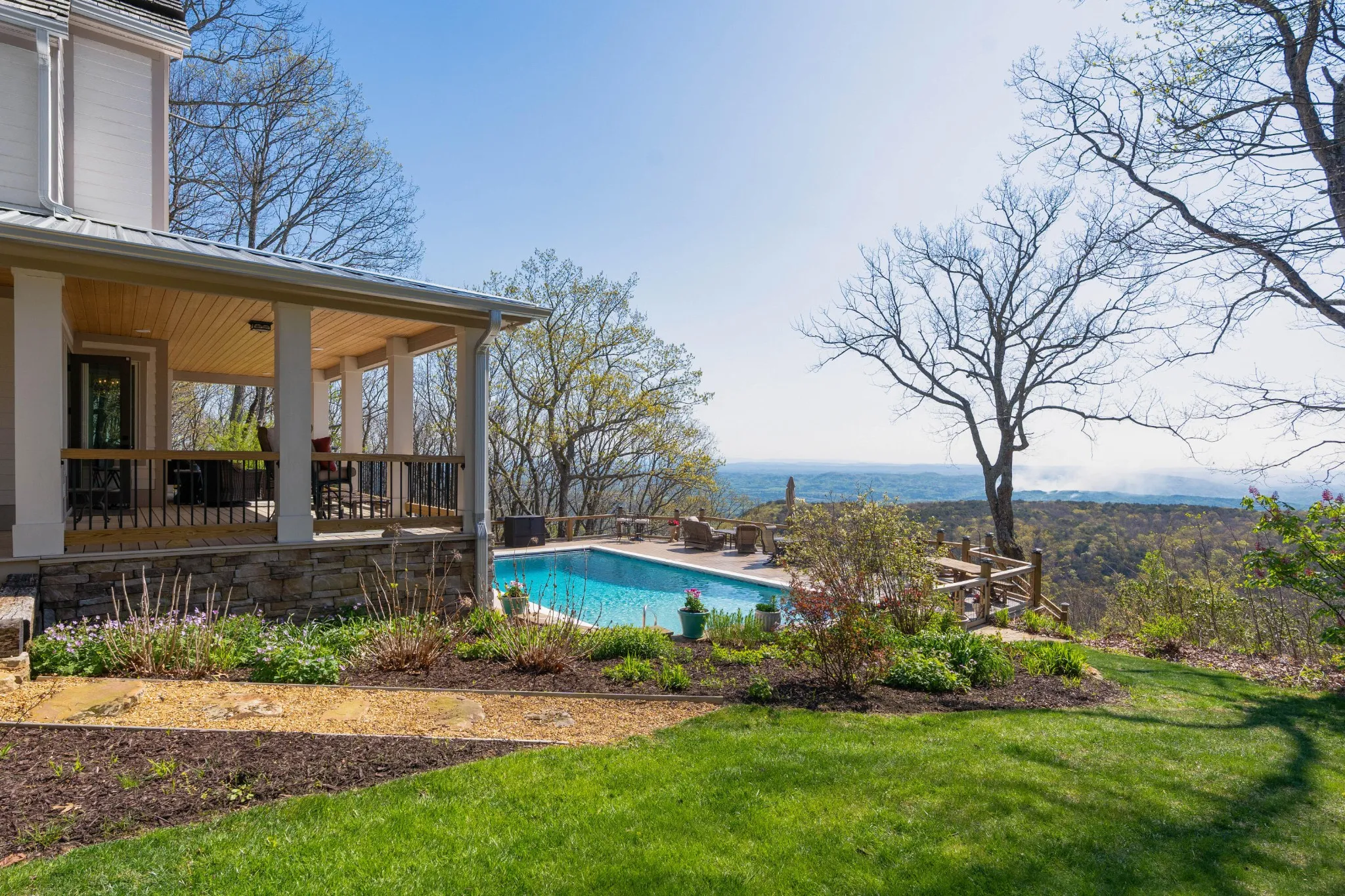 Truly stunning brow property on Lookout Mountain in the Rising Fawn area featuring a 4 bedroom, 3 bath main house with a 3 bay garage and a heated, saltwater pool, plus a 1 bedroom, 1.5 bath guest house picturesquely positioned on 14.14 +/- acres approximately 1 mile from the McLemore Golf Resort with hotel, pool, spa, 3 restaurants and 2 – 18 hole golf courses. Meticulously renovated in 2022, the home simply exudes curb appeal with its shake shingle and metal roofs, lush landscaping and wrap-around covered porch overlooking the pool with the gorgeous mountain and valley views as your scenic backdrop. Enjoy these views from almost every room in the house where you will find wide-plank pine floors, crown moldings, decorative and recessed lighting, solid wood doors, clad windows, wonderful natural lighting, stone countertops, shiplap accents and more. The main level has a great circular flow with multiple access points to and from the wrap-around porch, and your tour begins with entry to an inviting foyer with the dining on the left and the living areas to the right. The dining room has a wood burning fireplace and opens to the kitchen, while the living room adjoins a sitting area which in turn opens to the breakfast area and kitchen. The living room faces the brow and the French doors to the back porch can be opened to invite the outside in and extend your living space. The kitchen has granite countertops, tile backsplash, stainless Bertazoni Italian appliances, custom cabinetry with organizer systems and a large doorway to the hallway to the new addition. The addition is seamless and includes a full guest bath with separate access from the porch for pool guests, laundry room with utility sink, cabinetry, and a folding counter, the heated and cooled 3-bay garage and an upper-level den and bedroom. The other bedrooms are accessible from the main staircase, including the primary bedroom which has a sitting area, 2 walk-in closets and the primary bath with a dual vanity