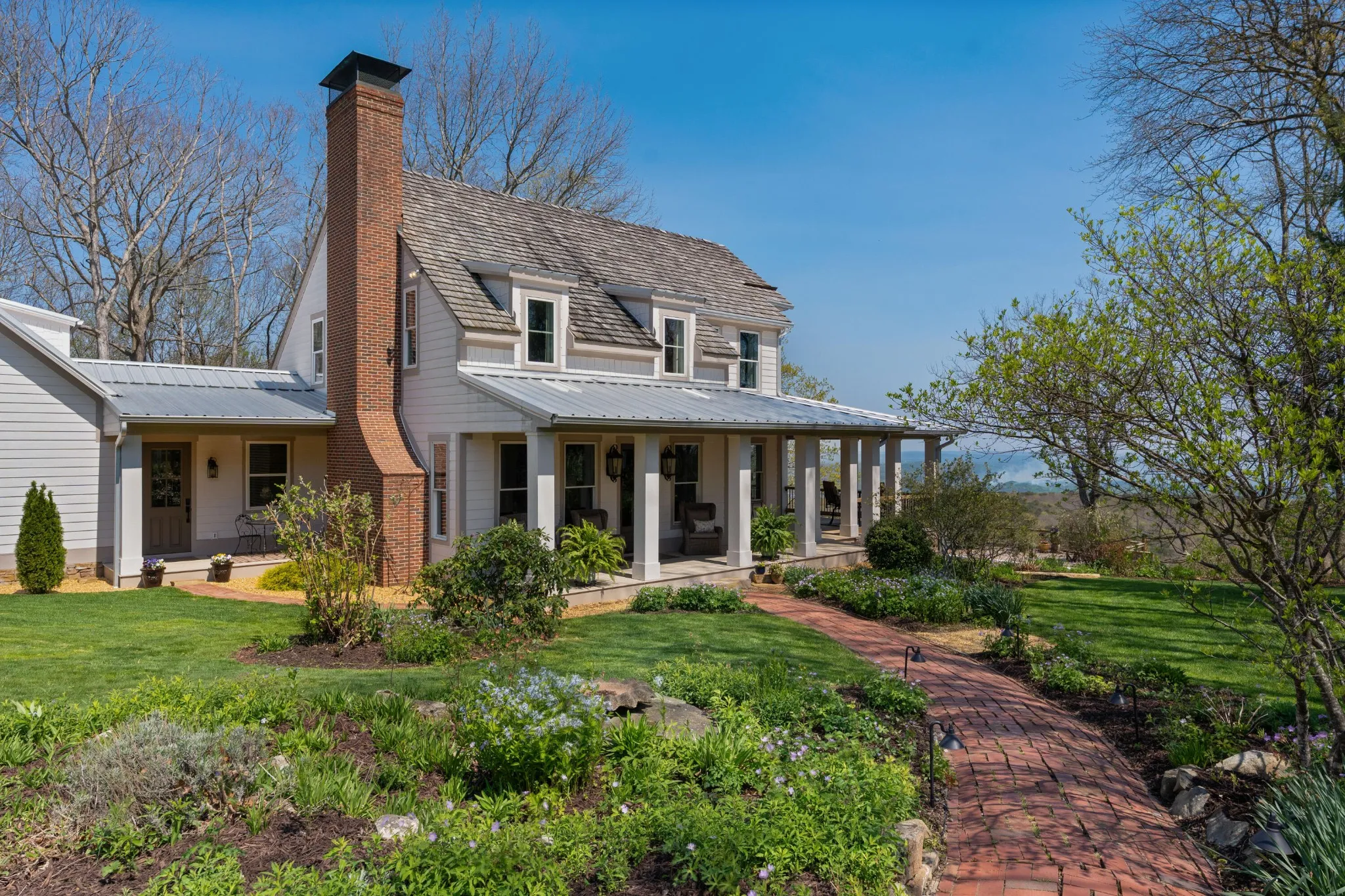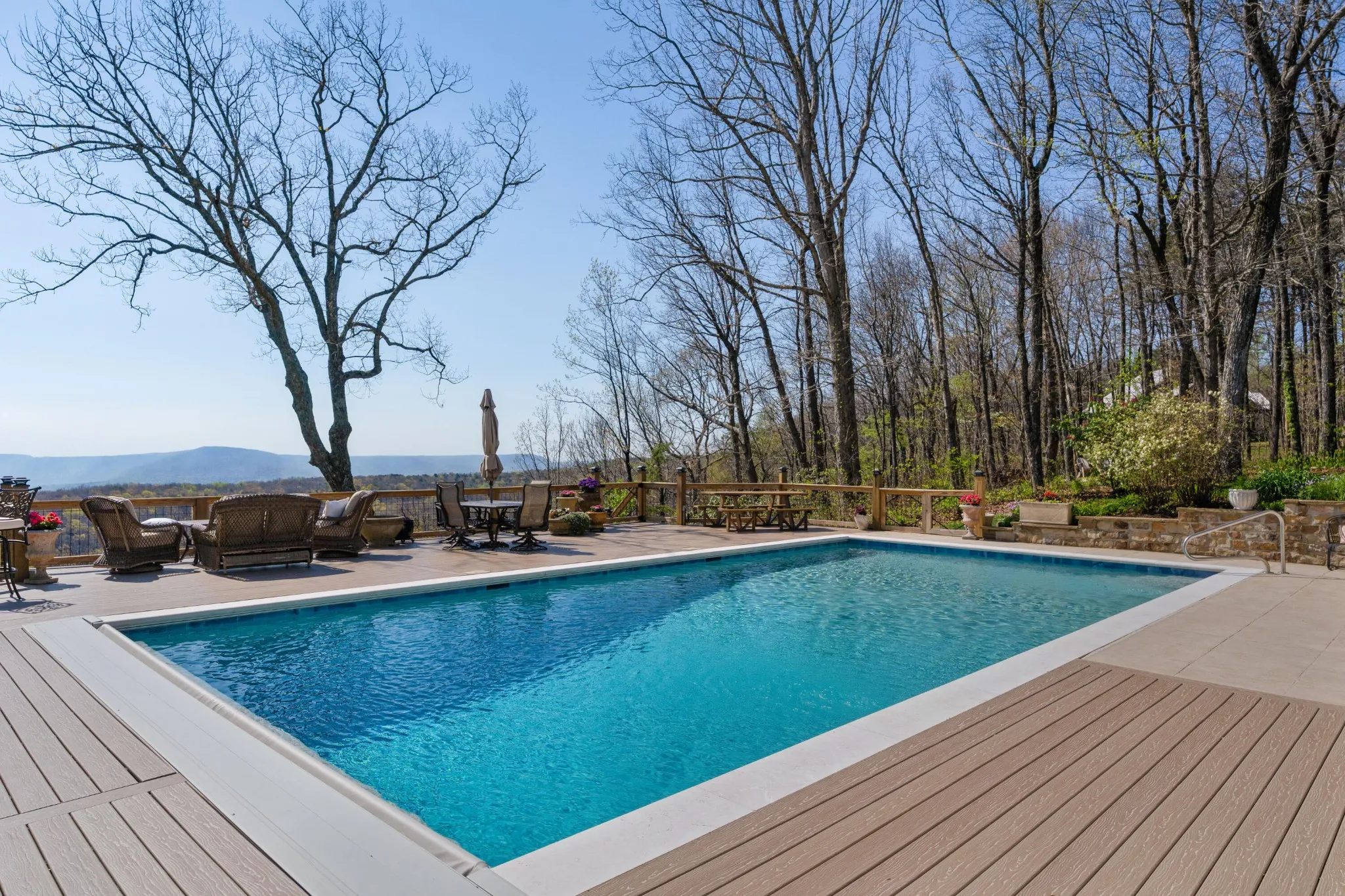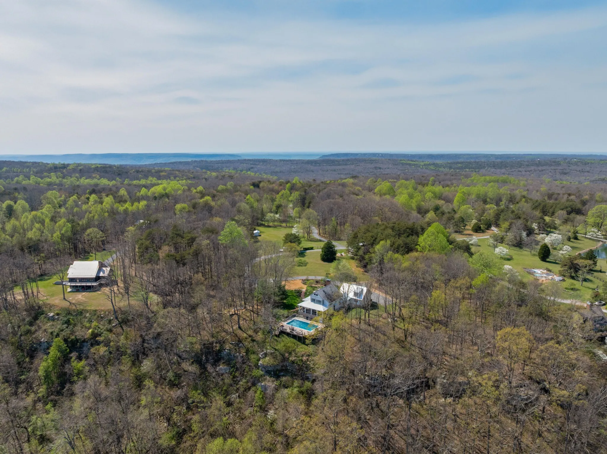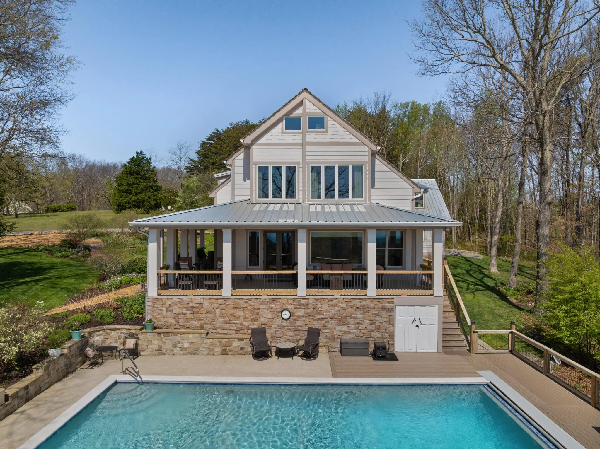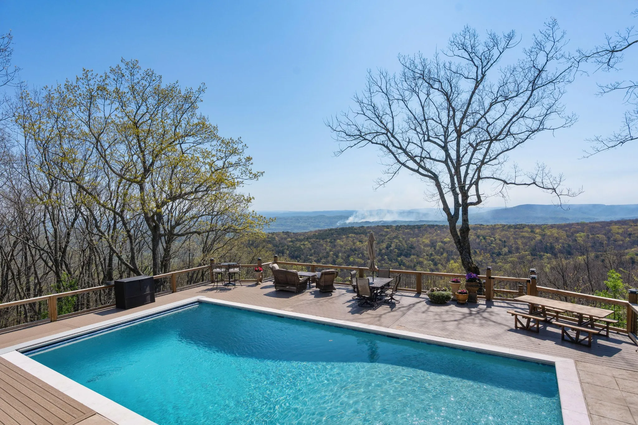 Truly stunning brow property on Lookout Mountain in the Rising Fawn area featuring a 4 bedroom, 3 bath main house with a 3 bay garage and a heated, saltwater pool, plus a 1 bedroom, 1.5 bath guest house picturesquely positioned on 14.14 +/- acres approximately 1 mile from the McLemore Golf Resort with hotel, pool, spa, 3 restaurants and 2 – 18 hole golf courses. Meticulously renovated in 2022, the home simply exudes curb appeal with its shake shingle and metal roofs, lush landscaping and wrap-around covered porch overlooking the pool with the gorgeous mountain and valley views as your scenic backdrop. Enjoy these views from almost every room in the house where you will find wide-plank pine floors, crown moldings, decorative and recessed lighting, solid wood doors, clad windows, wonderful natural lighting, stone countertops, shiplap accents and more. The main level has a great circular flow with multiple access points to and from the wrap-around porch, and your tour begins with entry to an inviting foyer with the dining on the left and the living areas to the right. The dining room has a wood burning fireplace and opens to the kitchen, while the living room adjoins a sitting area which in turn opens to the breakfast area and kitchen. The living room faces the brow and the French doors to the back porch can be opened to invite the outside in and extend your living space. The kitchen has granite countertops, tile backsplash, stainless Bertazoni Italian appliances, custom cabinetry with organizer systems and a large doorway to the hallway to the new addition. The addition is seamless and includes a full guest bath with separate access from the porch for pool guests, laundry room with utility sink, cabinetry, and a folding counter, the heated and cooled 3-bay garage and an upper-level den and bedroom. The other bedrooms are accessible from the main staircase, including the primary bedroom which has a sitting area, 2 walk-in closets and the primary bath with a dual vanity