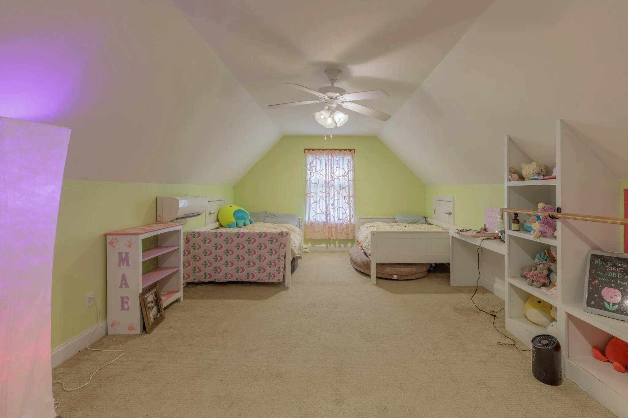 Upstairs, a bonus room over the garage provides versatile space for a home office, playroom, or guest quarters, complete with built-in shelves. The home is equipped with gas heat and a dedicated split unit for the bonus room, along with attic storage for all your needs. The side entry garage (26′ x 27′) offers easy access and ample space.