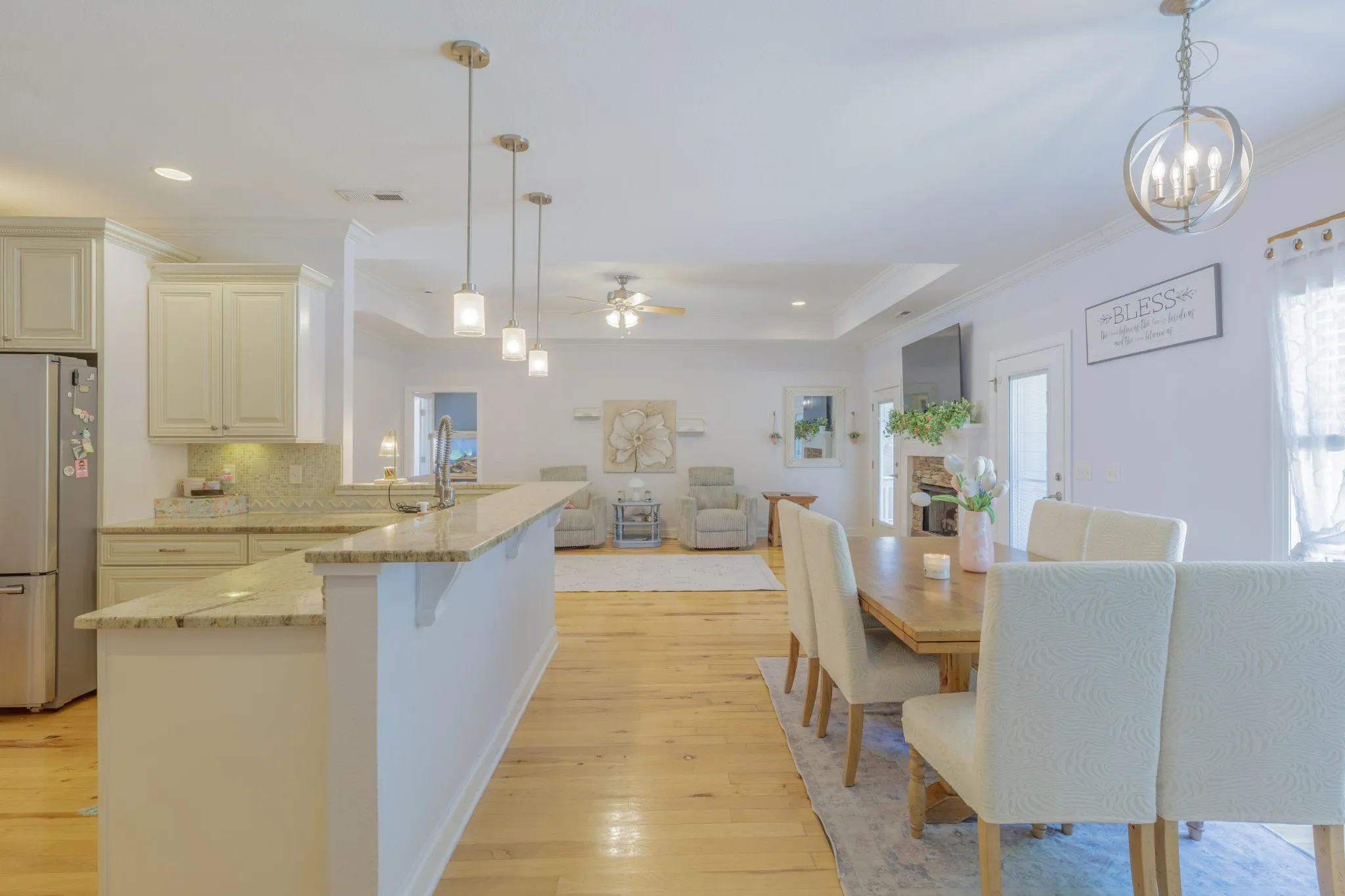 Presenting a beautifully crafted Ranch style residence that blends elegance with modern comfort. Step inside and experience the inviting, open living room, perfect for relaxing evenings or lively gatherings. The centerpiece of the living area is a stunning fireplace with stack stone surround, gas logs, and a hearth, creating a warm and welcoming ambiance.