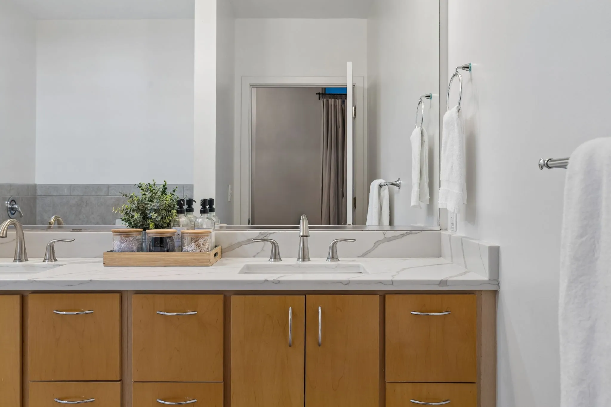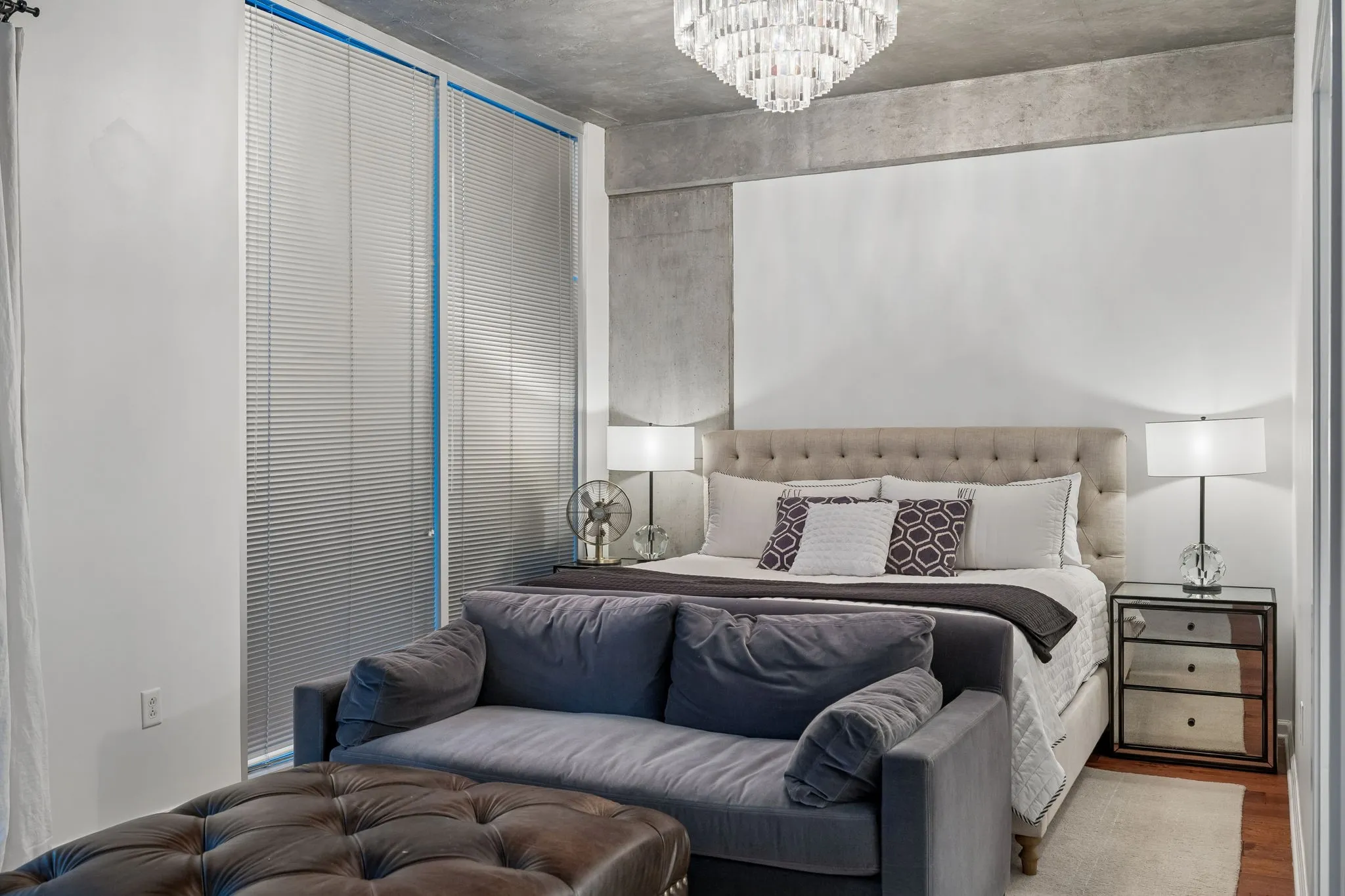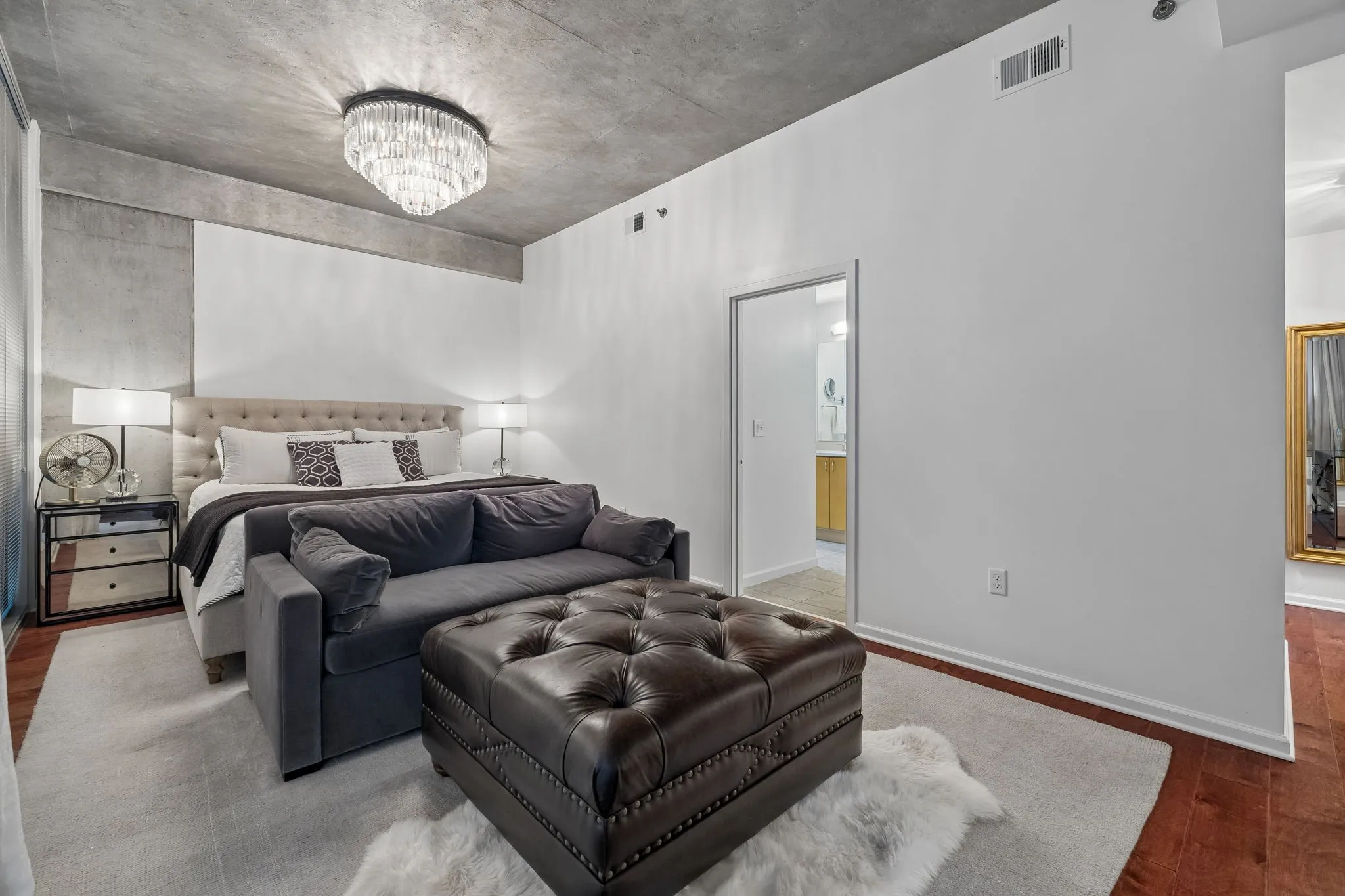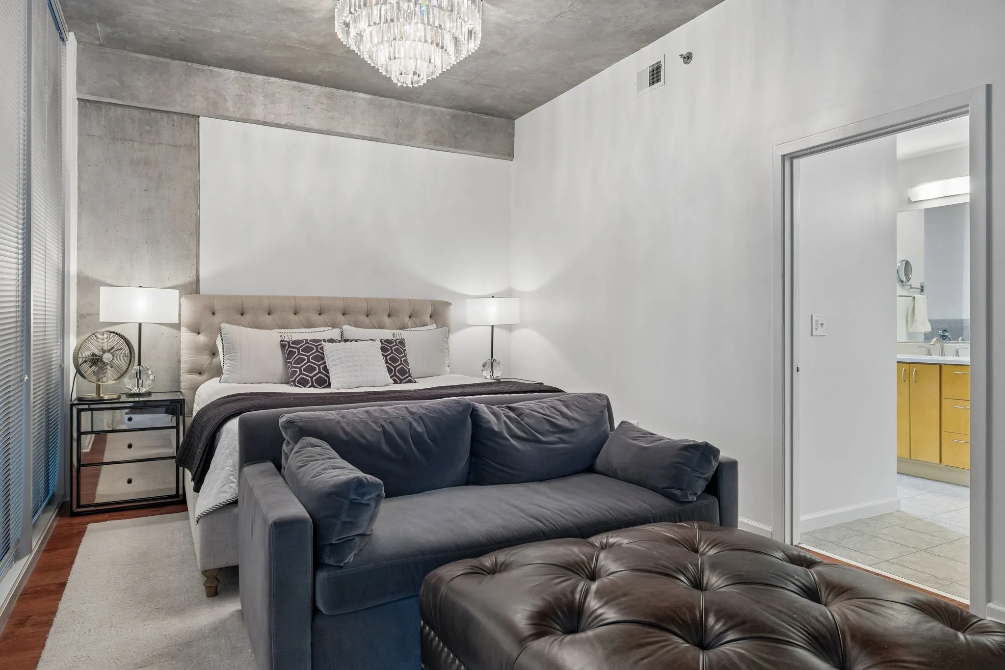 The private primary suite offers a peaceful retreat with beautiful city views and plenty of privacy.