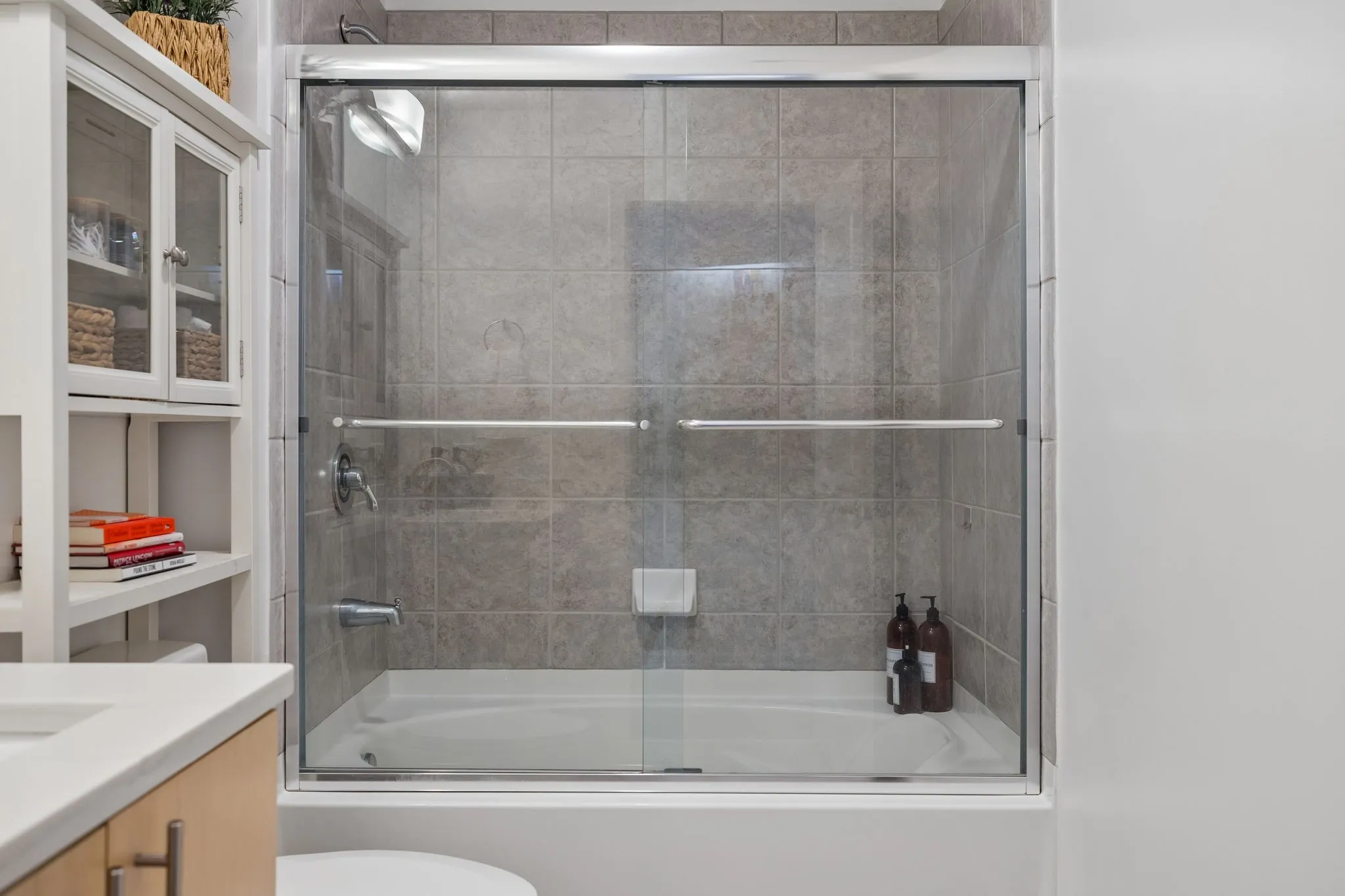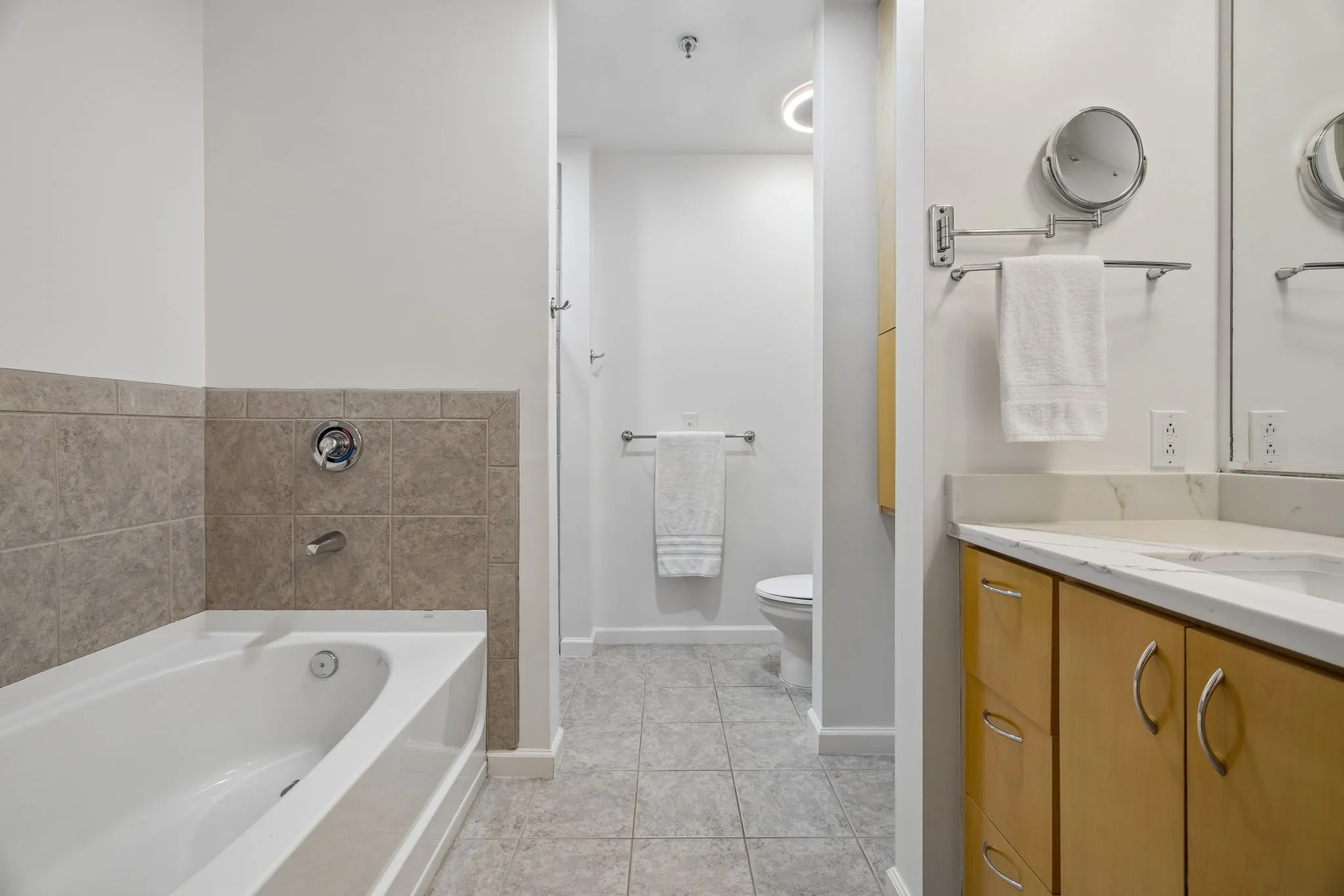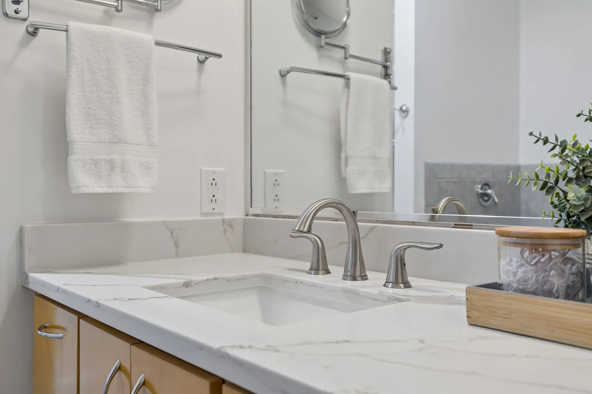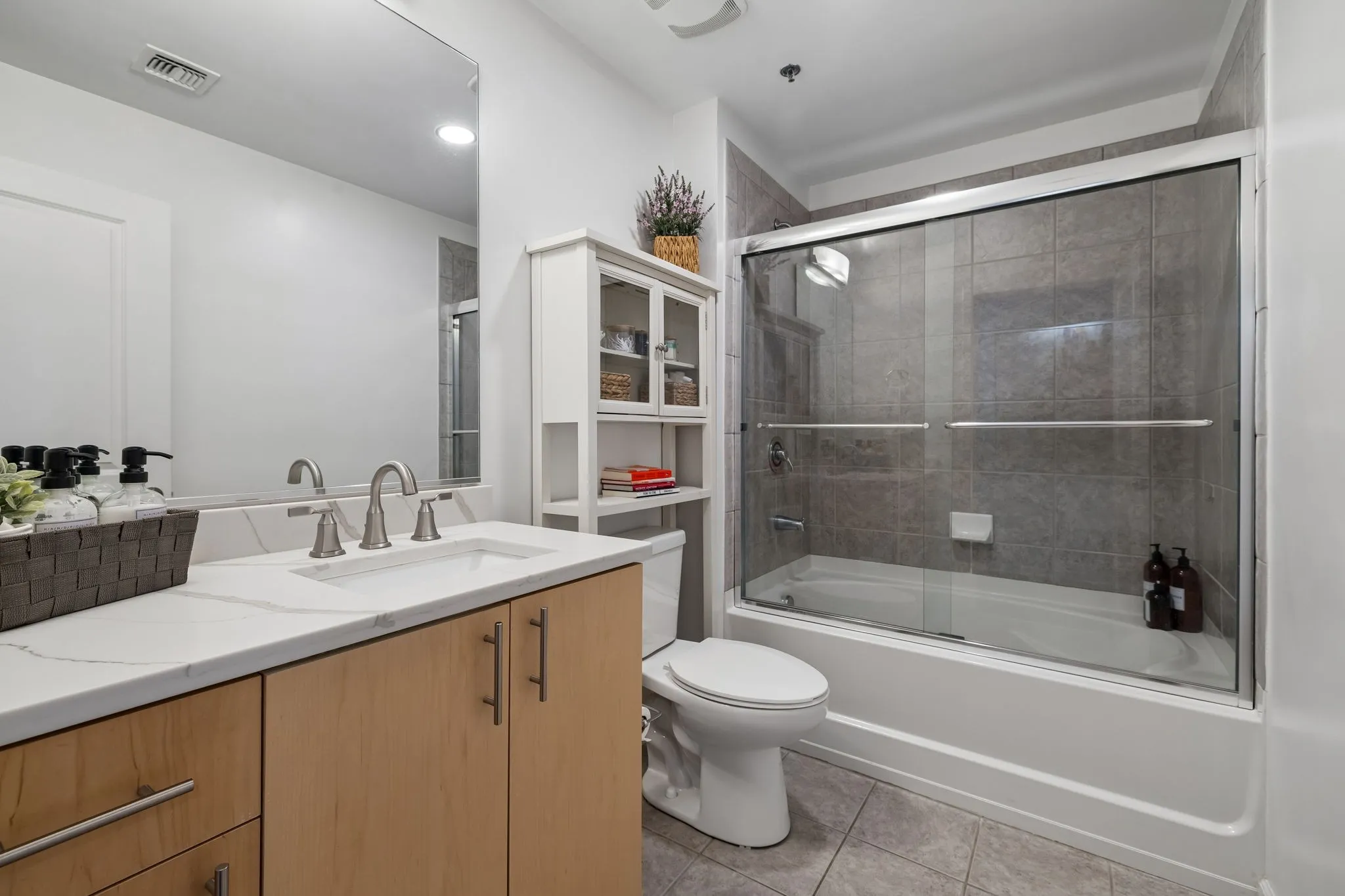 The private primary suite offers a peaceful retreat with beautiful city views and plenty of privacy.