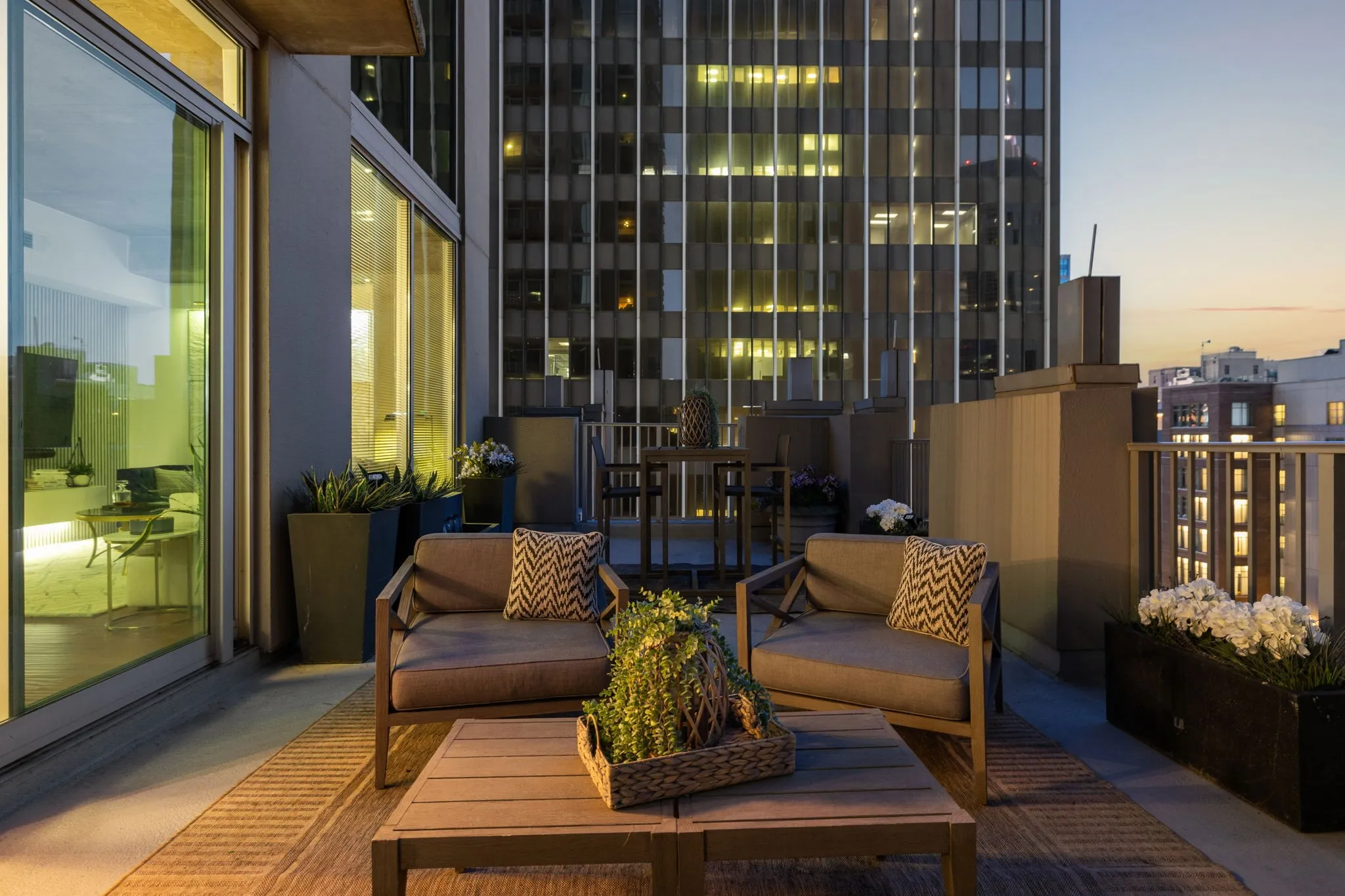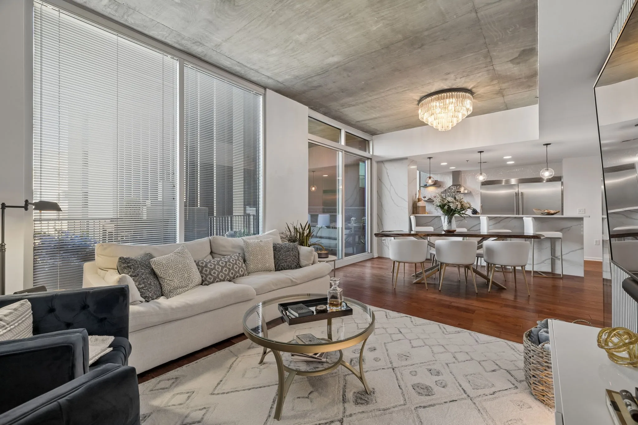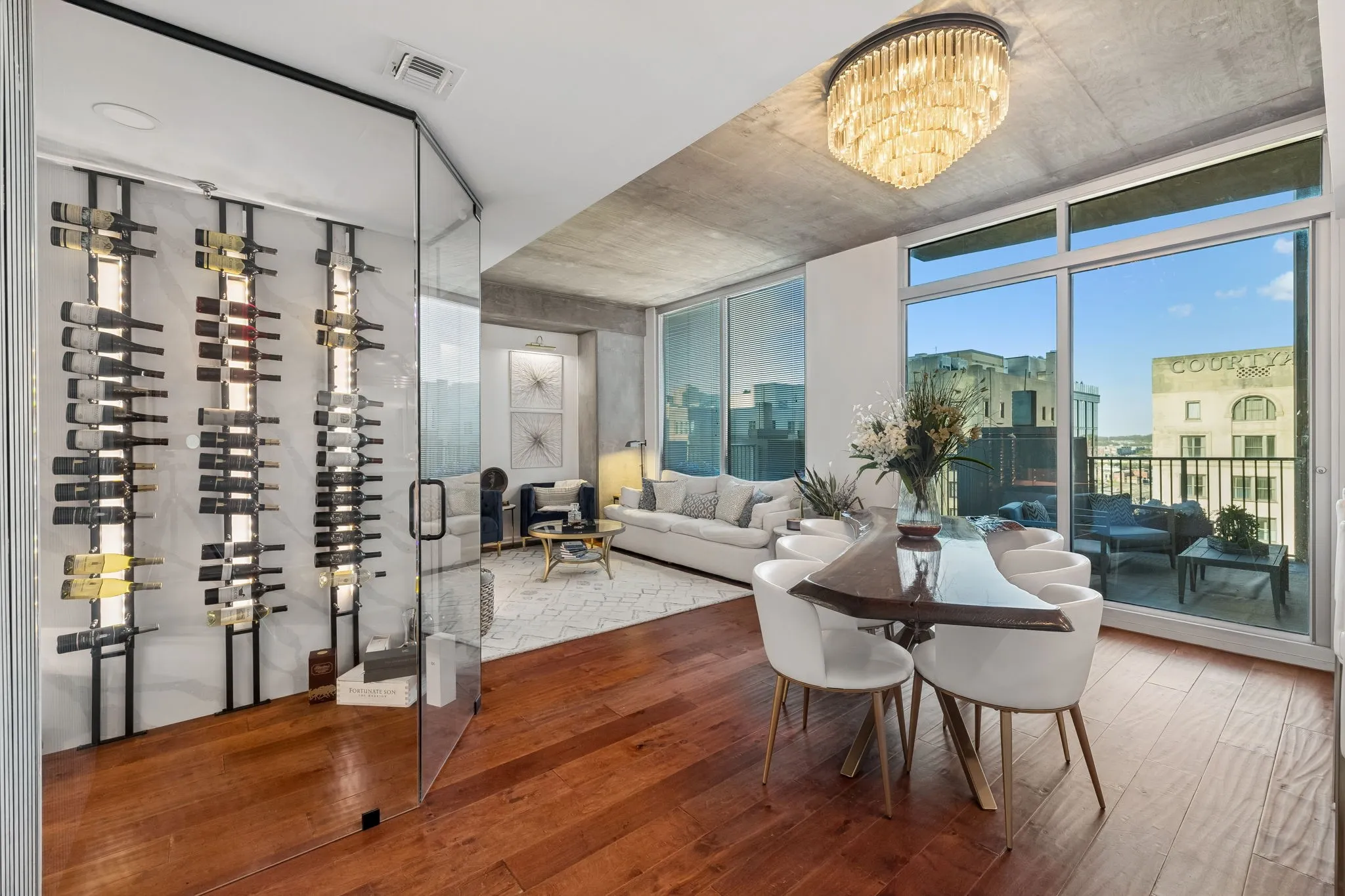 Inside, 10-ft ceilings and floor-to-ceiling windows flood the space with natural light, highlighting the warm, inviting tones throughout. The completely renovated kitchen features granite countertops and high-end stainless steel appliances, flowing seamlessly into a spacious living area designed for both relaxing and entertaining. Enjoy multiple conversation areas, an elegant glass-enclosed wine room, and a generous dining space—all complemented by breathtaking views of the city and Printer’s Alley.